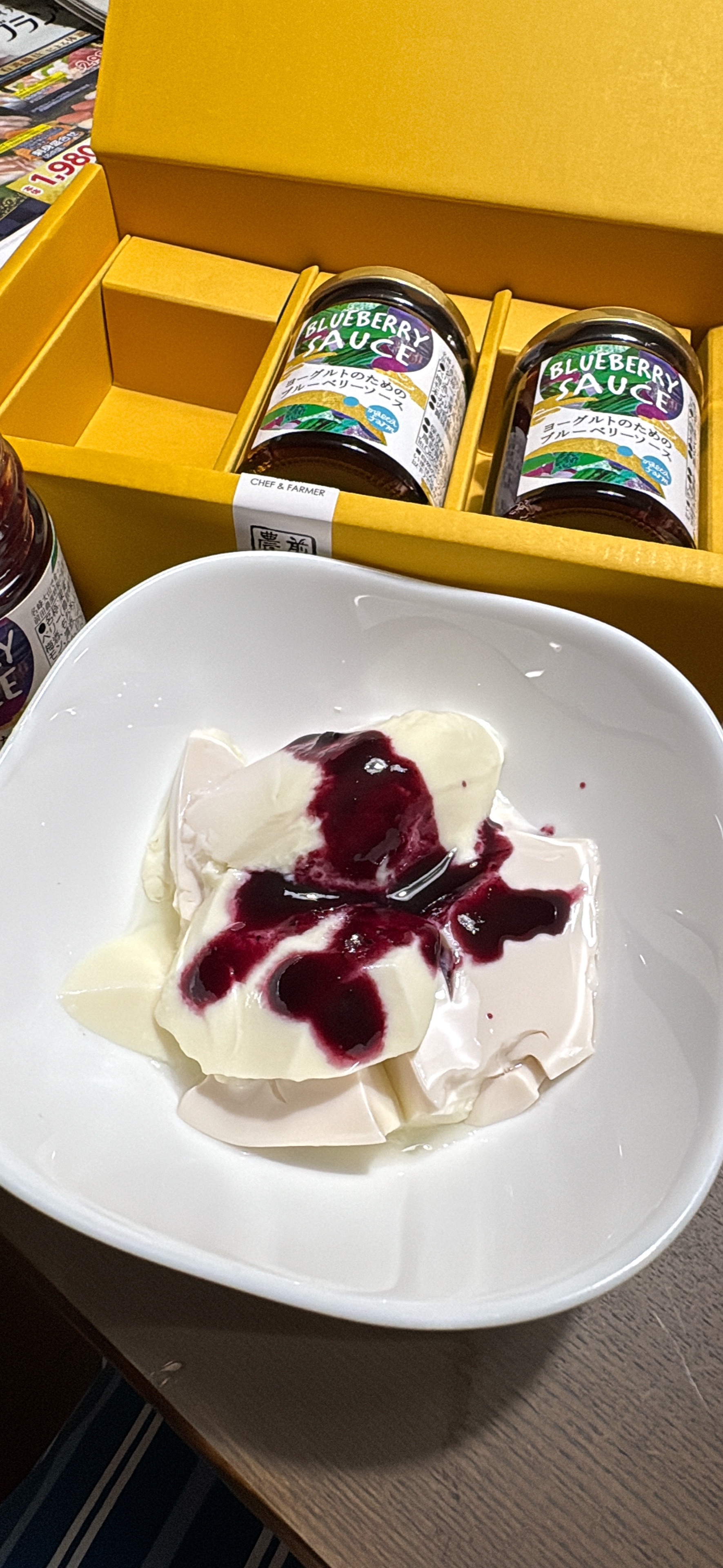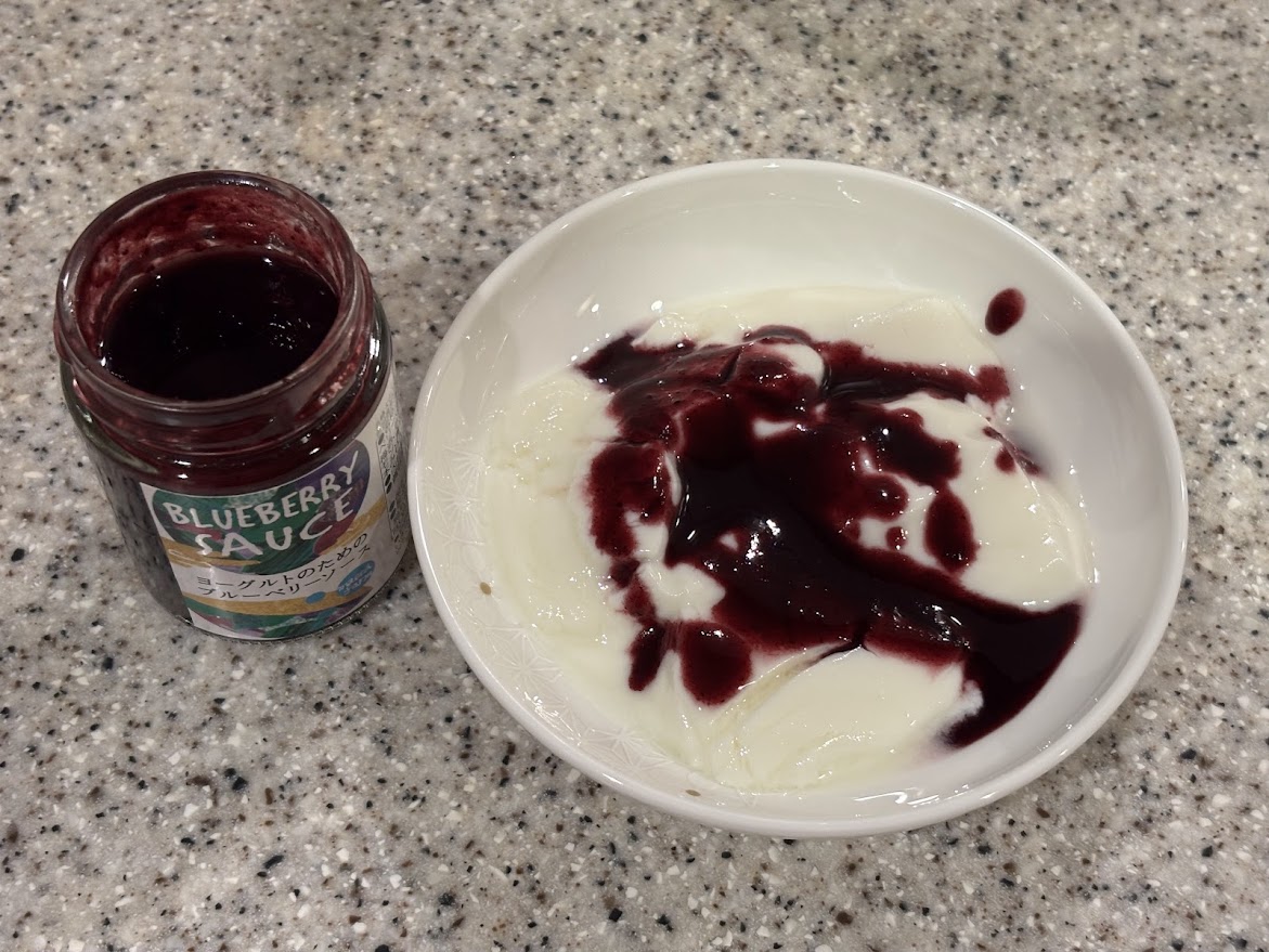 箱を開けると入っているのは瓶詰めされたブルーベリーソース。保存料や着色料は使用されていないということで安心して頂けそうです。早速、ヨーグルトにかけて味わってみることにしました。