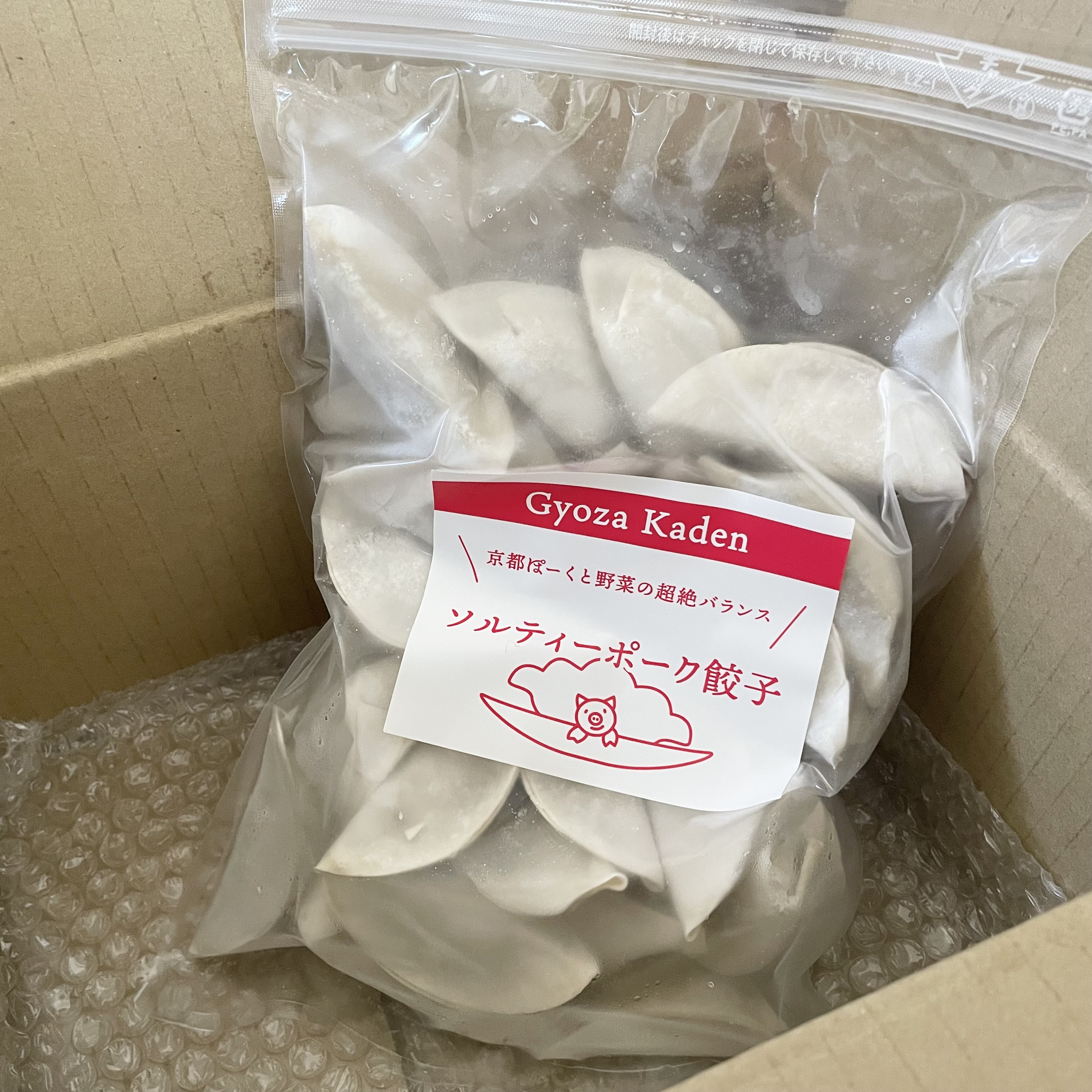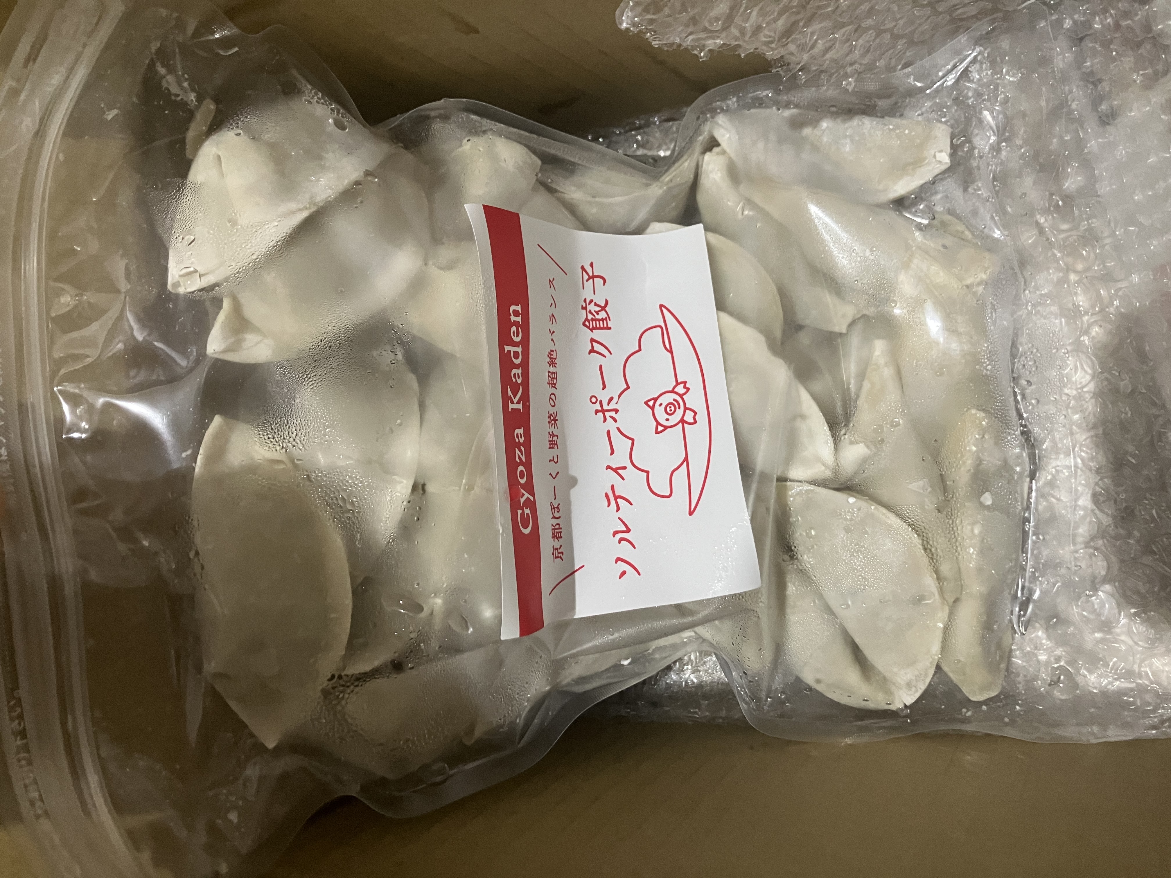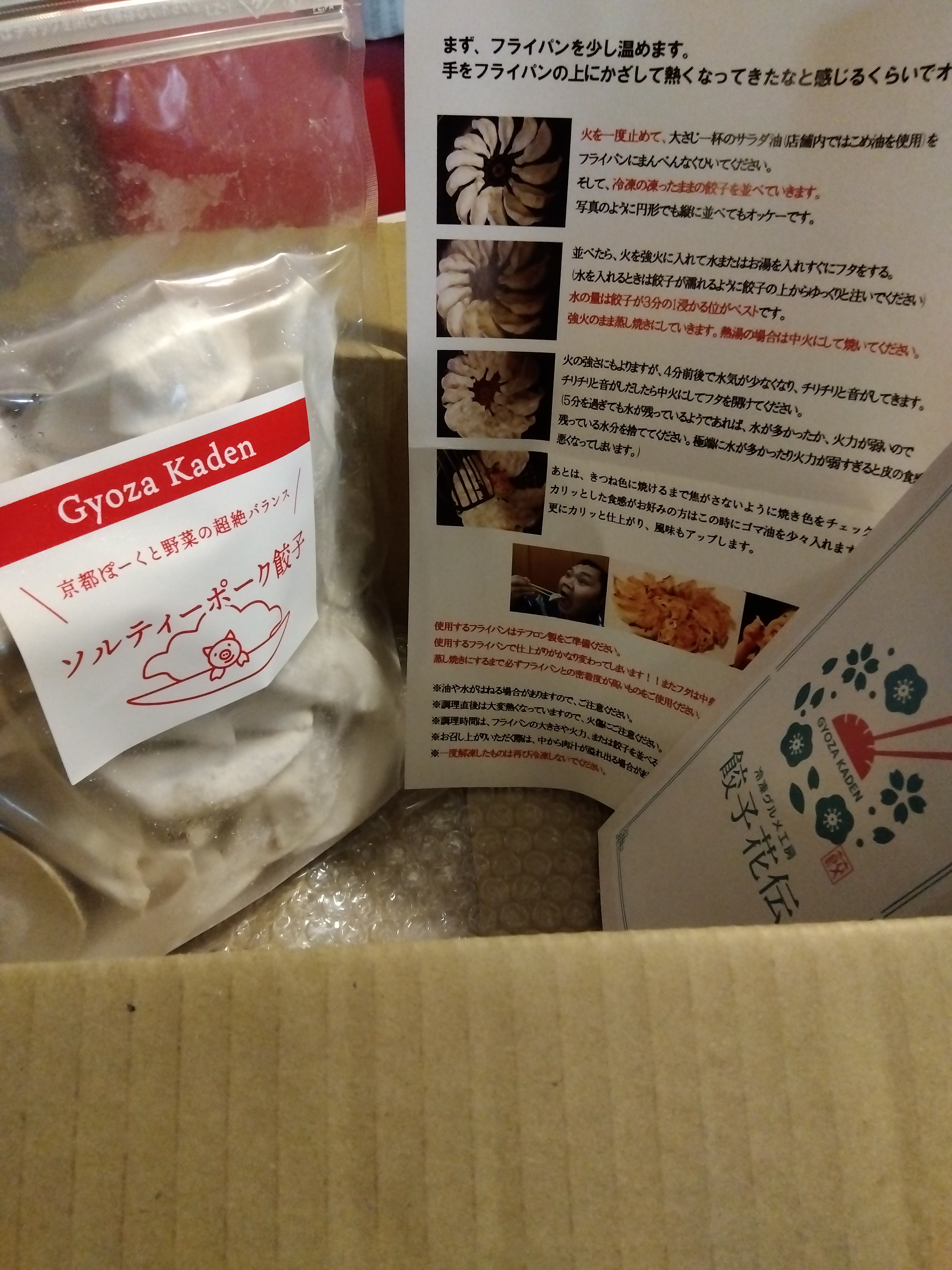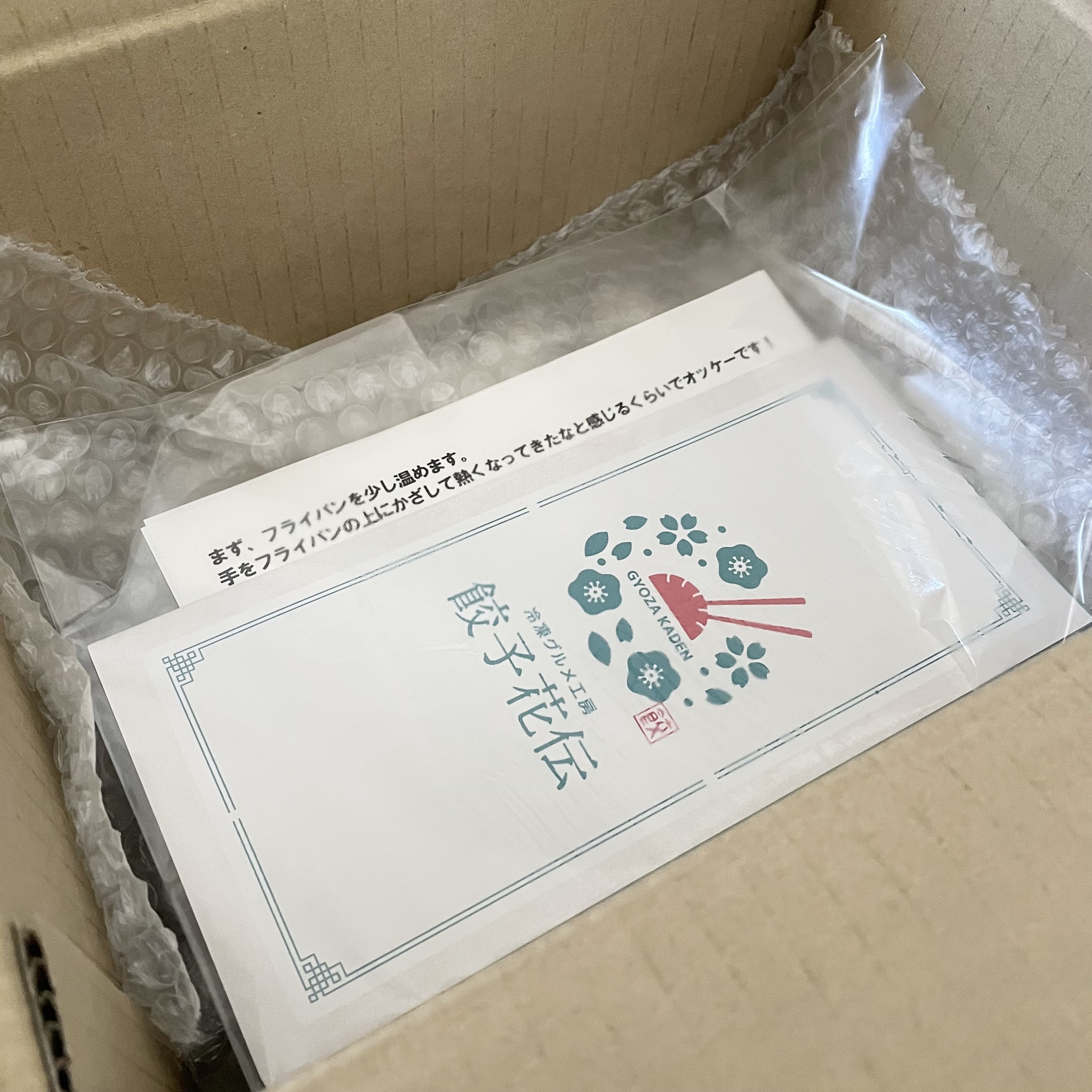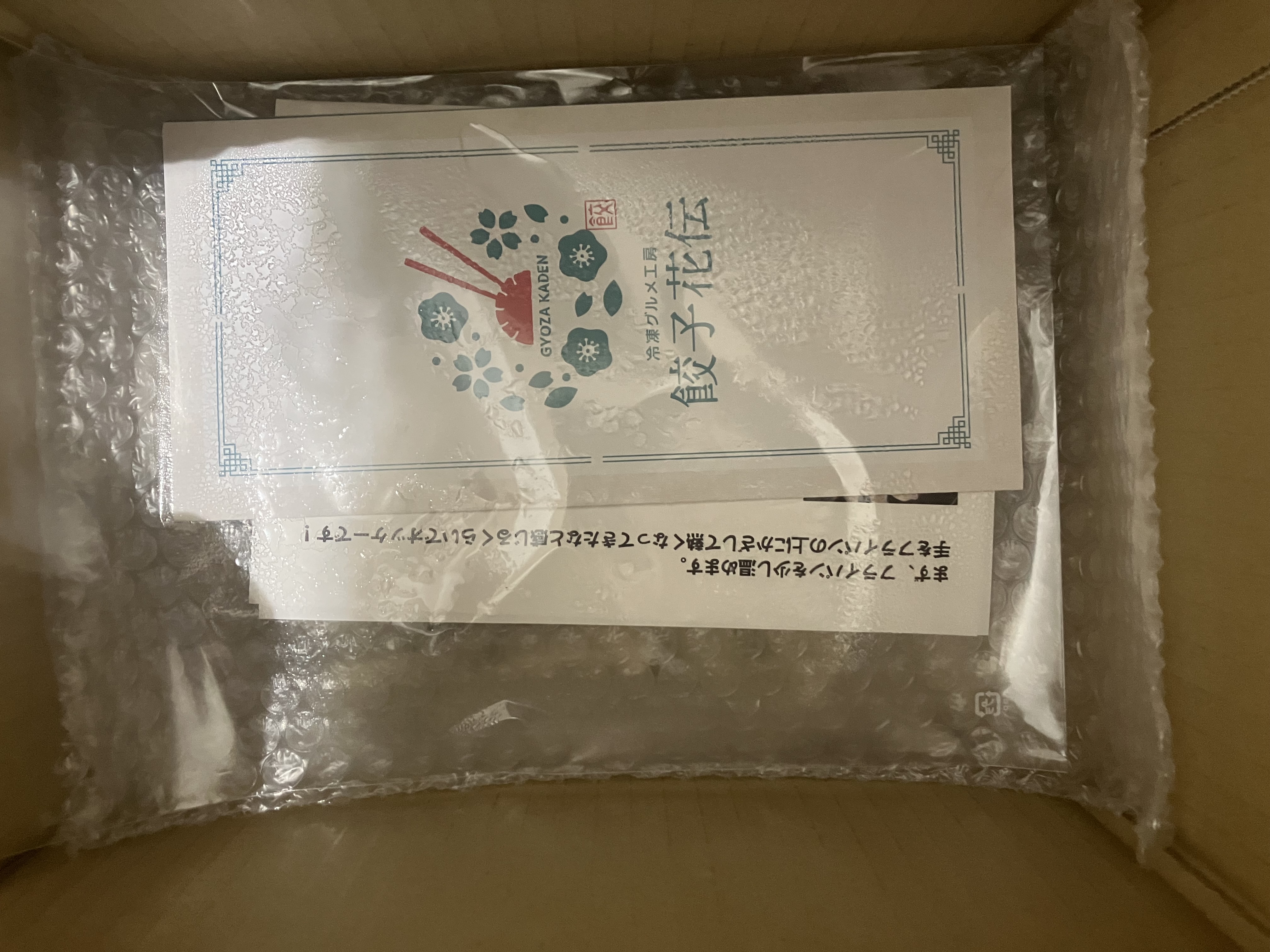 段ボール箱を開けると、透明な袋に入った餃子と食べ方のパンフレットも入っていました。