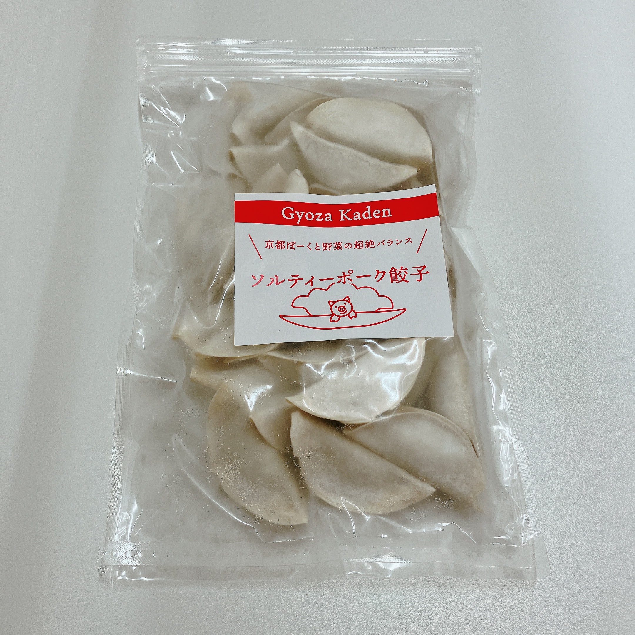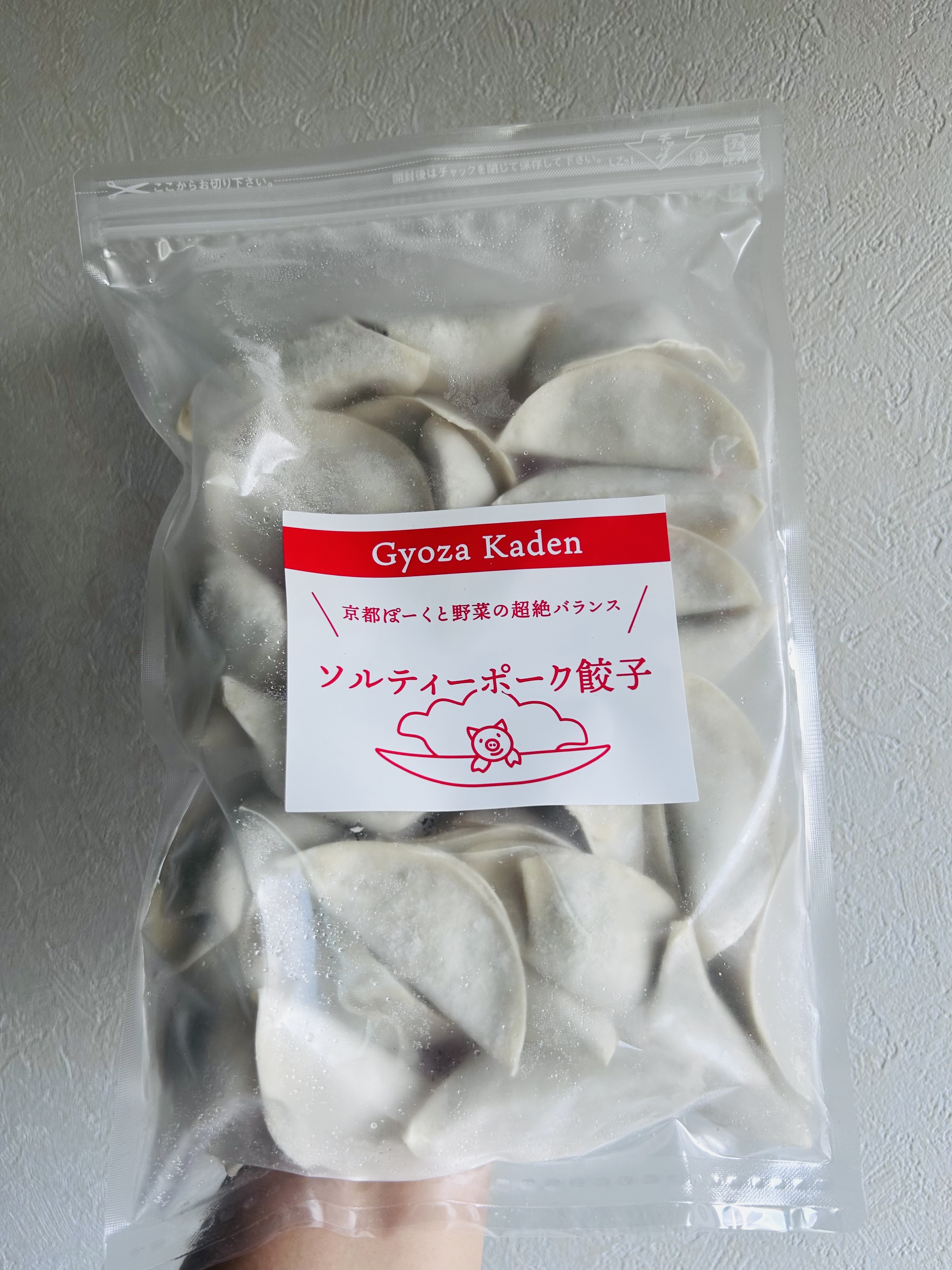 厳選した海塩を使用した「餃子」です。皮の厚みは0.8mm以下で口溶けが良く食べやすく、焼き目はサクッと仕上がり、国産小麦粉本来の味と香りが楽しめます。具には京都ブランドの豚肉を使用し、塩で食材の旨みや甘みを引き出しています。豚肉と野菜類のバランスが良いので、旨み・甘み・香りの余韻が心地よく、タレなしでそのままで食べるのがおすすめ。焼きたてから少し冷めたときまで、温度によって変化する味わいも楽しめます。エコパッケージ入りなので、自宅用におすすめです。
