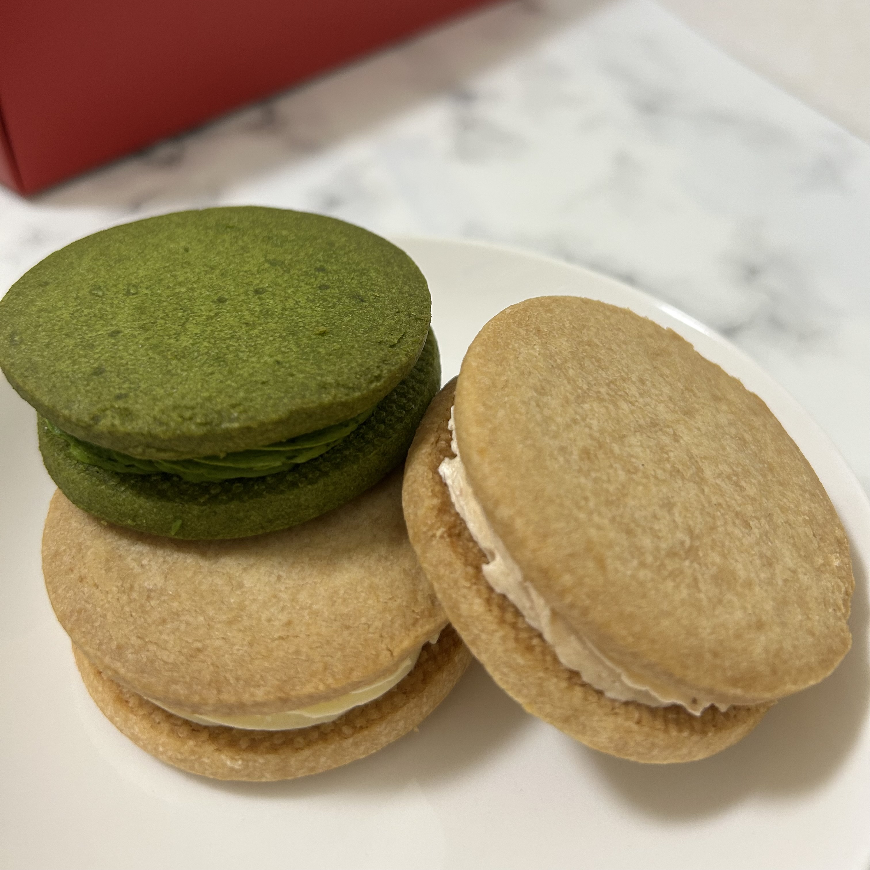 サクッとした食感の塩味のあるクッキー、口の中で溶ける優しい甘さのクリームがよく合います。ひとつで満足感があり、ティータイムにぴったりです。