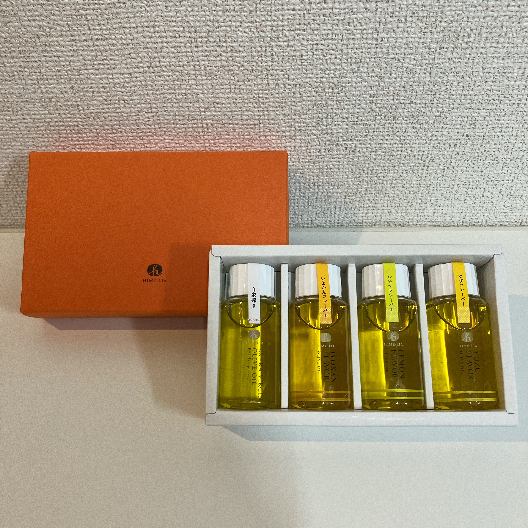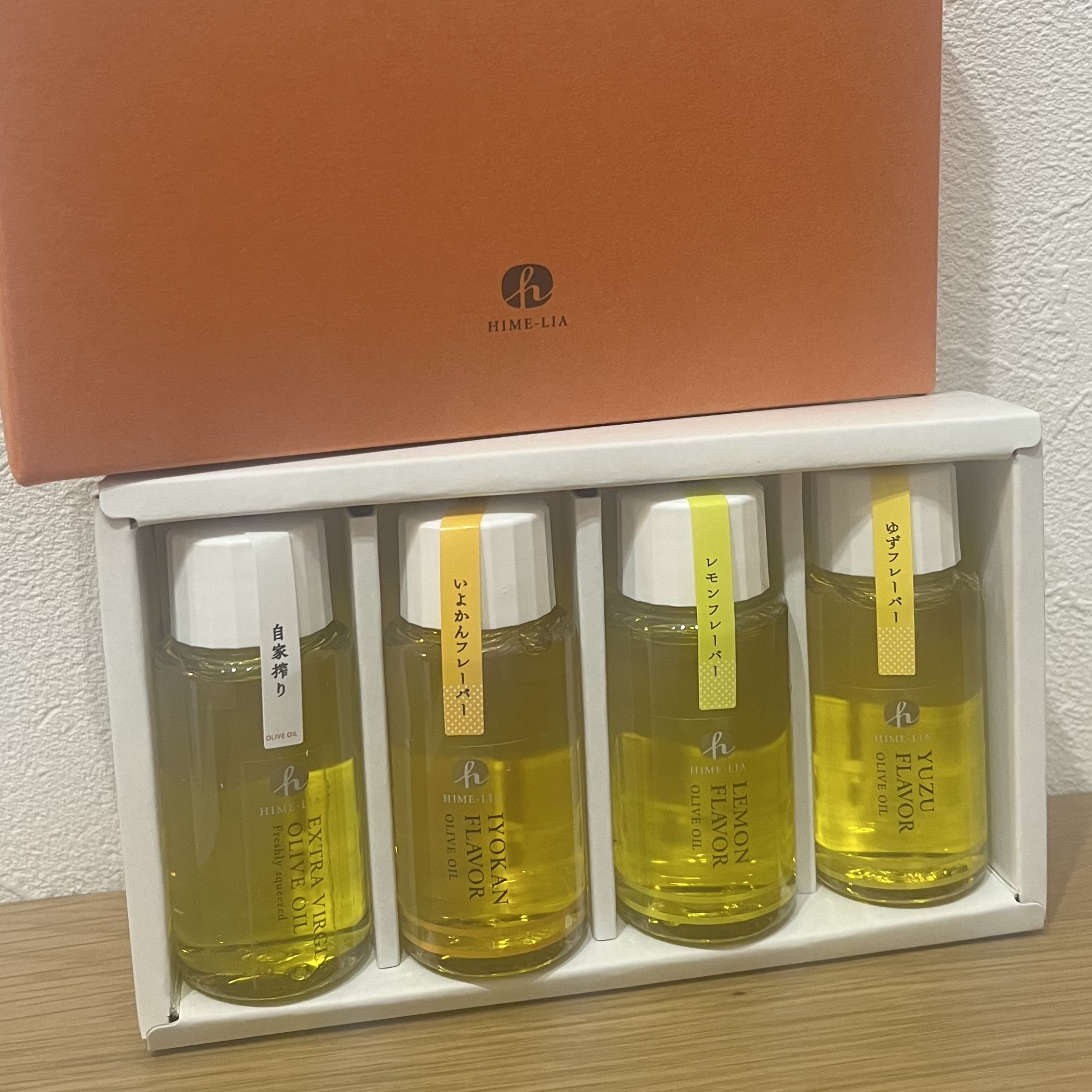 1年中搾りたてを味わえる「オリーブオイル」です。オリーブ果実とその皮だけを丁寧に搾っているため、本物の柑橘の香りを楽しめます。自家搾りの「プレーン」と、エクストラバージンオリーブオイルに柑橘の香りを加えたフレーバーオリーブオイル「イヨカン、レモン、ユズ」3種ののミニセットです。かわいいリボン付きのオレンジ色ボックスに入って届くので。お礼や内祝い、カジュアルな贈り物など、さまざまなシーンで利用できます。