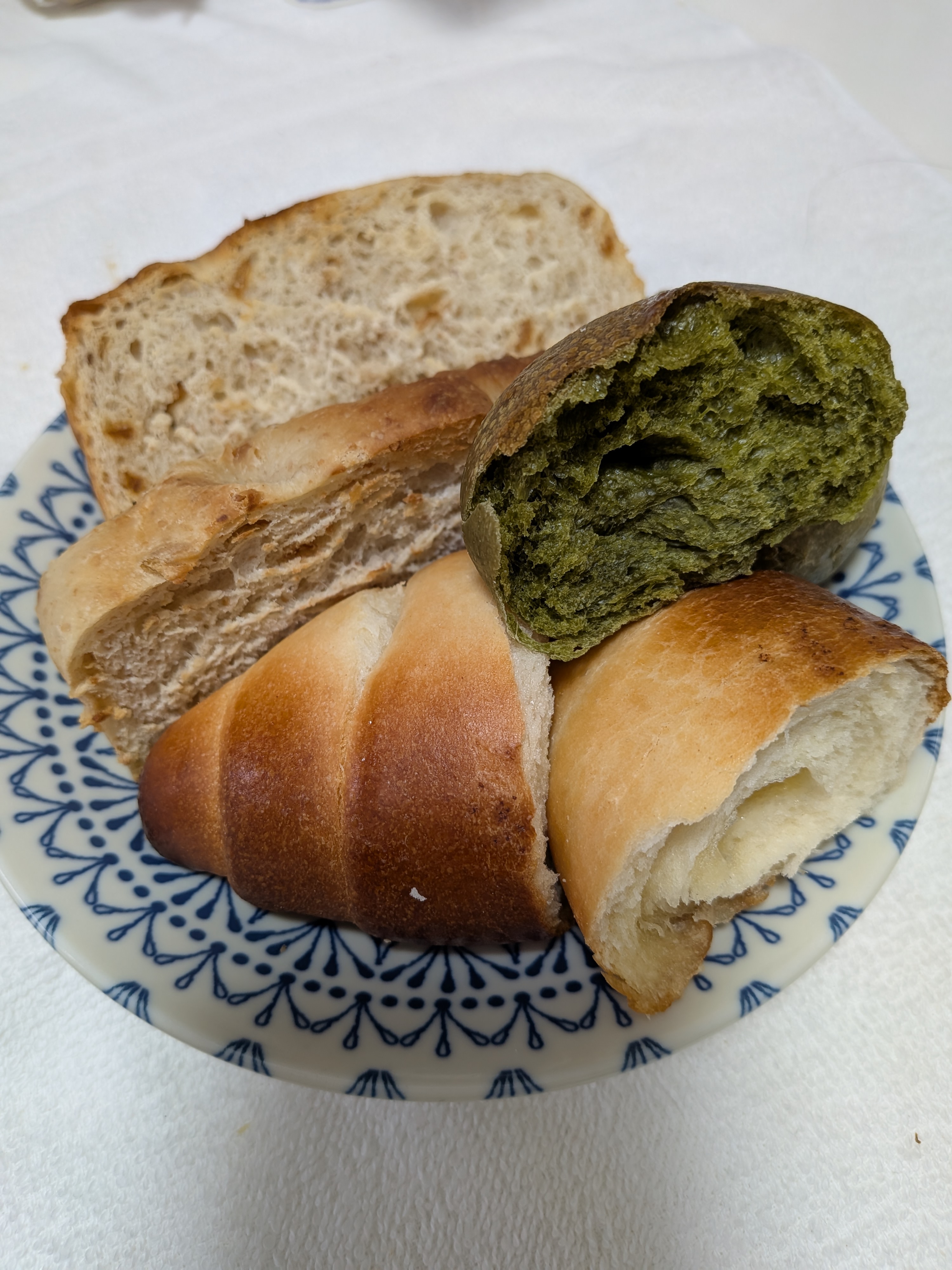抹茶を思わせる色ですが、ほんのりですがほうれん草の香りがして、体によさそうなパンです。