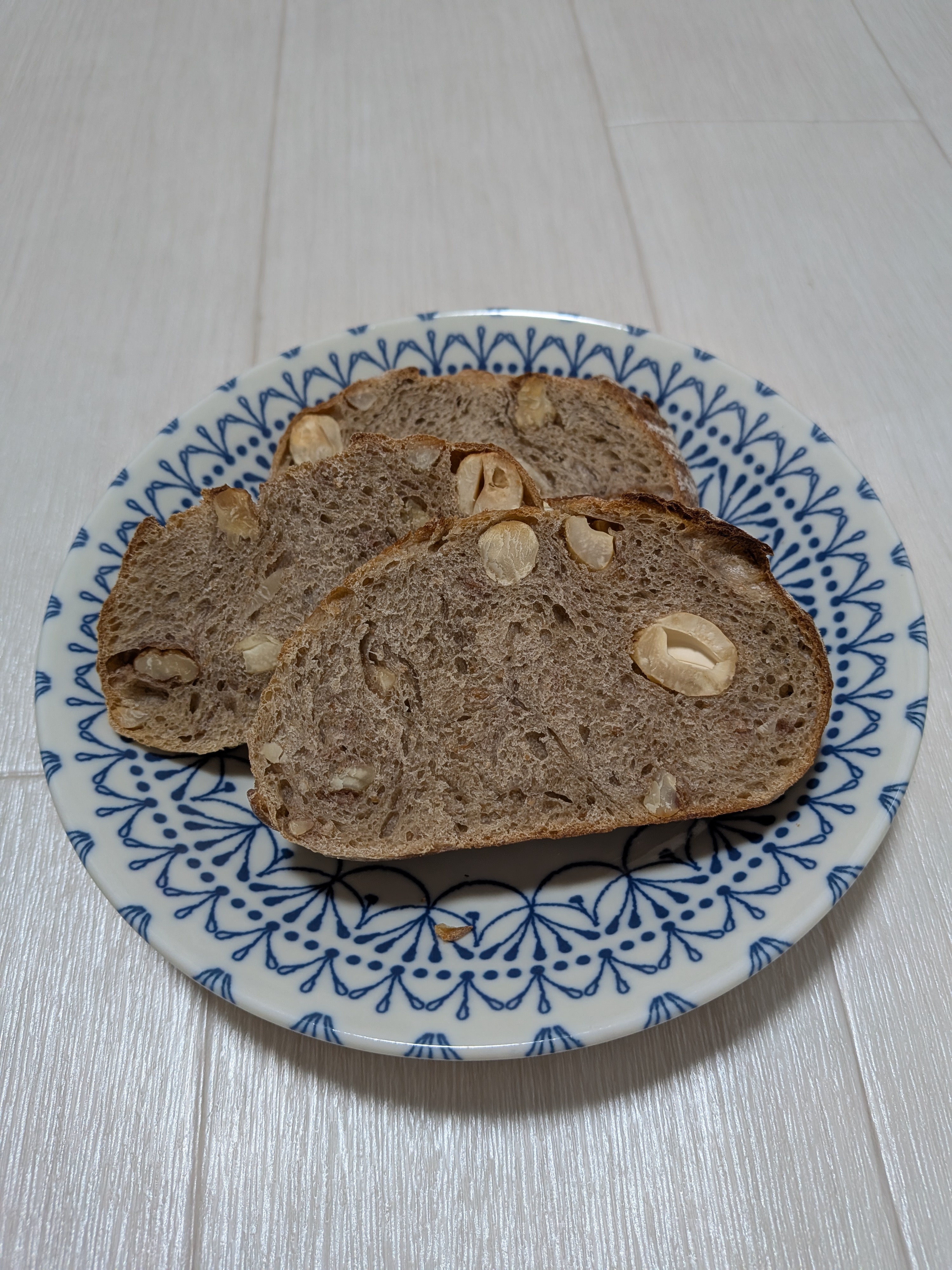 くるみ、アーモンド、カシューナッツ、ヘーゼルナッツとナッツの王道が全て入ってる夢のようなカンパーニュ。どこを食べてもナッツにあたり、それぞれのナッツの食感や味が違うので口の中が楽しくなります。見た目も質感も、本当にリッチです。