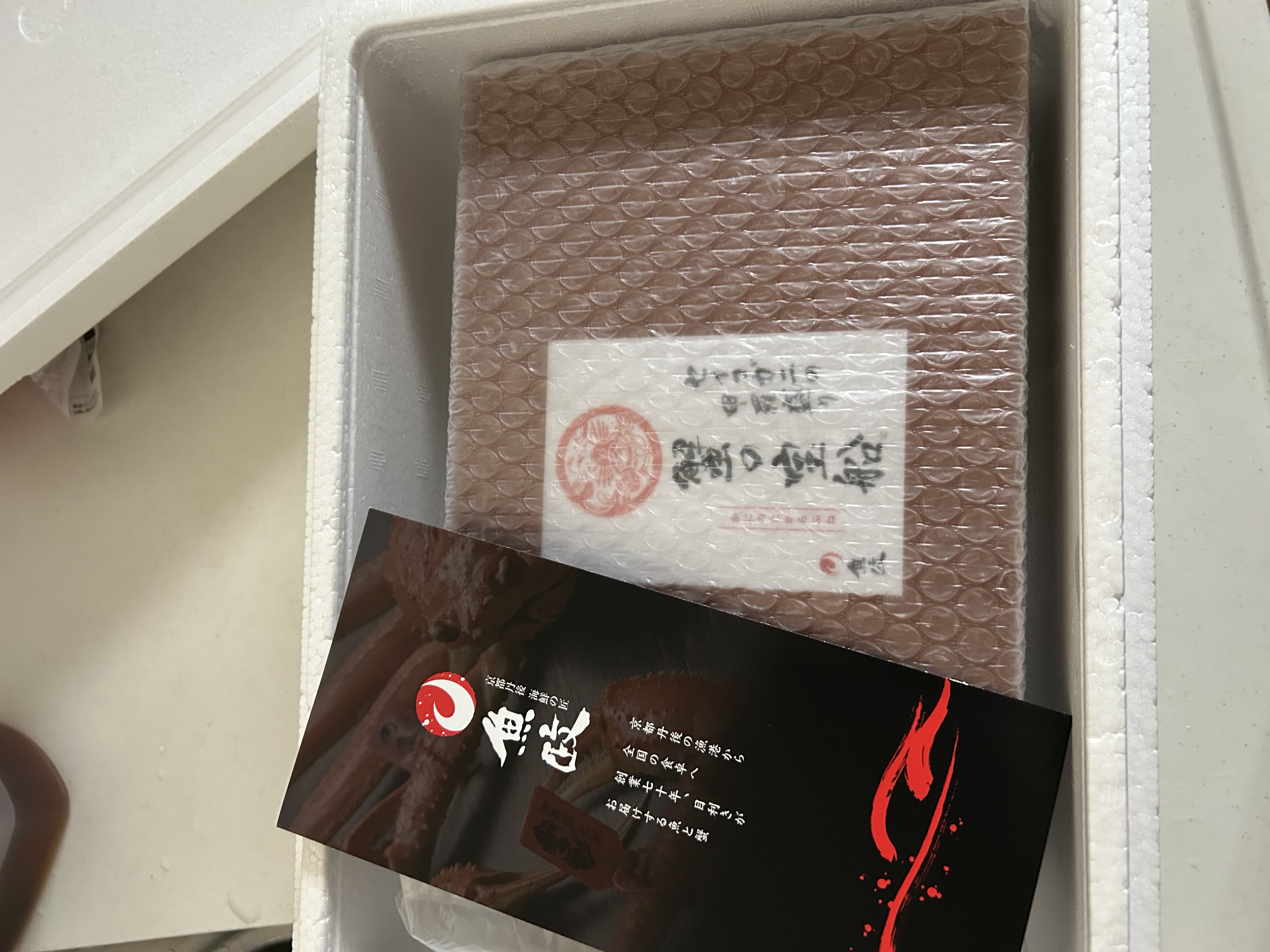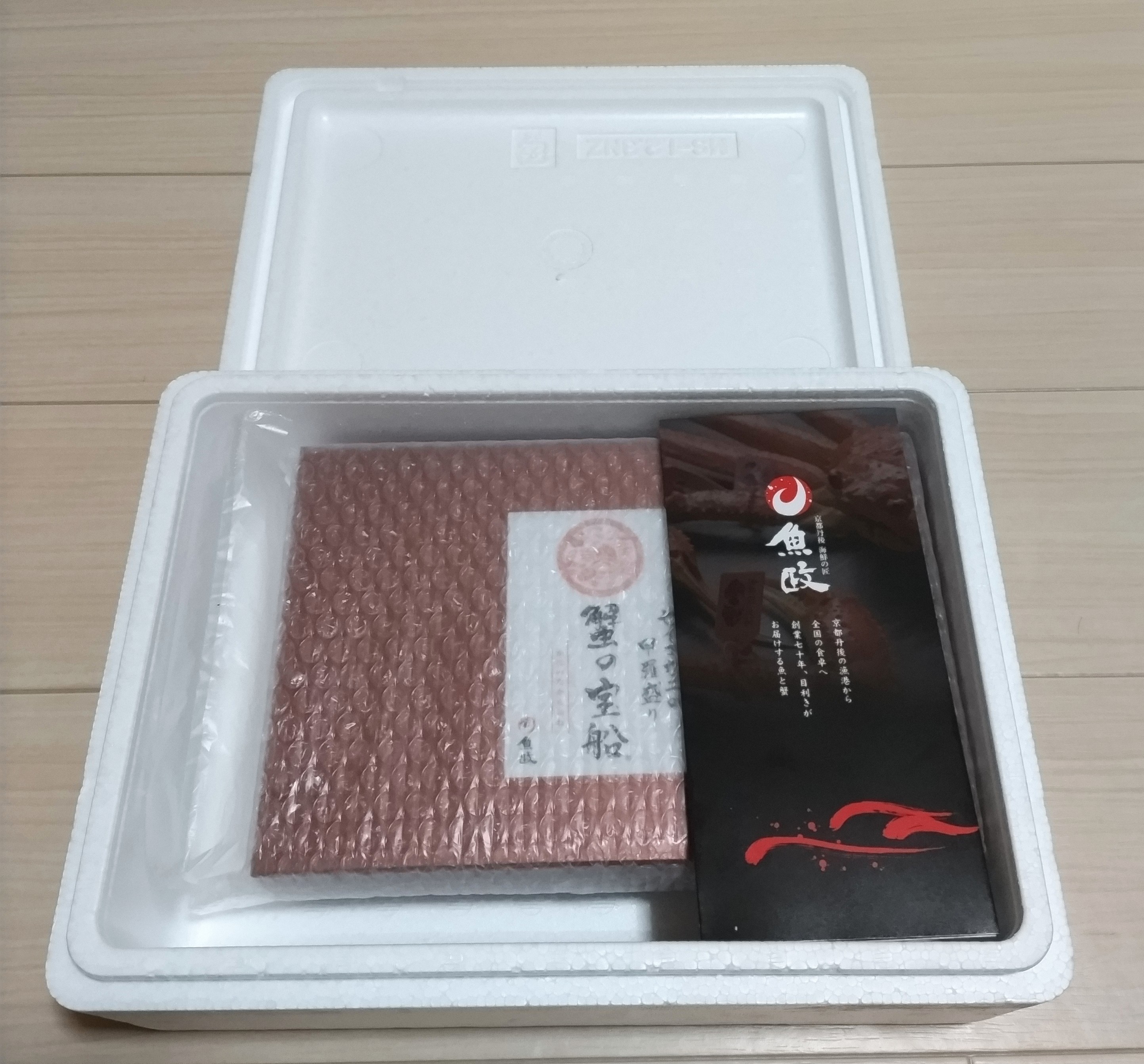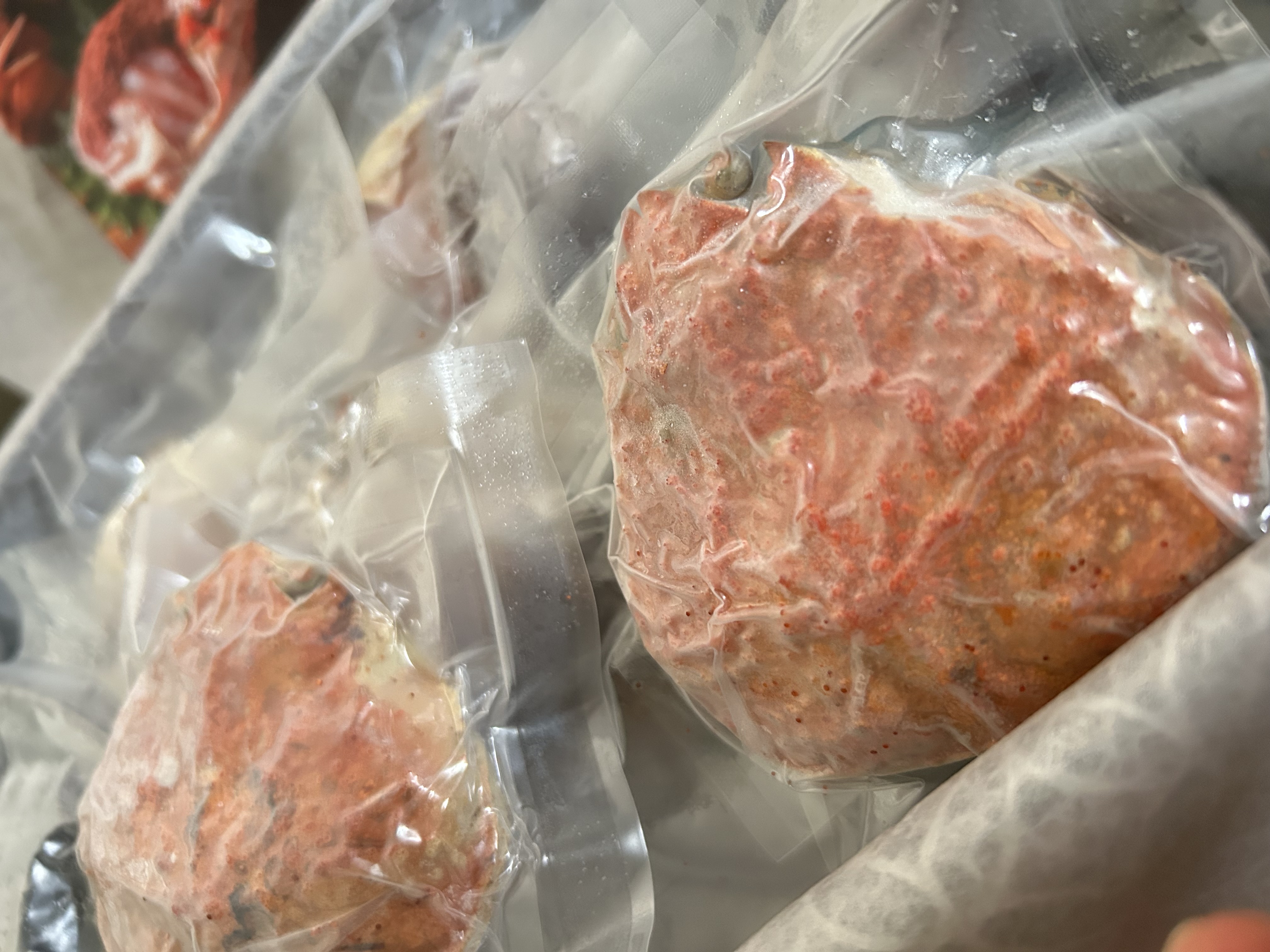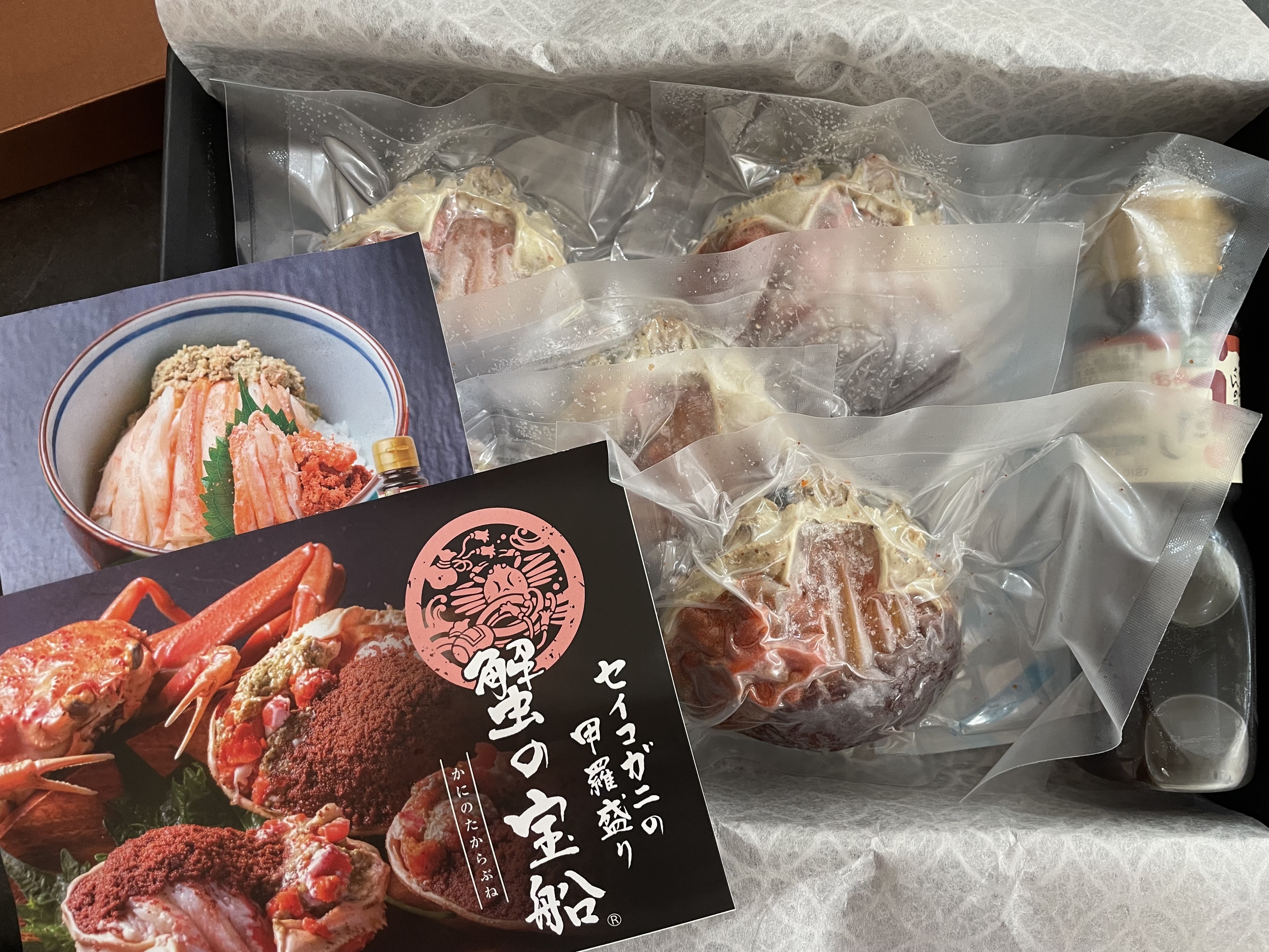 商品到着時、香箱ガニは冷凍の真空パックで届きます。パックを開けてラップをかけ、冷蔵庫で一晩解凍すれば食べられます。