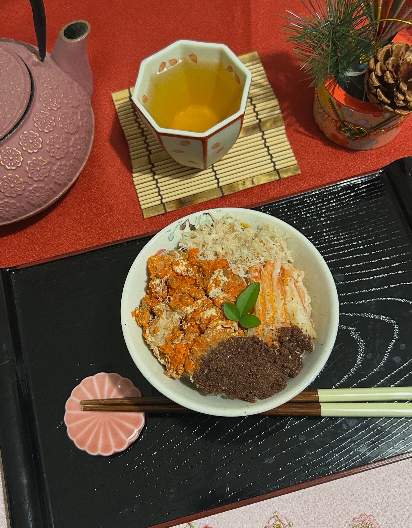 酢飯の上に紫蘇をのせ、その上に部位ごとにカニの身をのせ、商品についているだし醤油をかけて終了。