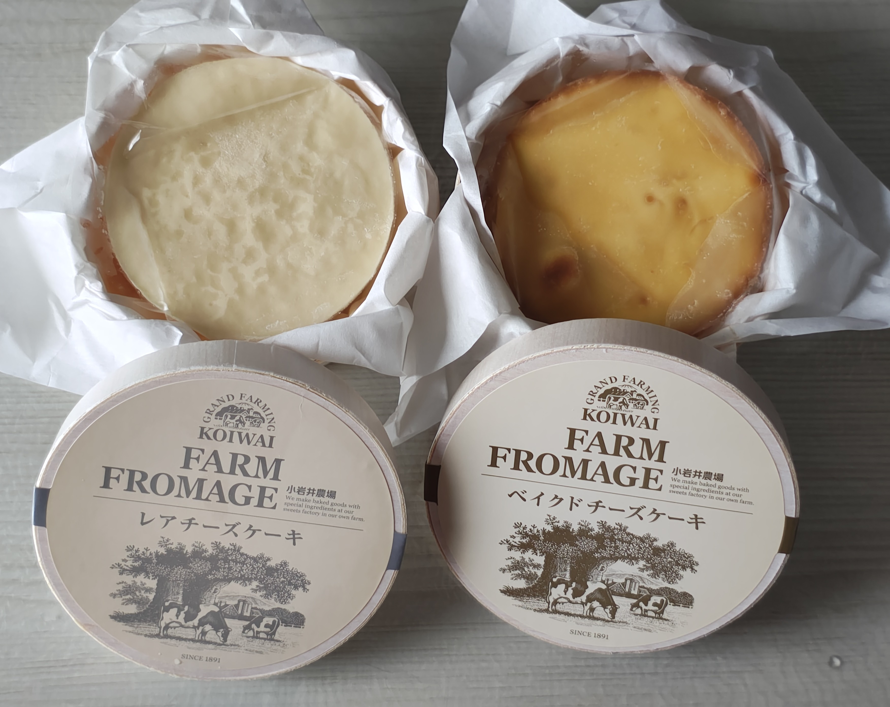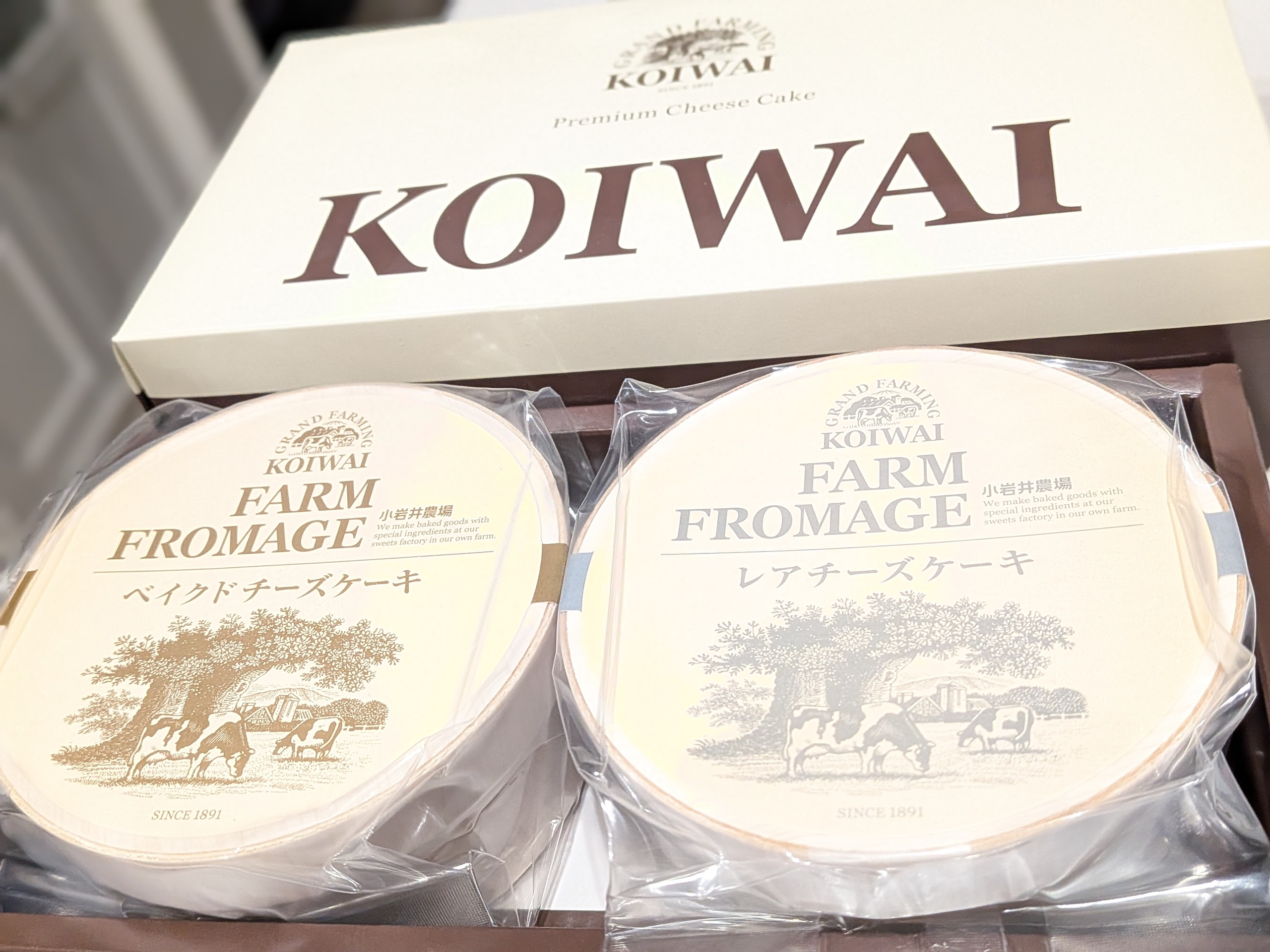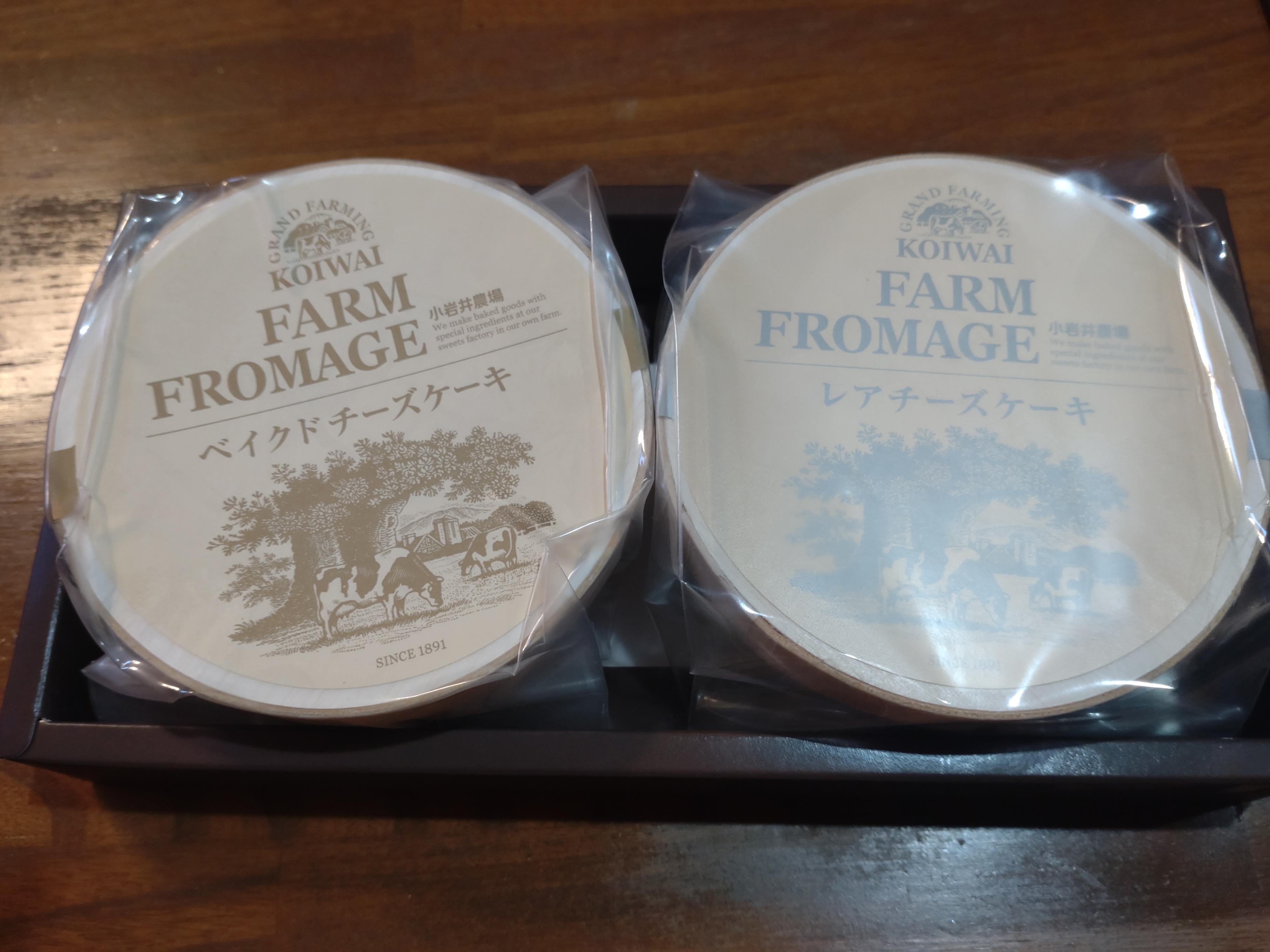 段ボールの中に、小岩井農場のおしゃれなボックスがあり、その中に、レアチーズケーキが入った木箱と、ベイクドチーズケーキが入った木箱がありました。