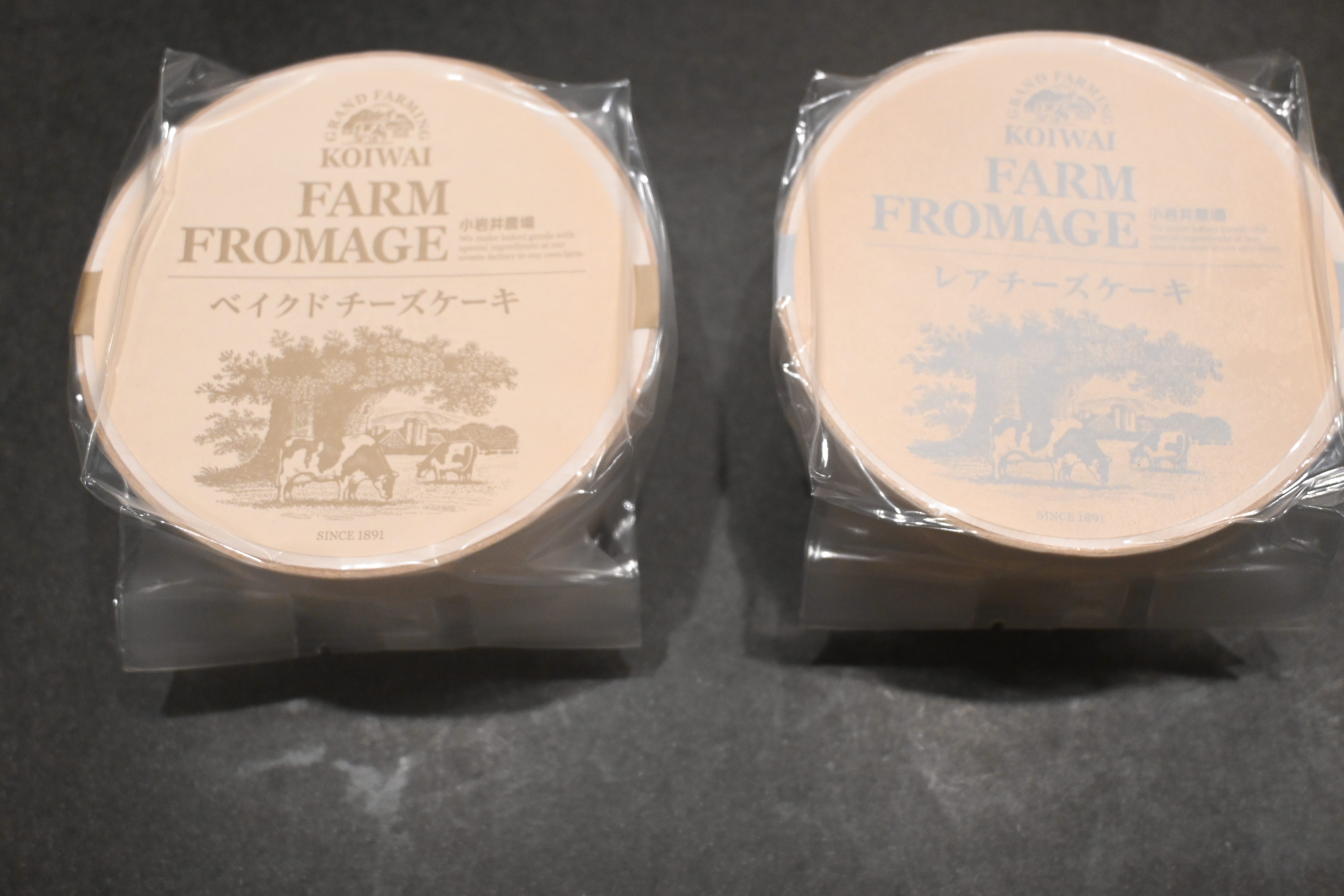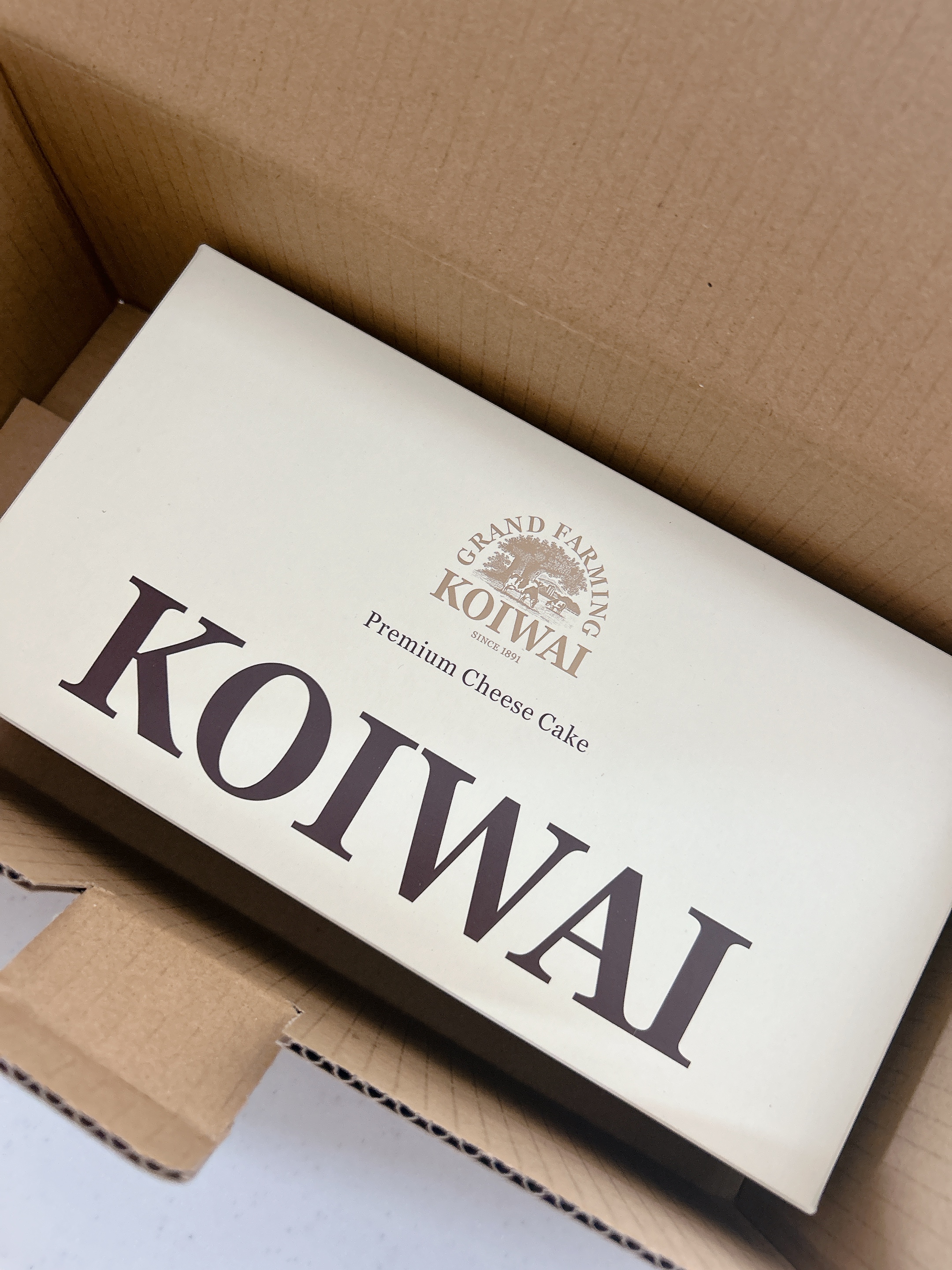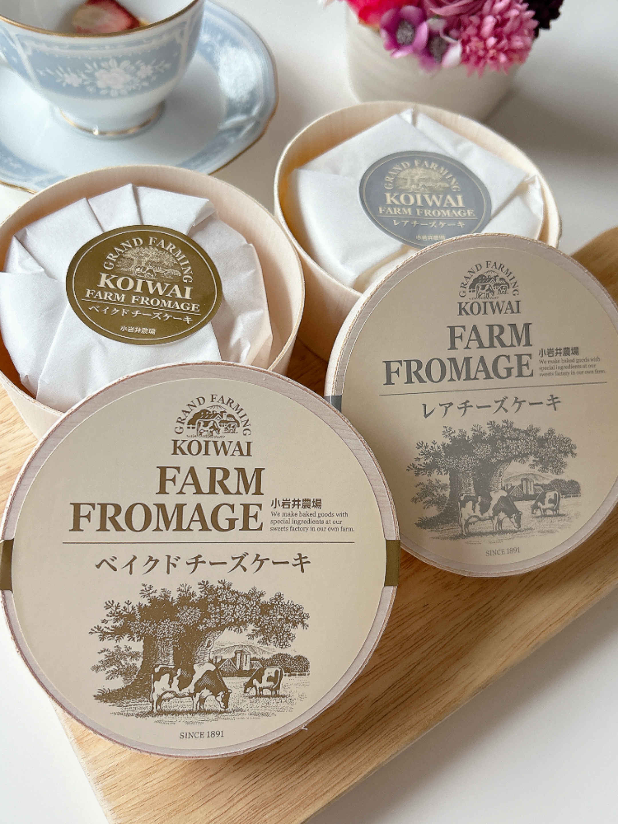 段ボールの中に、小岩井農場のおしゃれなボックスがあり、その中に、レアチーズケーキが入った木箱と、ベイクドチーズケーキが入った木箱がありました。