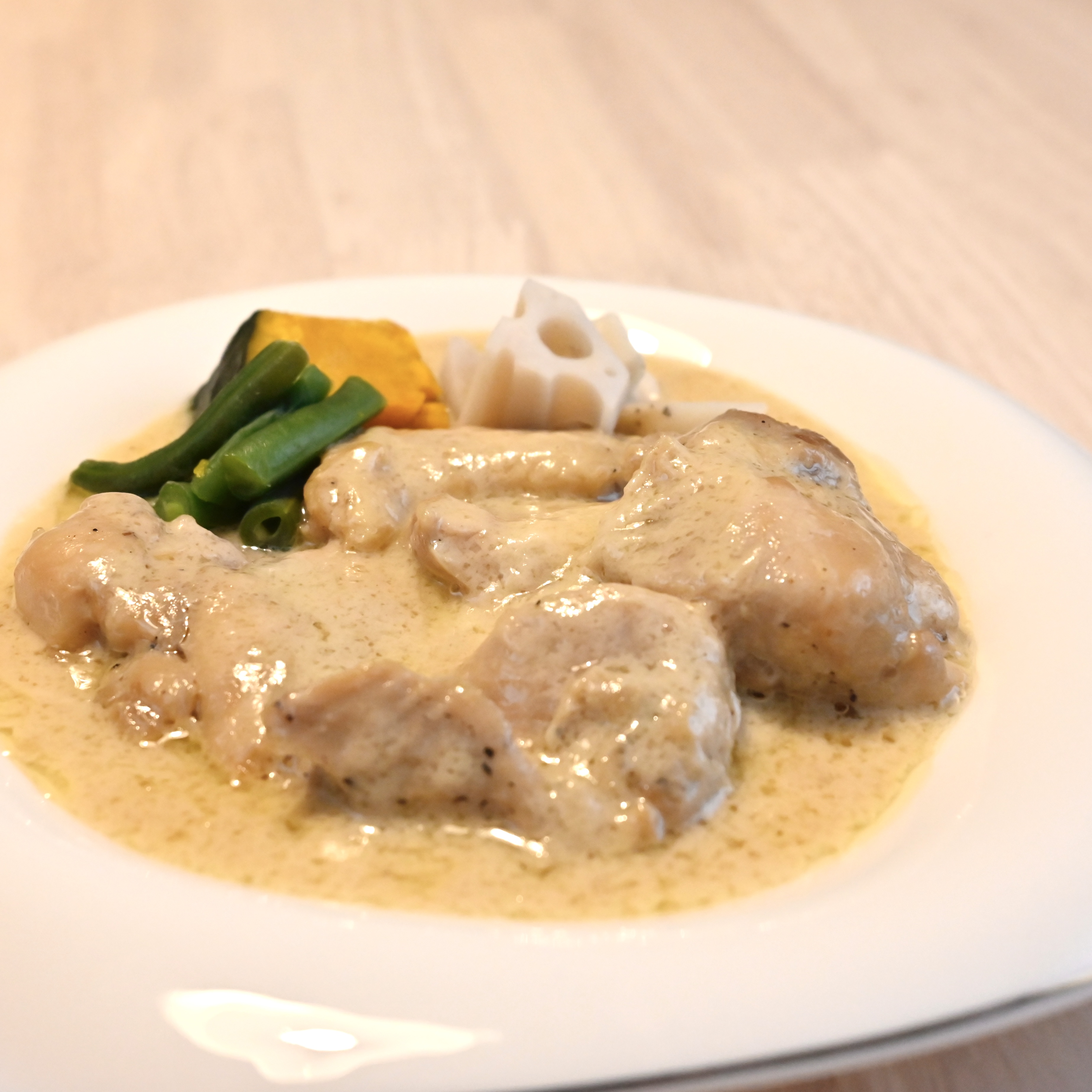 生クリームの感じが強いクリームではなく、コンソメなどの味わいもありより本格的な味。鶏肉はボリュームがあり柔らかく仕上がっています。クリームとの相性も抜群。こちらにも付け合わせの野菜が入っており、ソースにも合っていて美味しかったです。