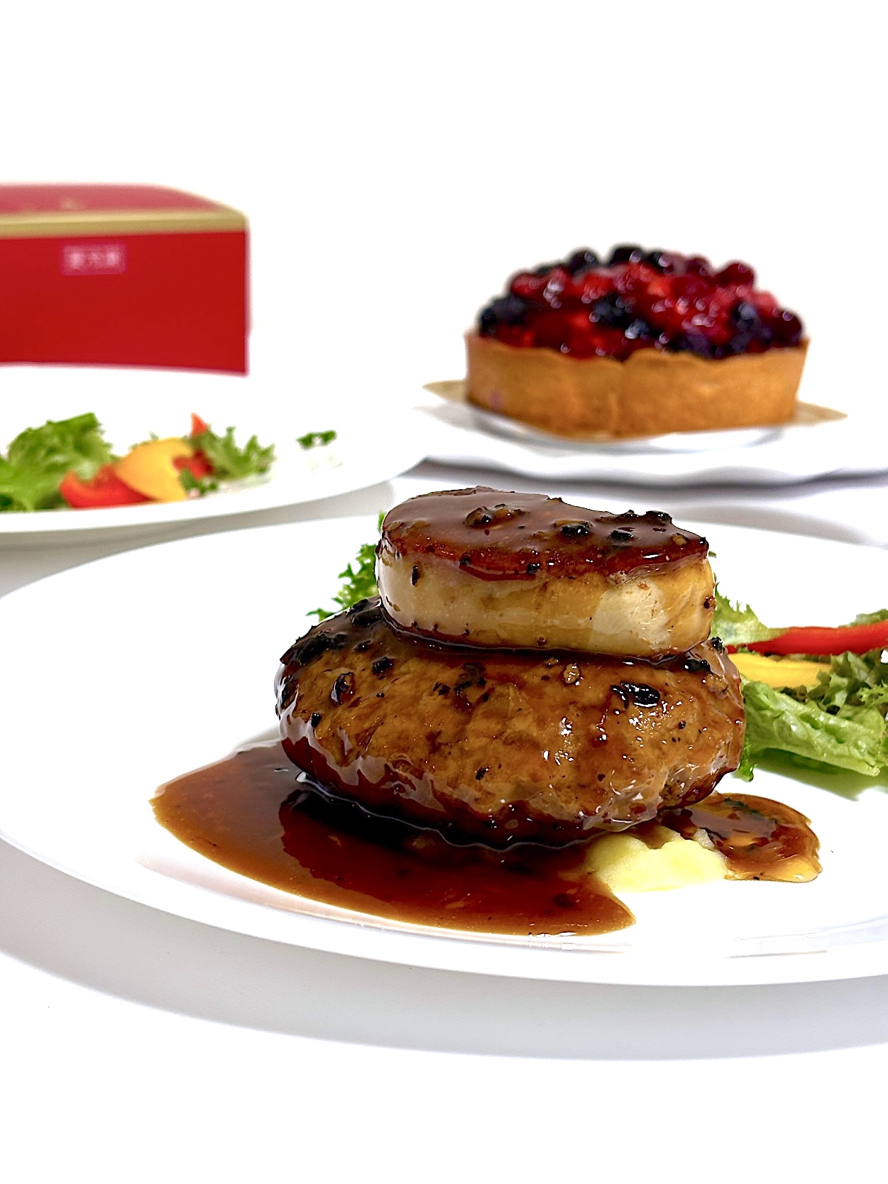 中でも本商品は、芳醇なトリュフソースとフォアグラを添えたロッシーニ風ハンバーグ、そして華やかな赤い果実のドームタルトをセットにした贅沢な一品です。