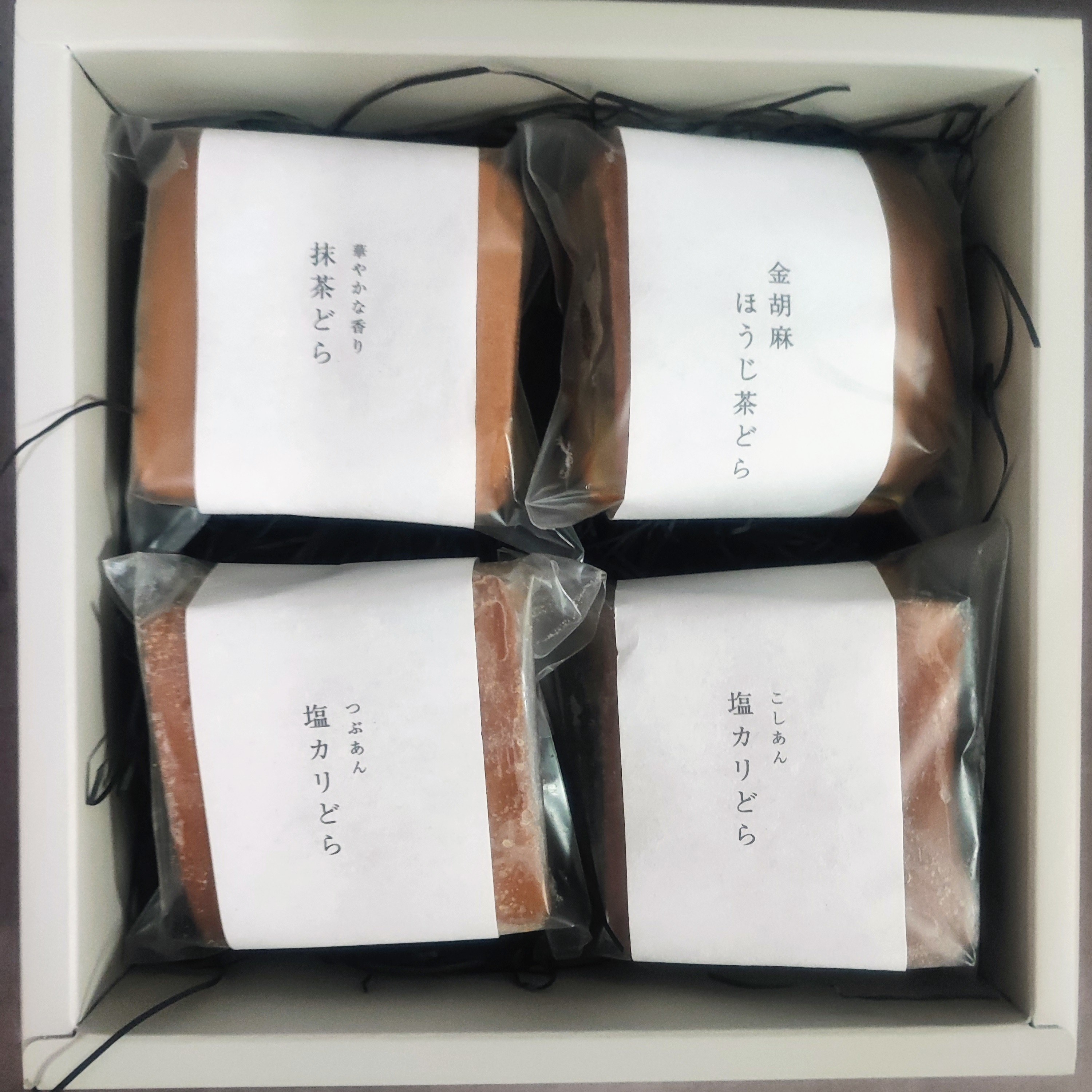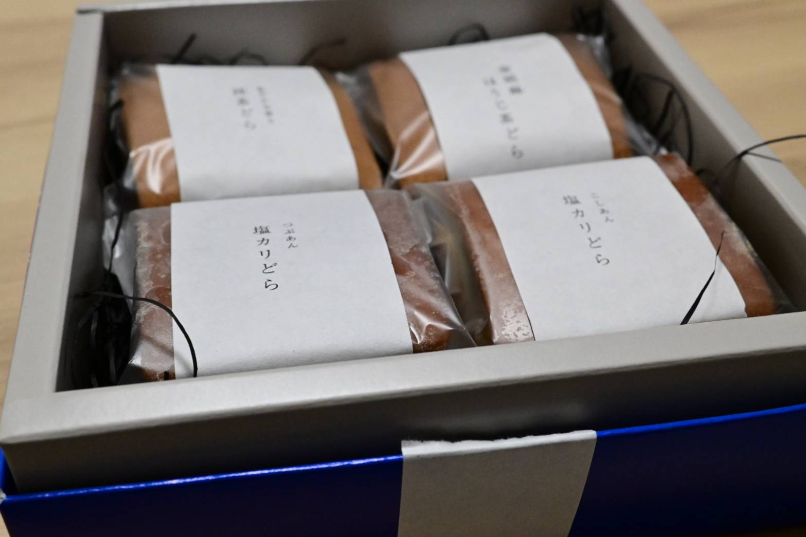 どら焼き専門店の「塩バターどら焼き」です。隠し味として自家製塩を使用しています。餡は鳥取県産の大納言小豆を使い、地域の食材を活かした味わいを引き出しています。自家製塩と鳥取県産バターをどら焼きの皮の表面に塗り、カリっと焼き上げた「塩カリどら(粒餡・こし餡)」、鳥取県大山町の井上青輝園産の最高級抹茶「青輝」を使った「抹茶どら」、ほうじ茶餡に直火焙煎の有機金ごまを練り込んだ「金胡麻ほうじ茶どら焼き」の4種セット。異なる味わいを食べ比べできるたのしさがあり、鮮やかな青色のギフトボックス入りなのでプチギフトにもおすすめです。