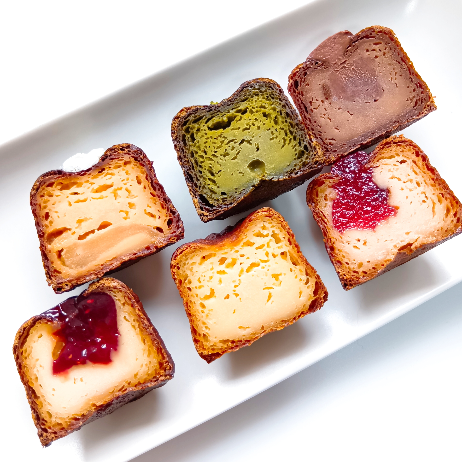 石窯でじっくり焼き上げた、外はカリッと香ばしく中はもっちり食感の「カヌレ」です。幻の国産米「ハツシモ」の「米ジュレ」と、希少な卵「京地玉」を使用することで、米粉のやさしい甘みととろける口どけ、濃厚な黄身と豊かなコクが合わさり、奥深い味わいを引き出したグルテンフリースイーツ。素材の味をダイレクトに感じる「プレーン」、チョコの風味となめらかさがたまらない「ショコラ」、甘さと酸味のバランスが良い「りんごバター」、豊な香りが魅力の「抹茶」に2つの「季節のフレーバー」を加えた6種。異なる味わいのセットなので食べ比べが楽しめます。ギフトボックス入りなので贈り物にもおすすめです。