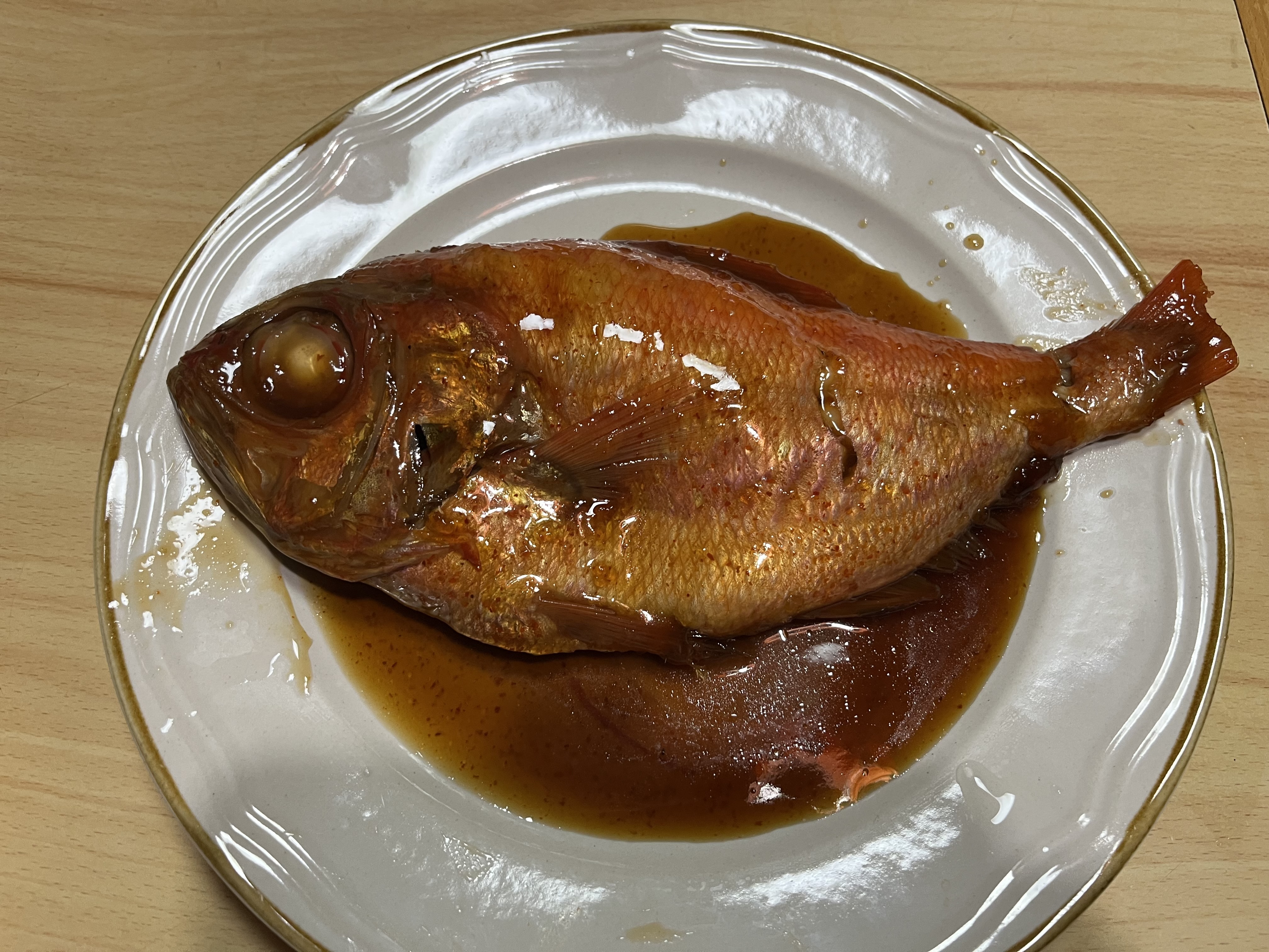 10歳〜80歳代5人が、美味しい!こりゃすごい!これは何処の金目鯛?青森の八戸?遠いところから!よくいらっしゃいました〜。などと口々に。目玉の周りの身もお顔の身も綺麗になくなりました。
