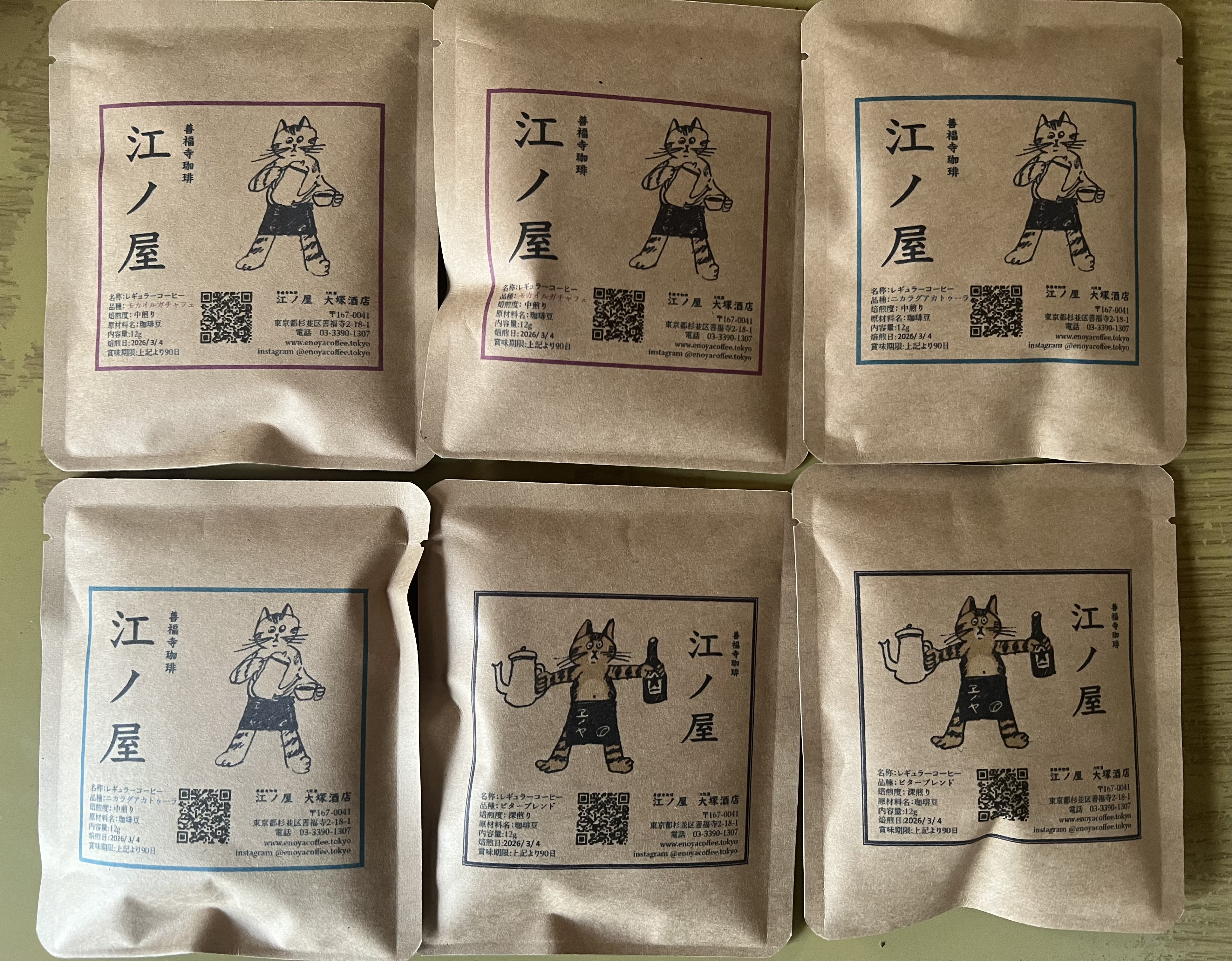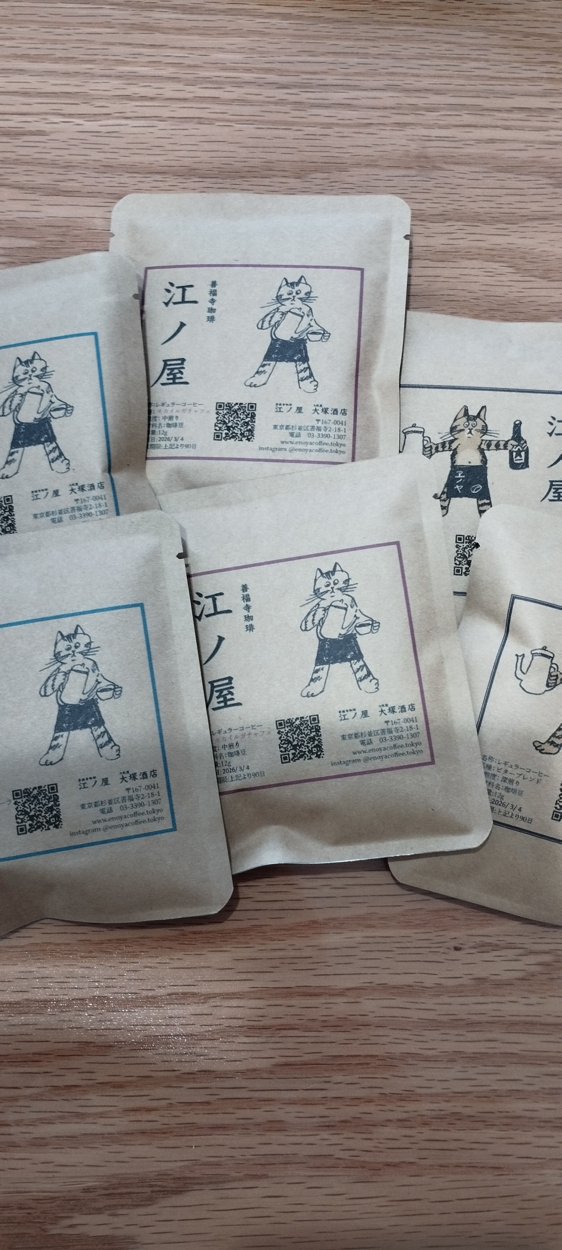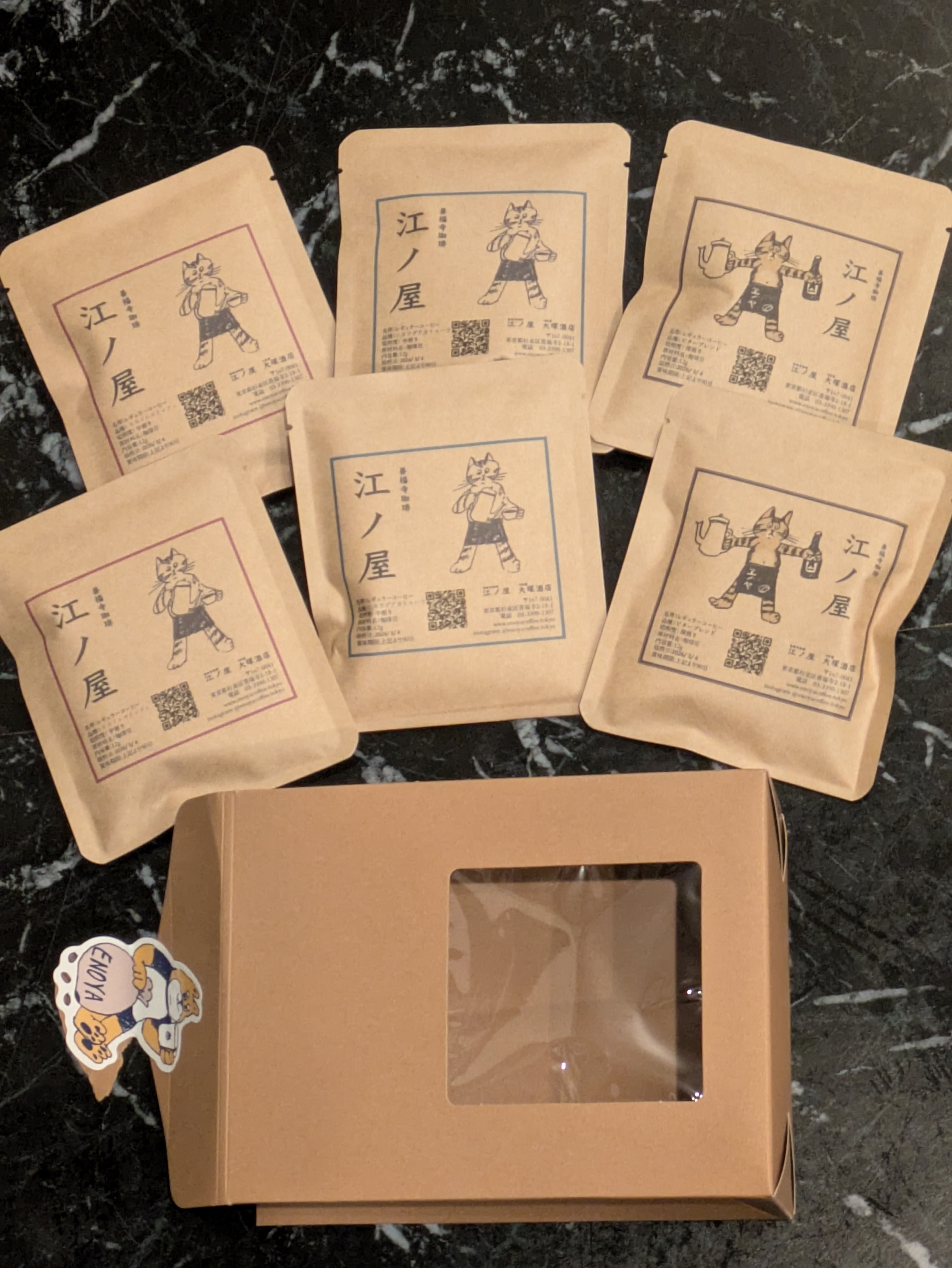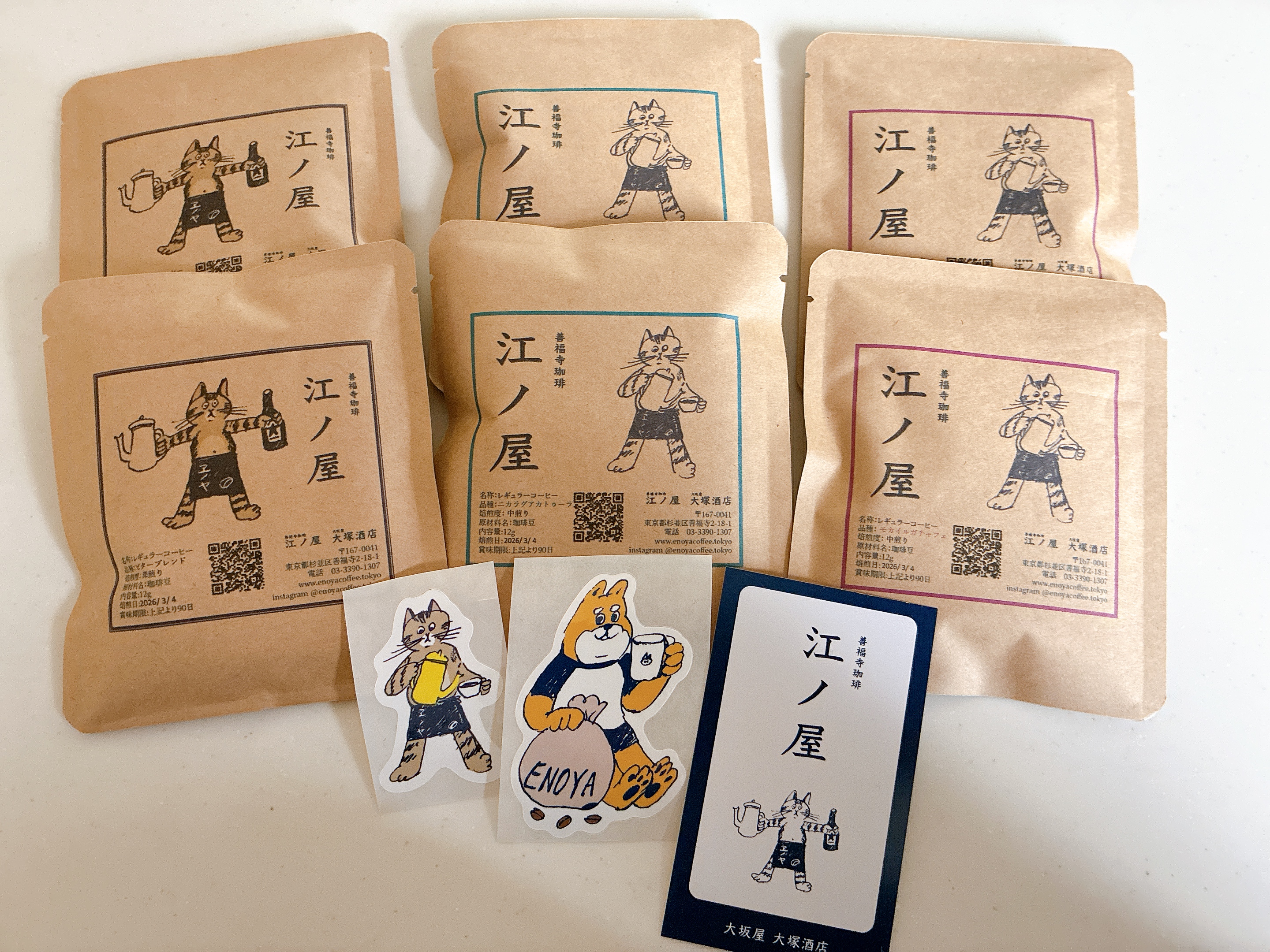 四代目看板猫の江ノロゴが入ったドリップバッグ。焙煎士が丁寧に焙煎し、ガス抜き直後に封をした香り高いコーヒー。