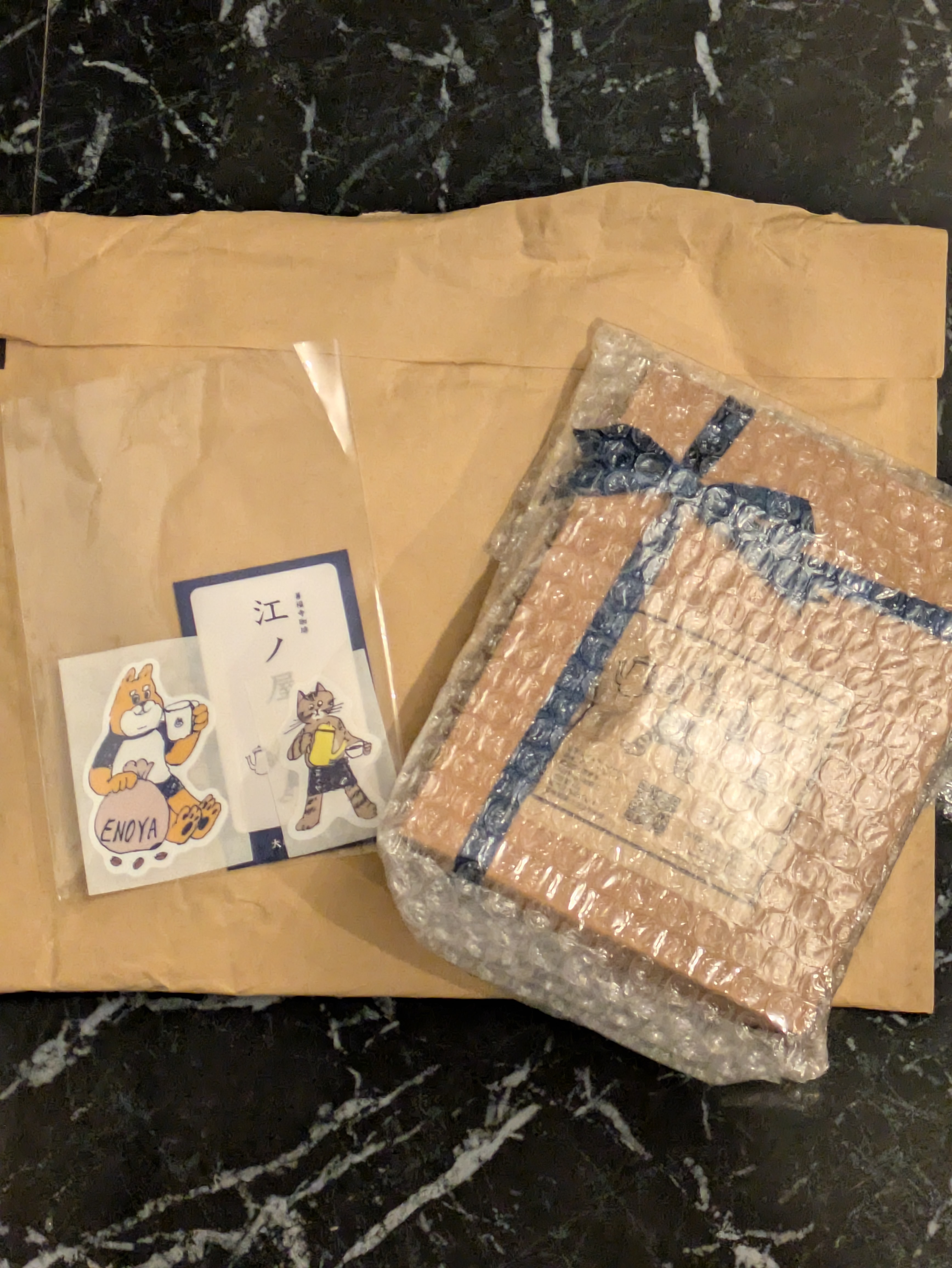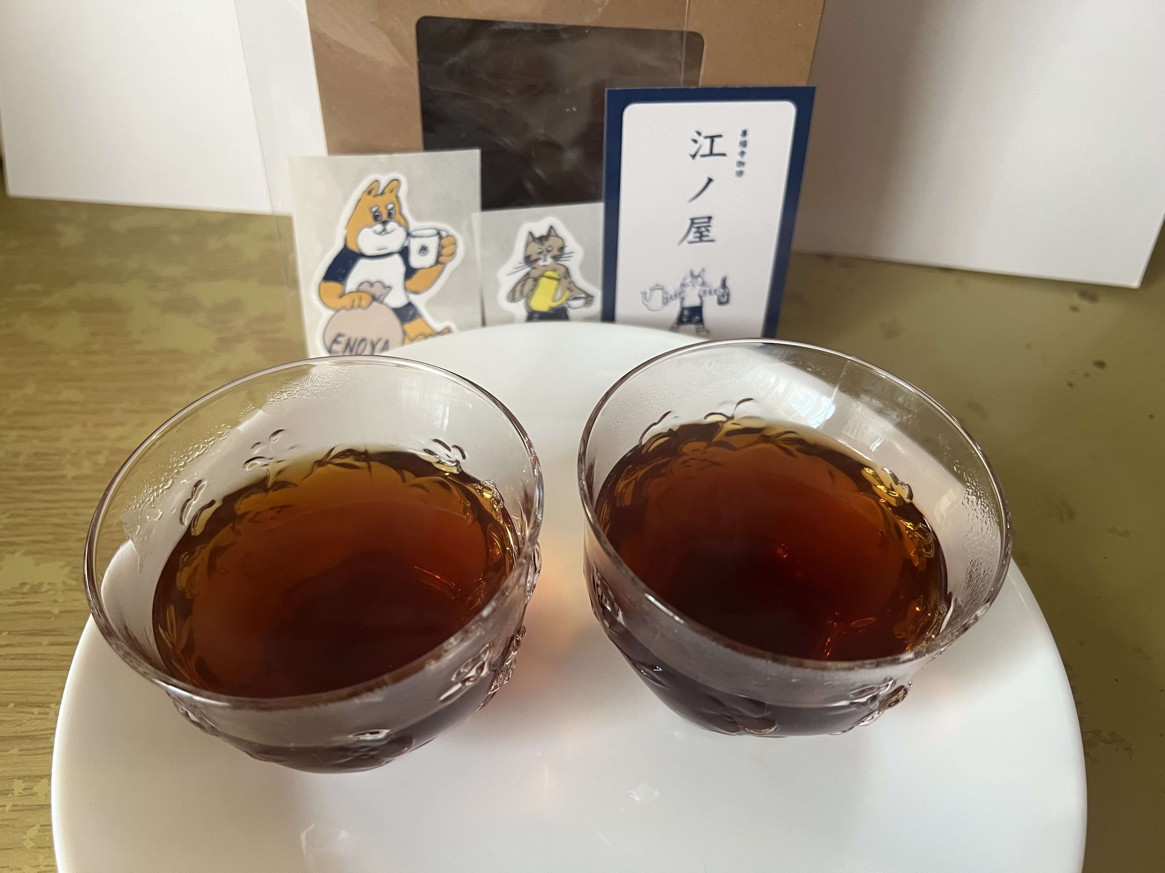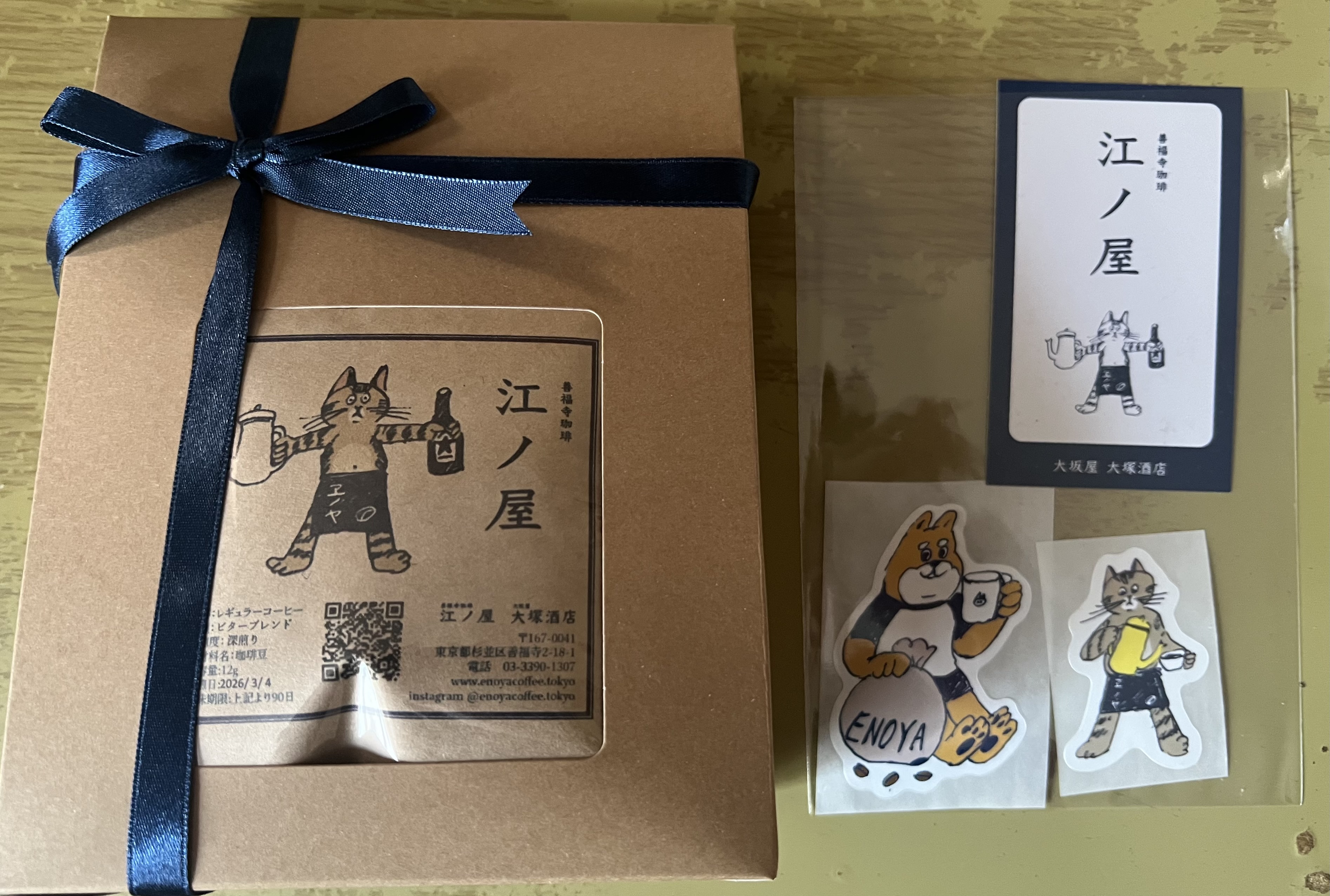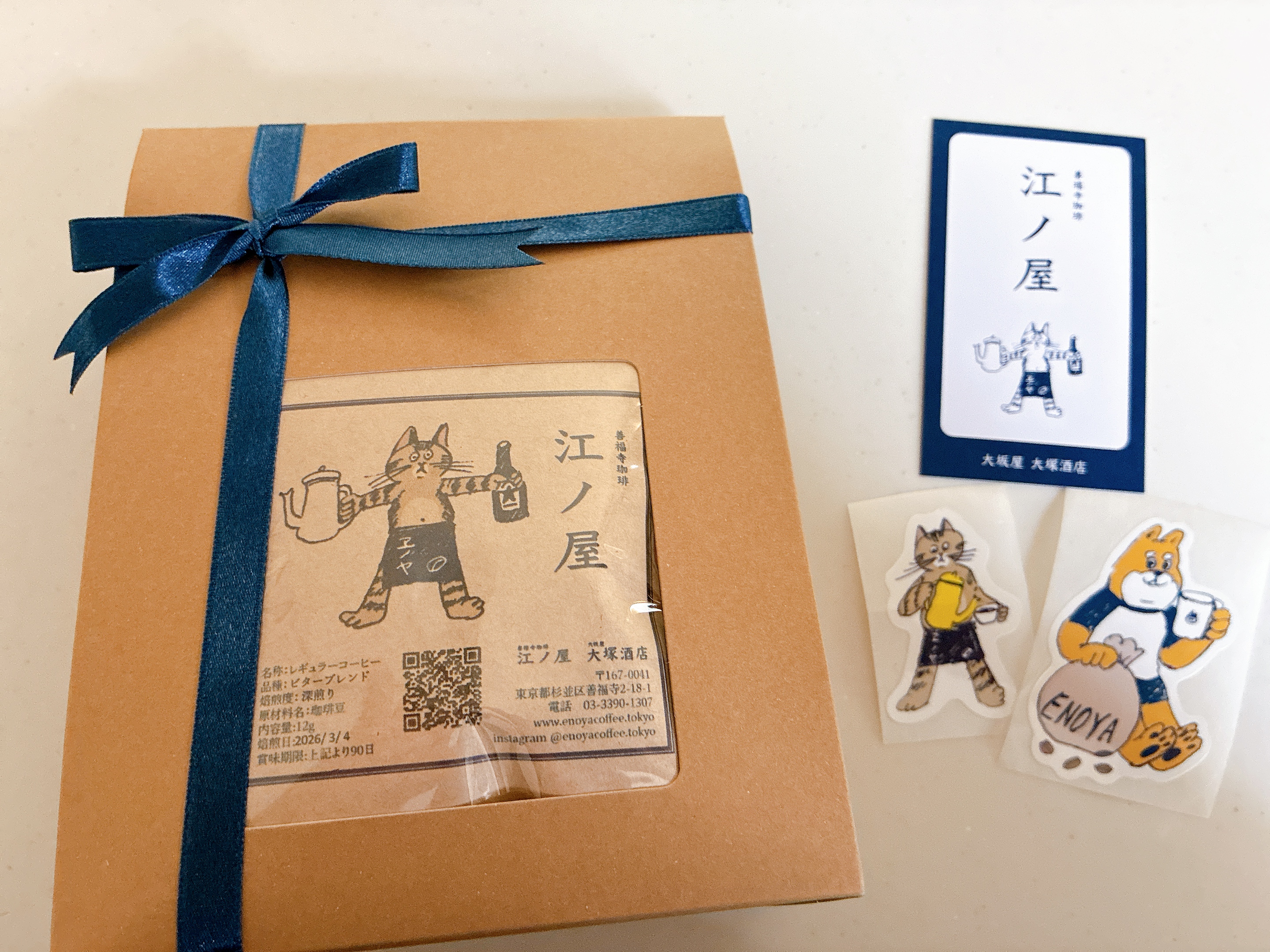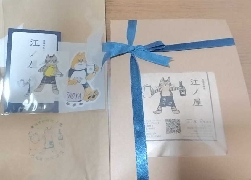 四代目看板猫の江ノロゴが入ったドリップバッグ。焙煎士が丁寧に焙煎し、ガス抜き直後に封をした香り高いコーヒー。