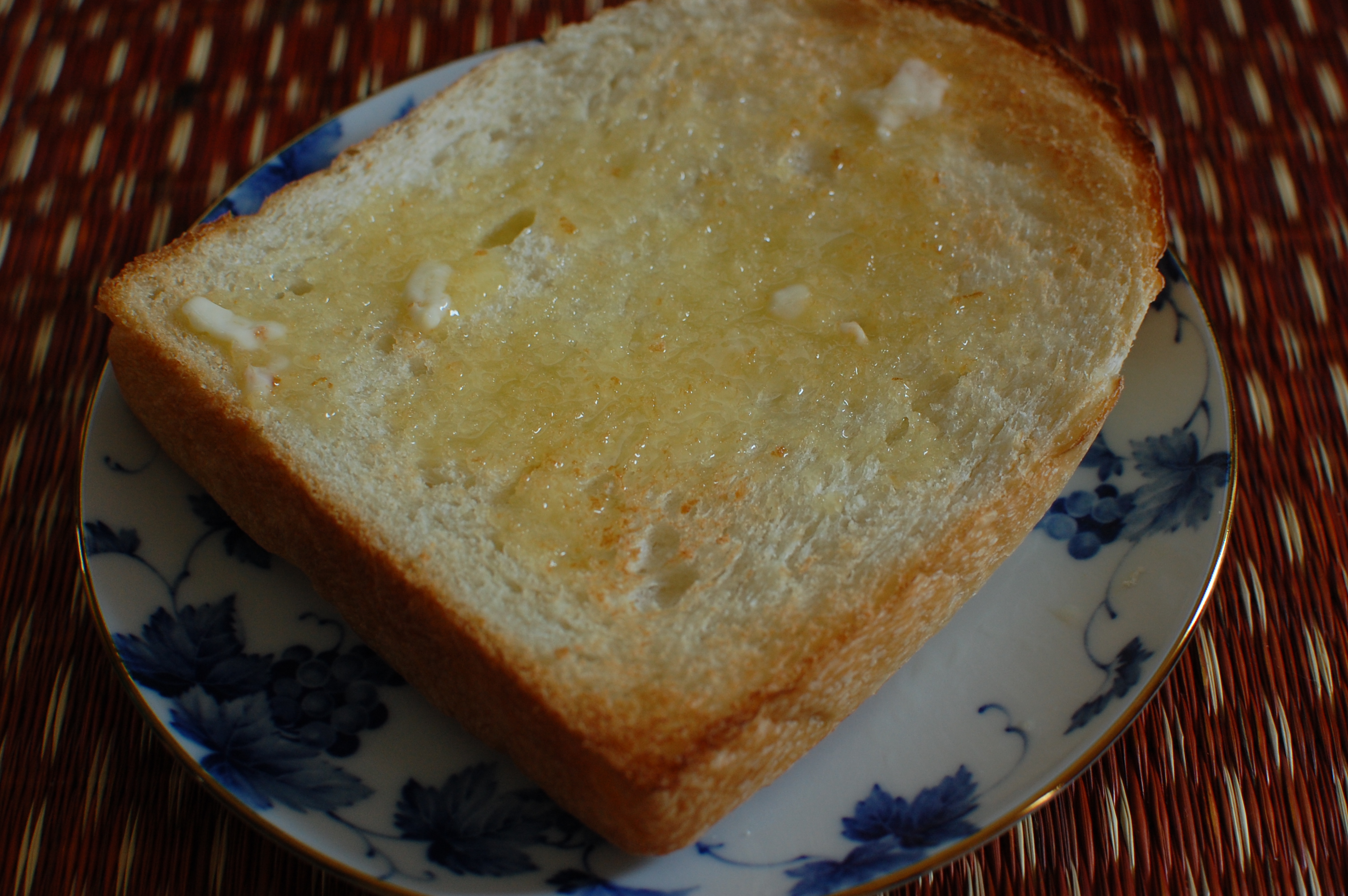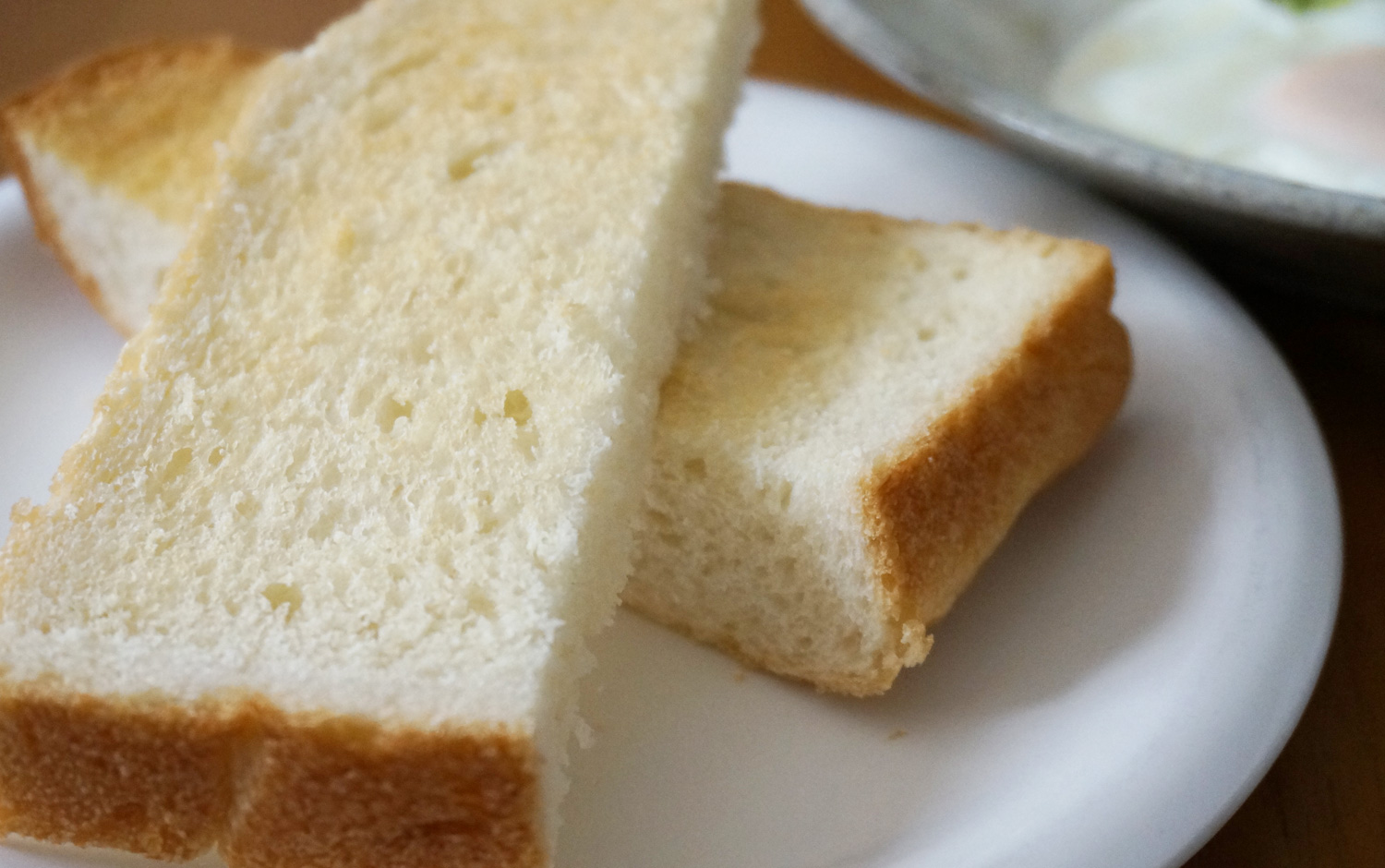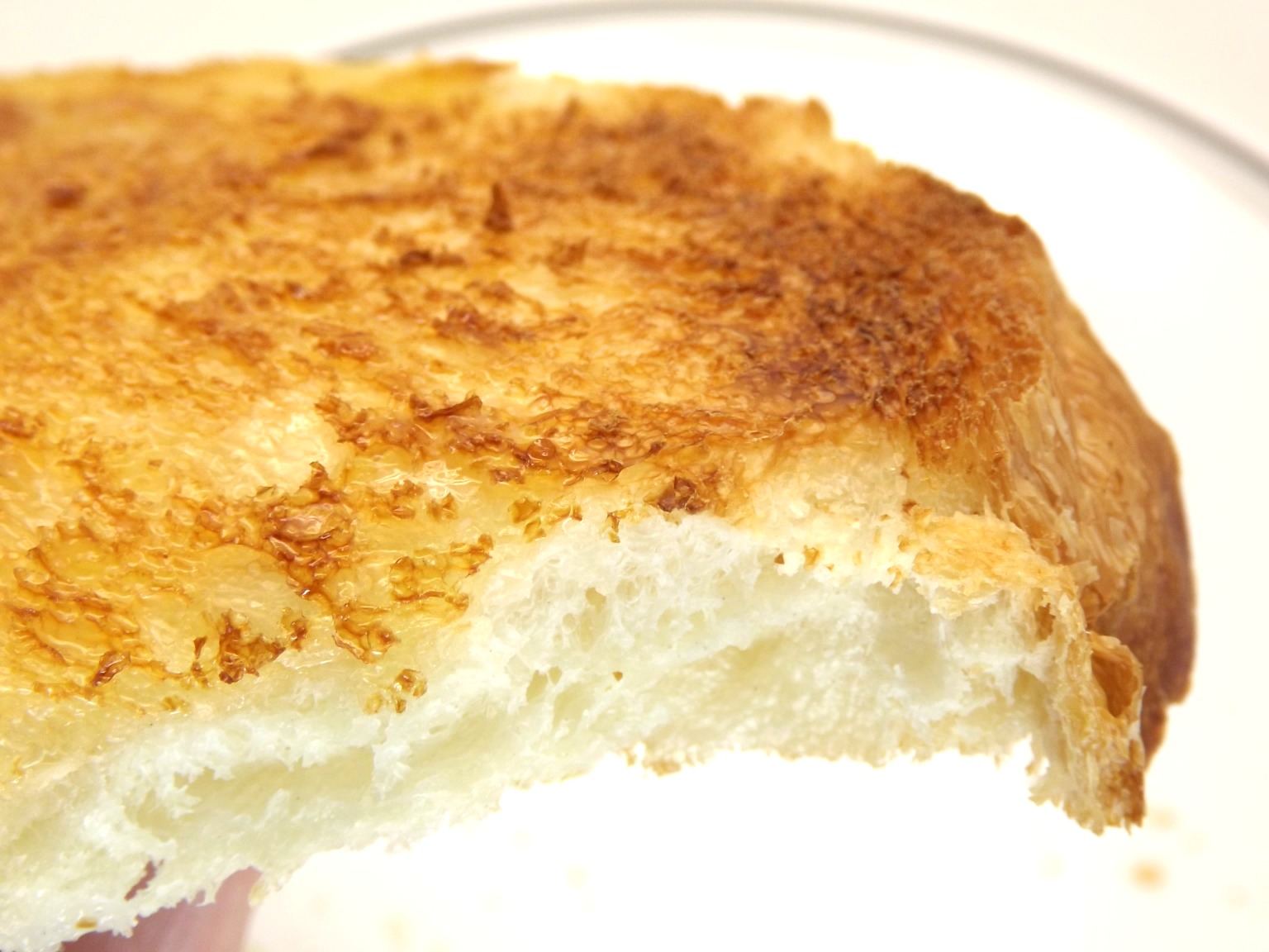 さらにグリルでトーストすると、少し軽い口当りになりましたが、ほのかに酵母の甘い香りが伝わり、サクサクとした食感がとても美味しかったです!しかも、焼いてから時間が経ってもこのサクサクの食感は少し減少するものの、10分経っても30分経っても私好みの食感が残っていて感動でした。(ちなみに、市販の食パンでは焼きたてから10分も経たないうちにサクサク食感はほとんどありません)