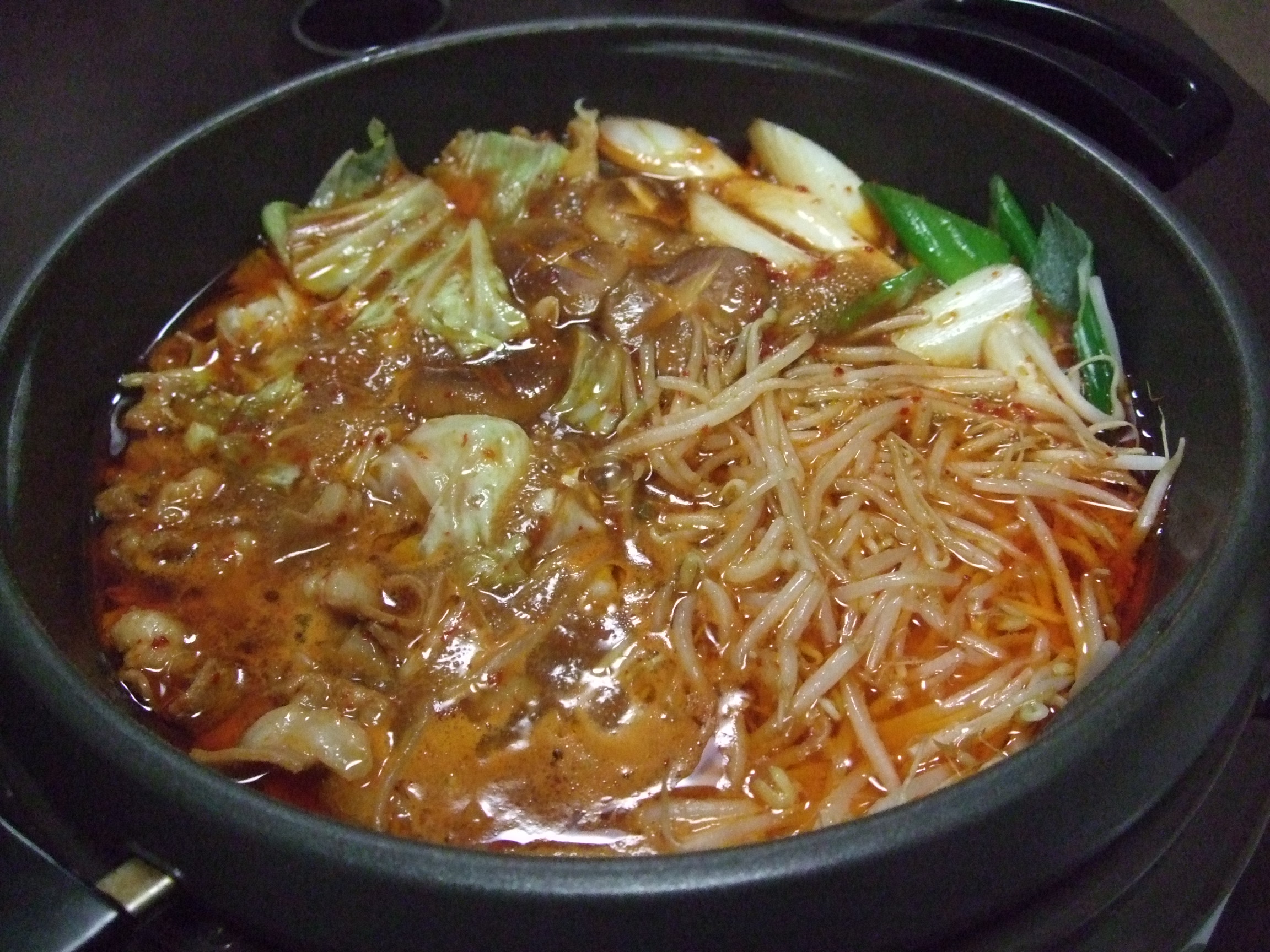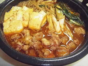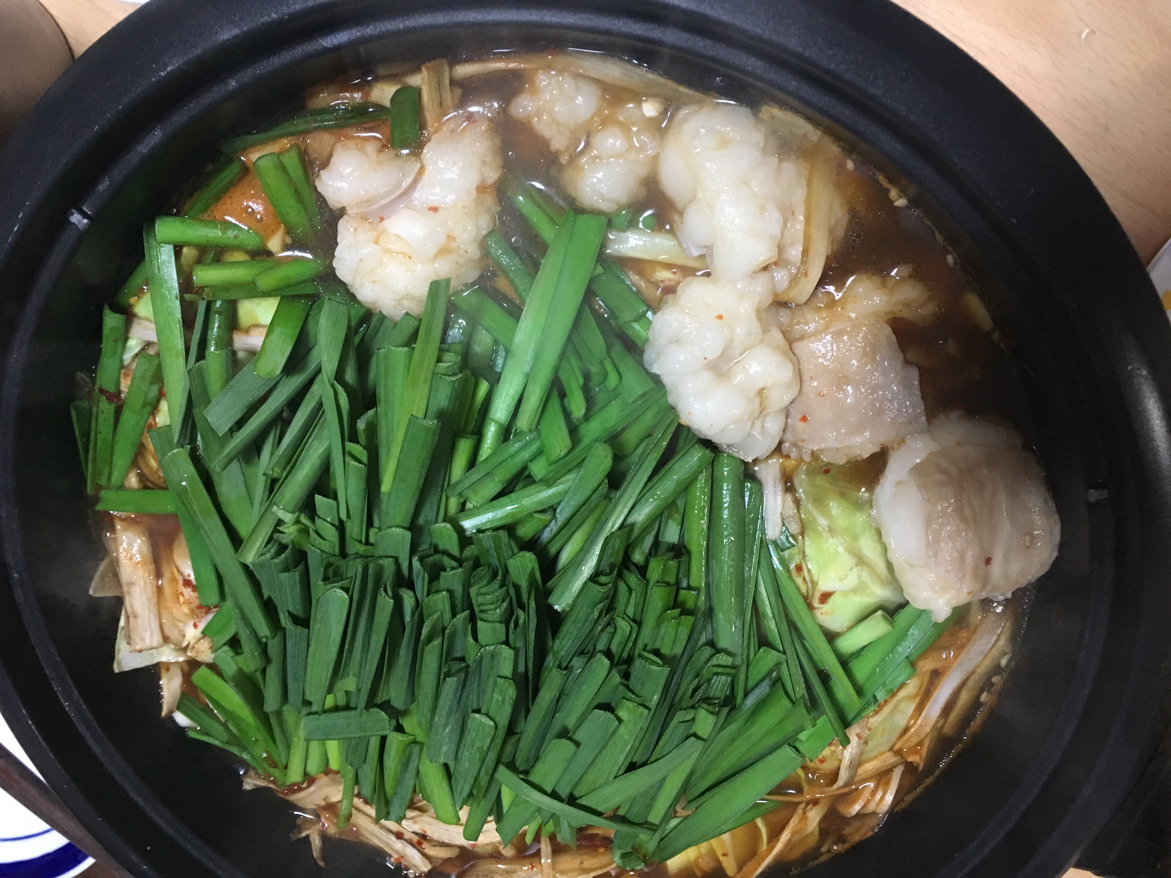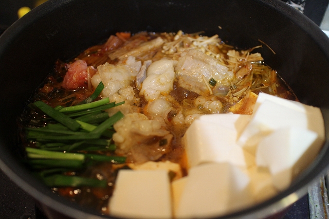 野菜はキャベツ、ニラ、ごぼう、ネギあと豆腐を用意して 付属の辛味噌スープをとモツと一緒に鍋へ入れました◎