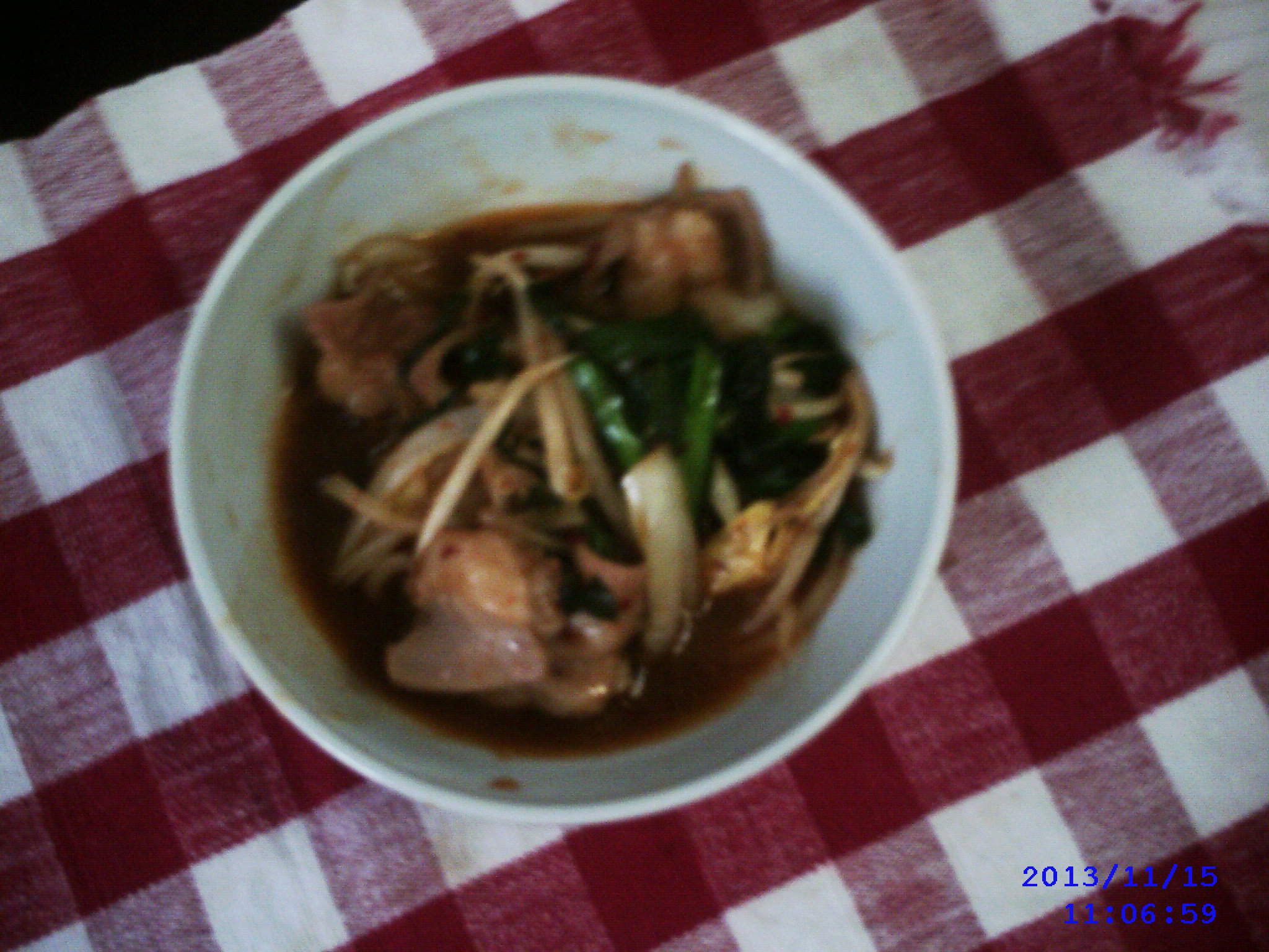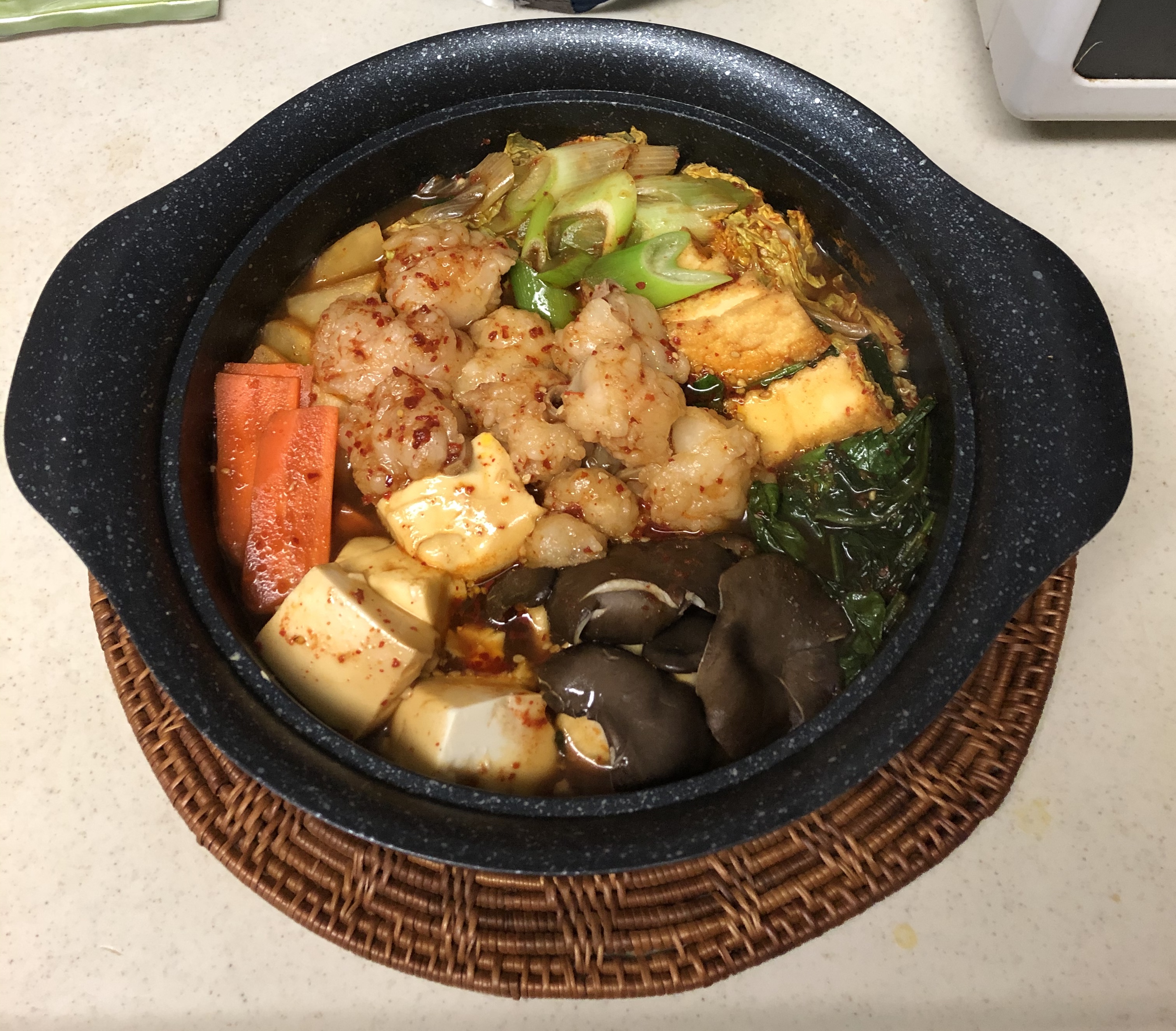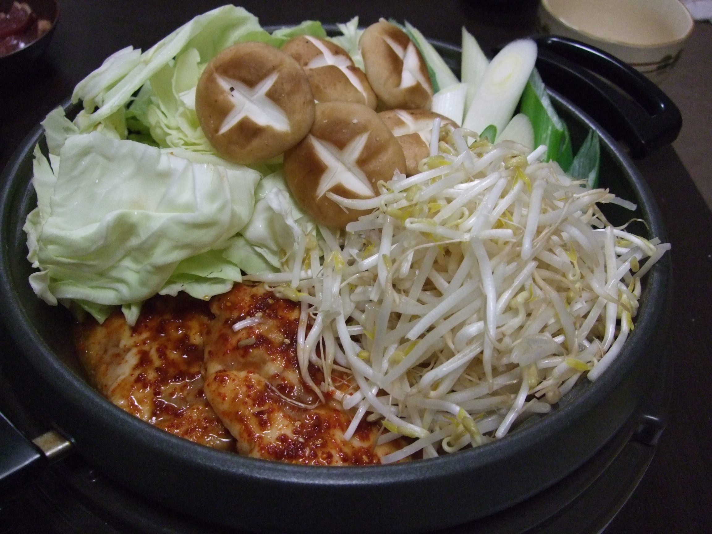 野菜はキャベツ、ニラ、ごぼう、ネギあと豆腐を用意して 付属の辛味噌スープをとモツと一緒に鍋へ入れました◎