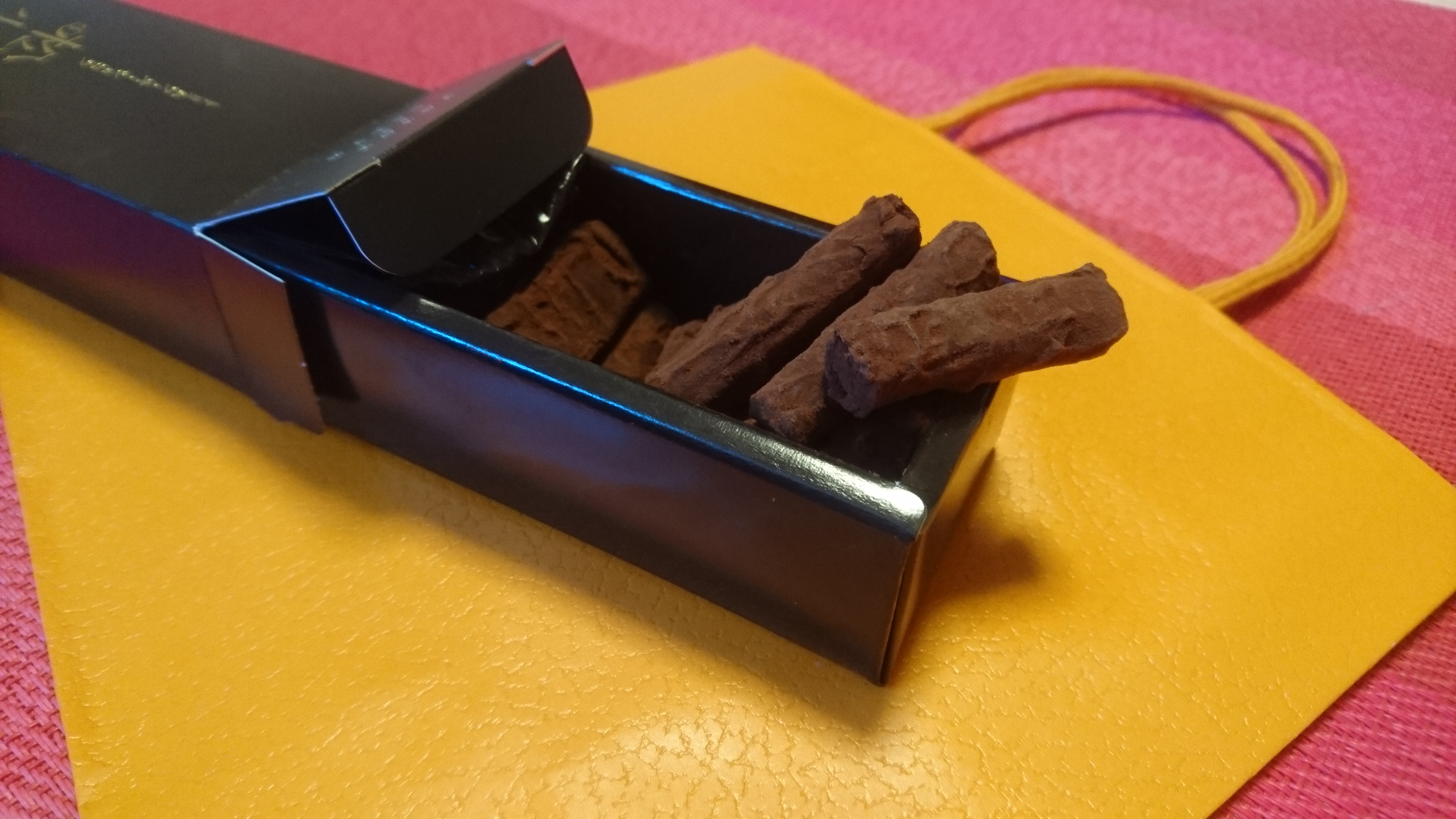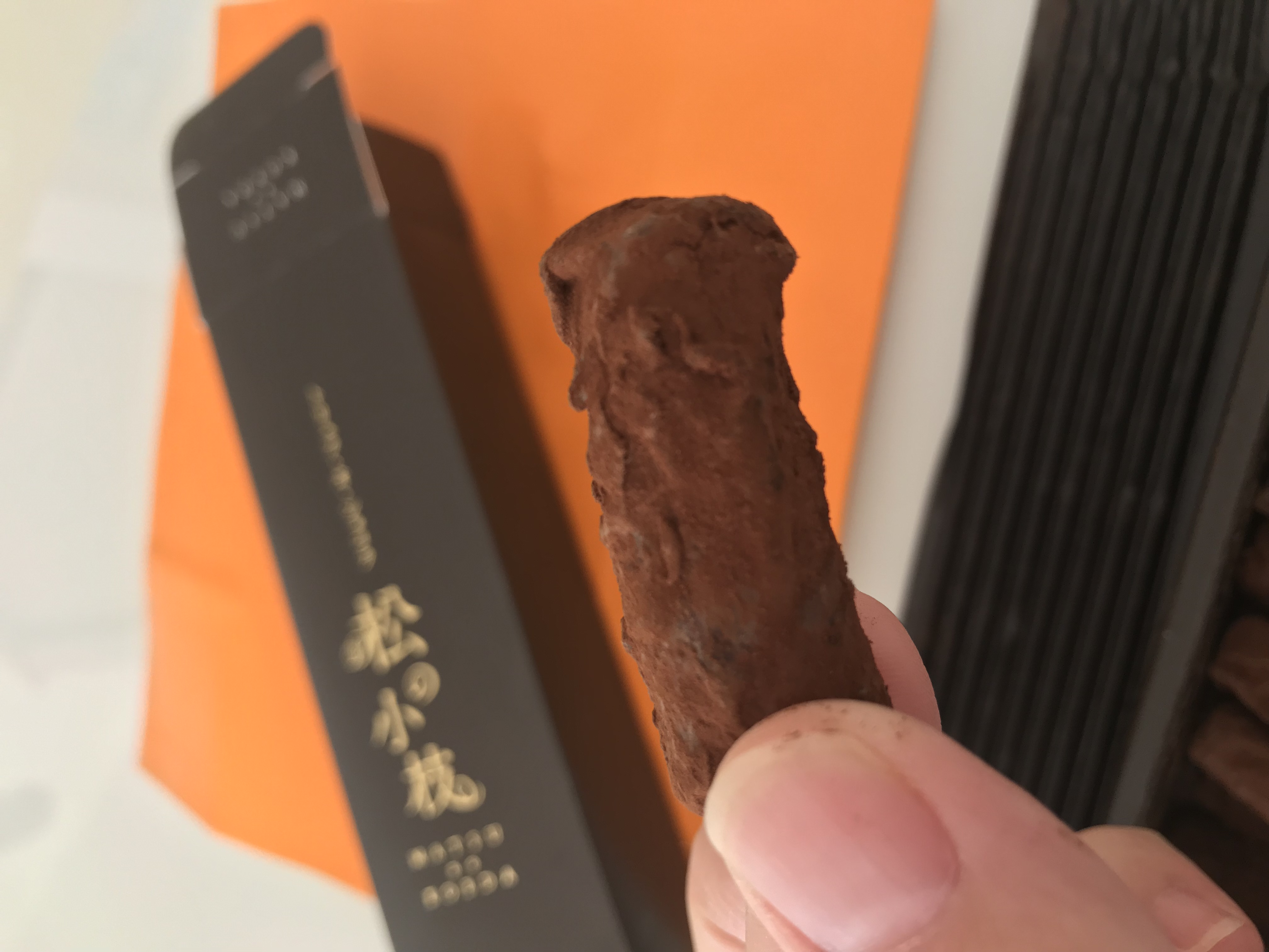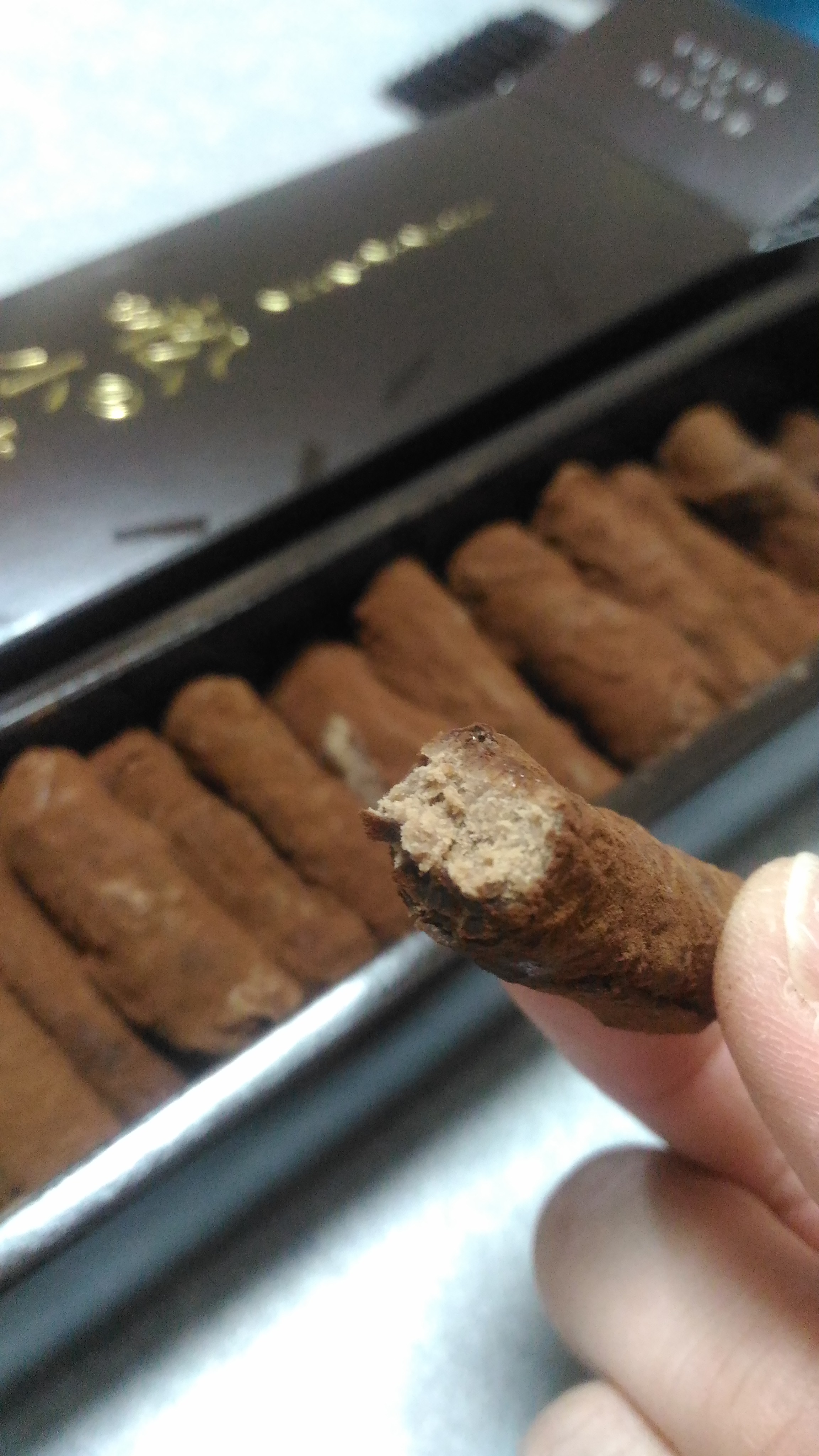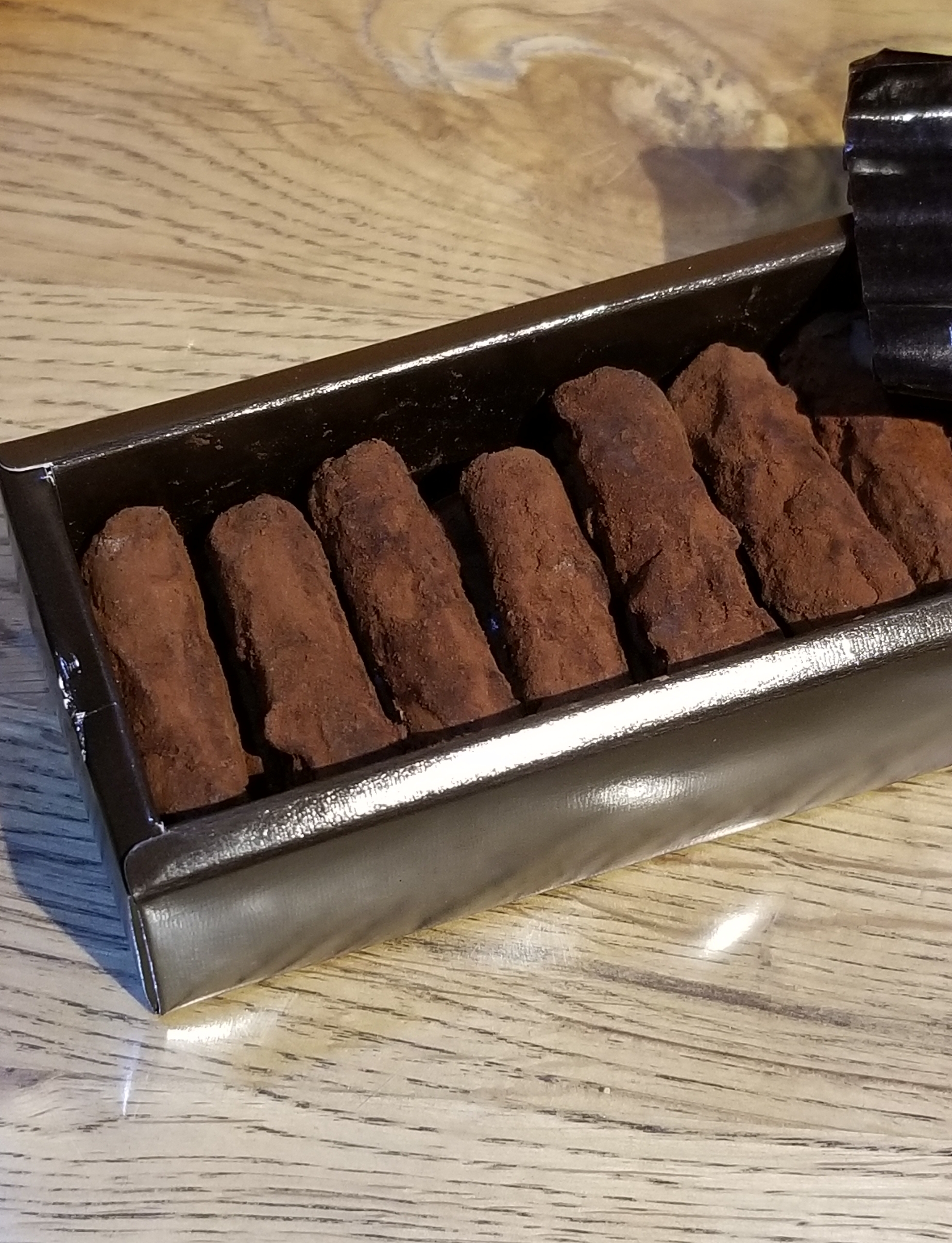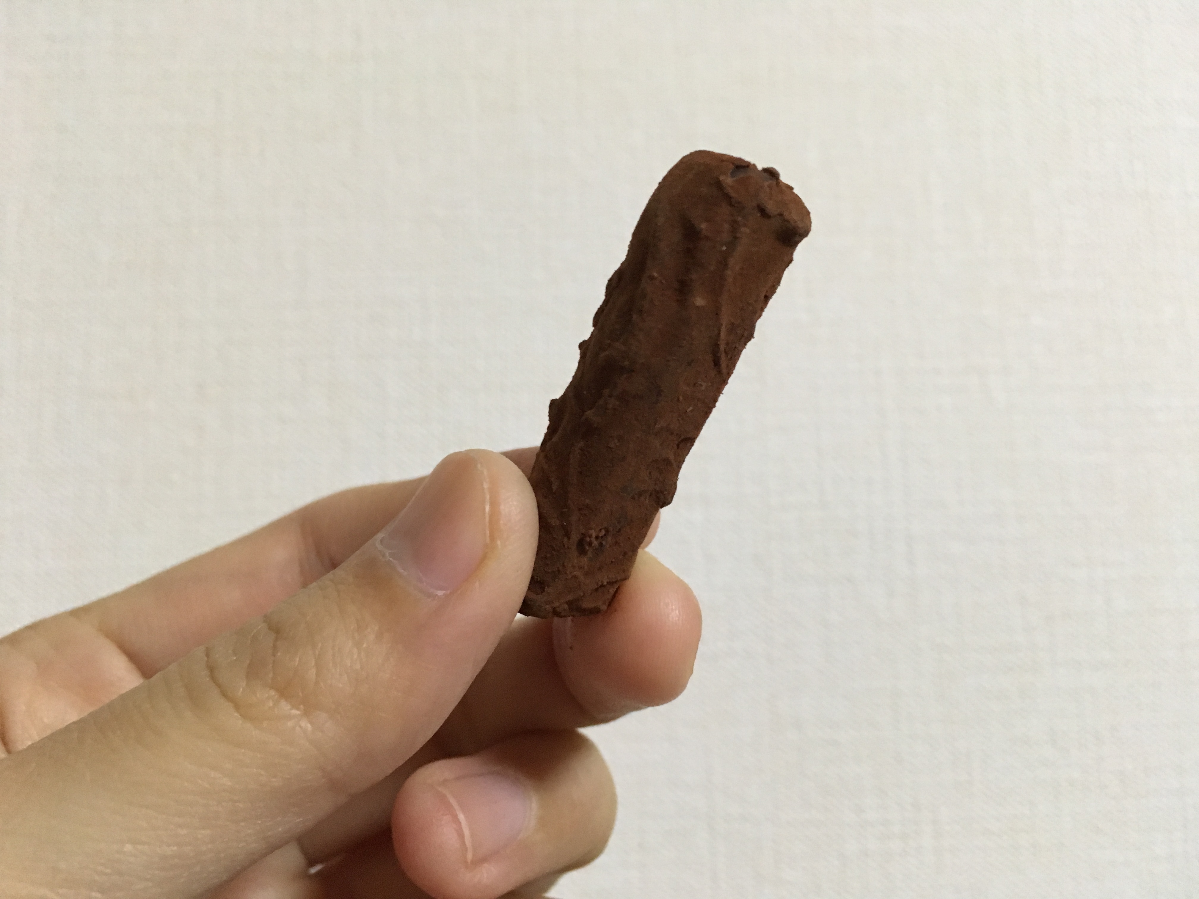 小枝に見立てたトリュフチョコ、薄いチョコレートでコーティングしてココアパウダーがまぶしてあります。見た目はとてもかわいらしいです。かじるとパキッとした軽い食間のあとになめらかなチョコが、口の中でとろけます♪ほのかに洋酒が香るので、ちょっと大人向けのおしゃれなチョコレートです。