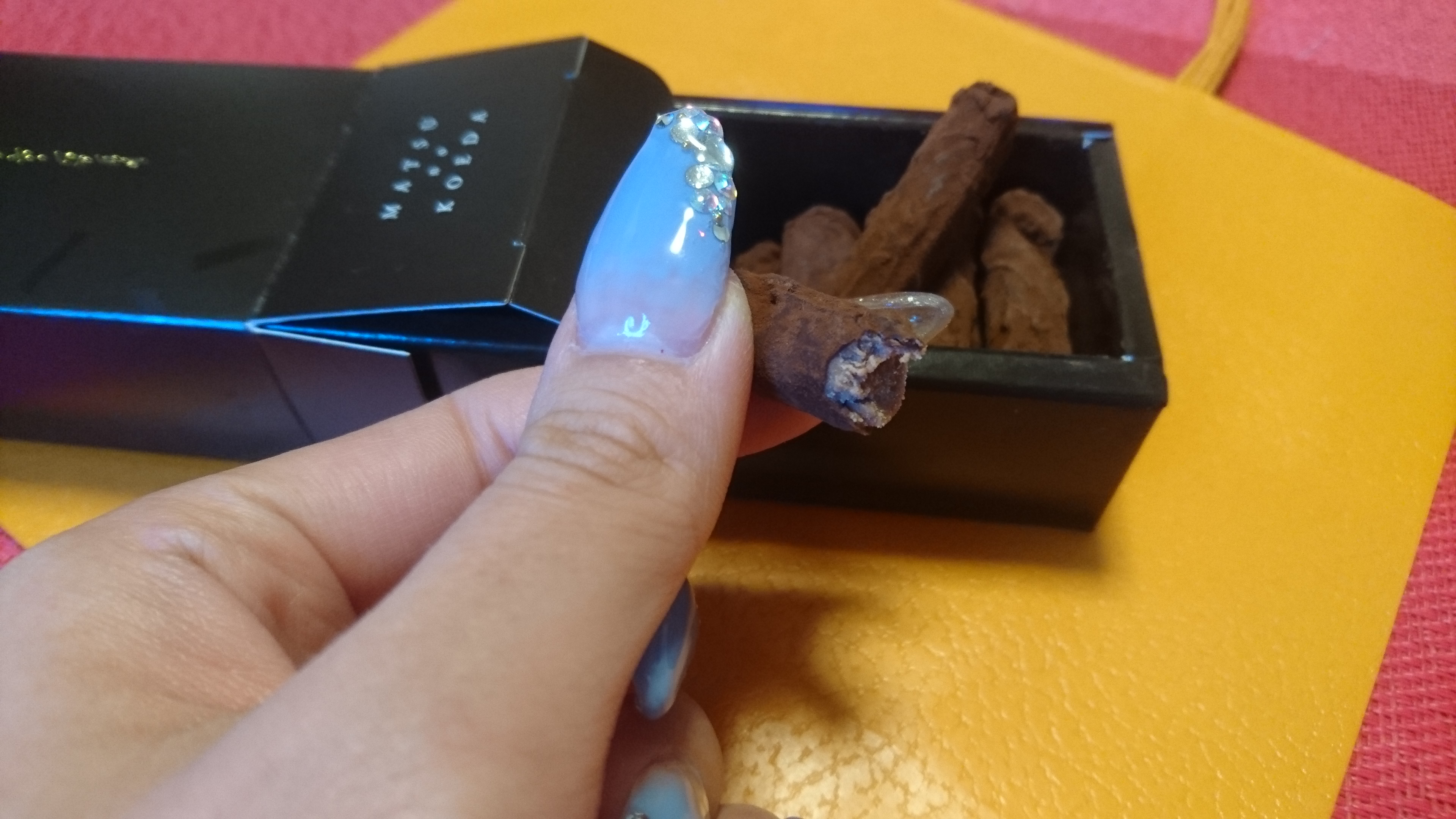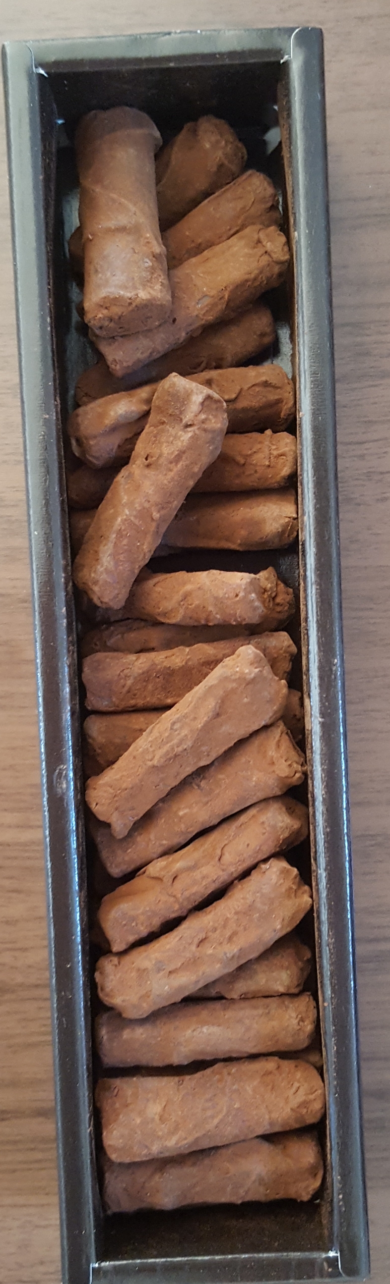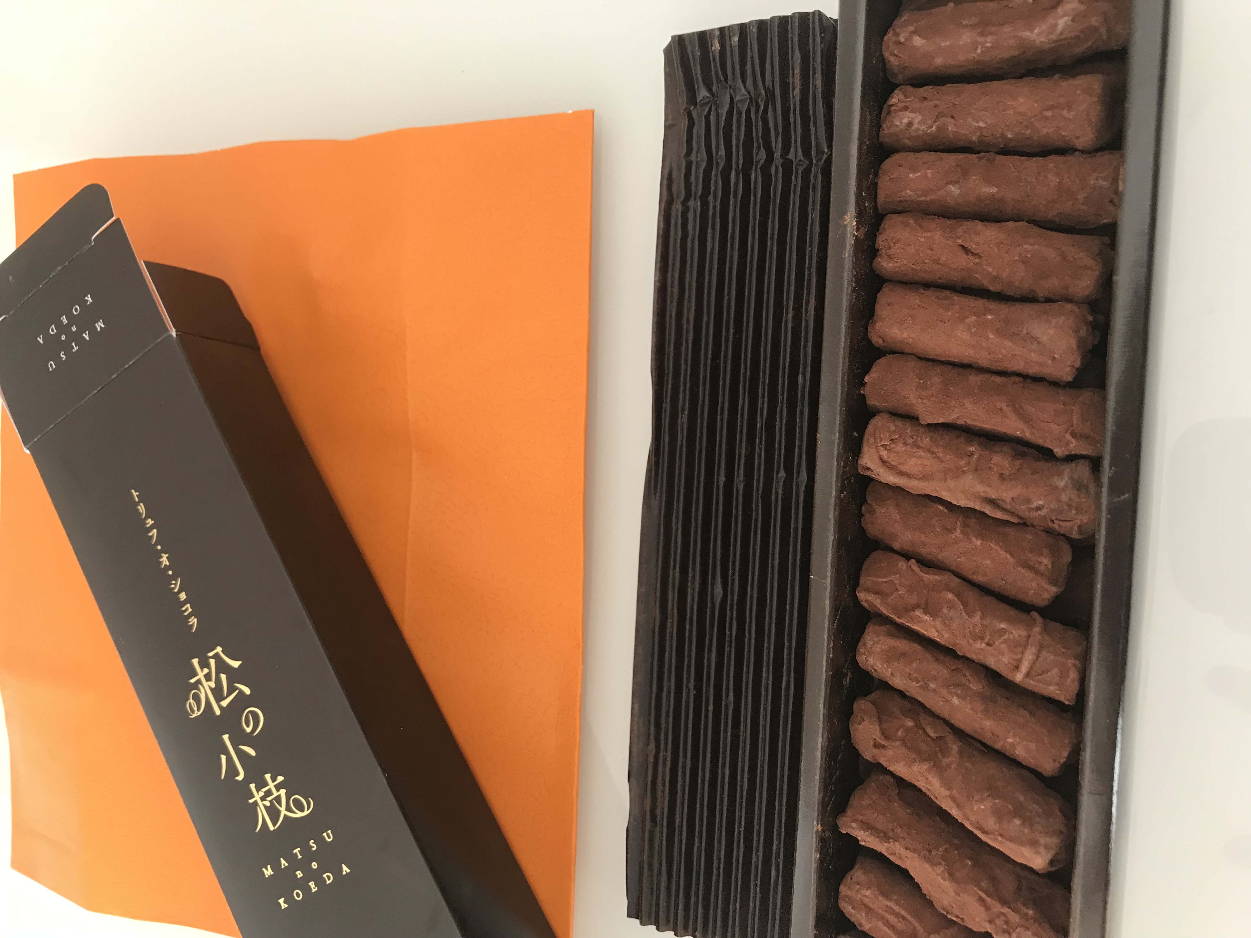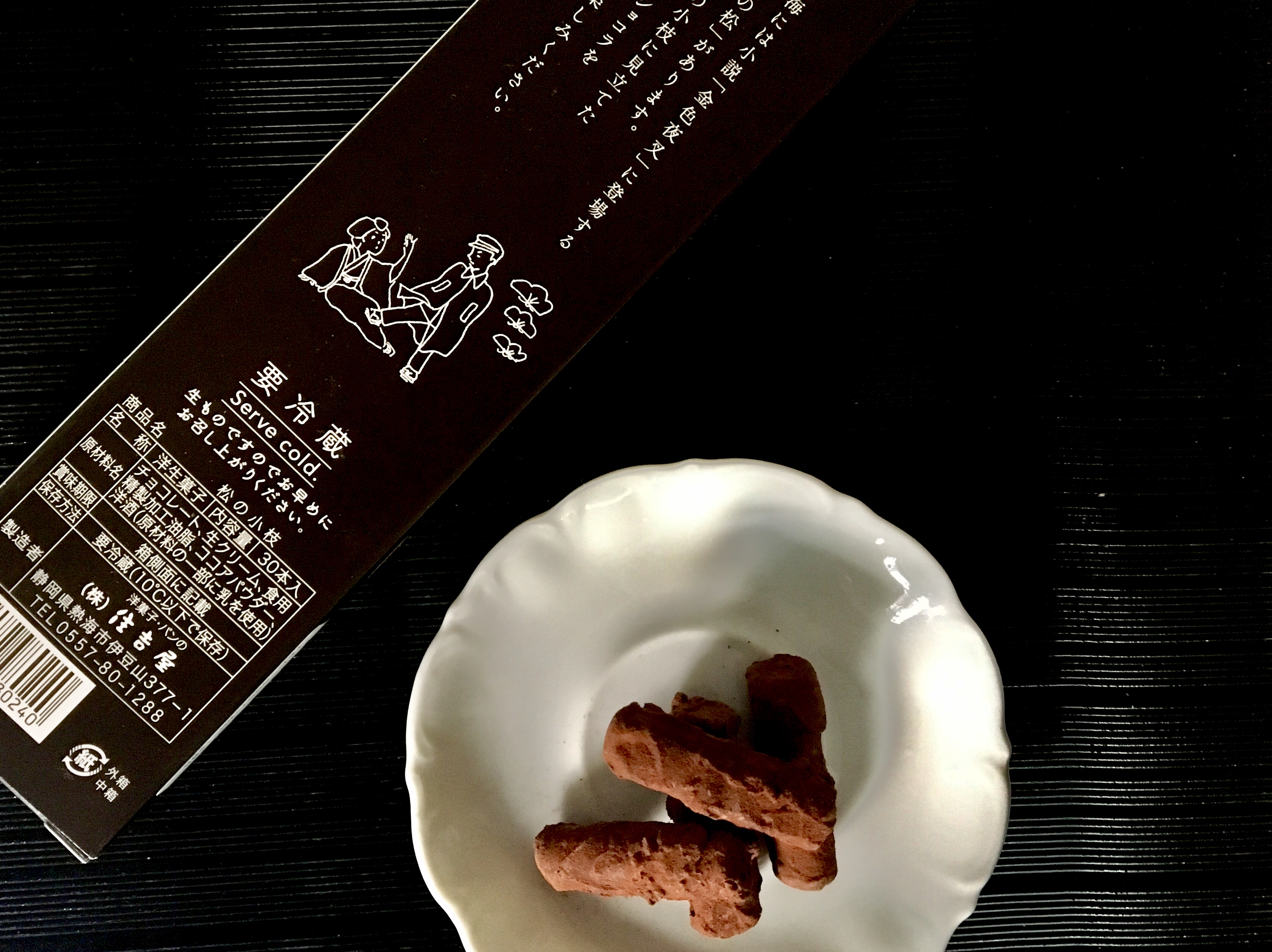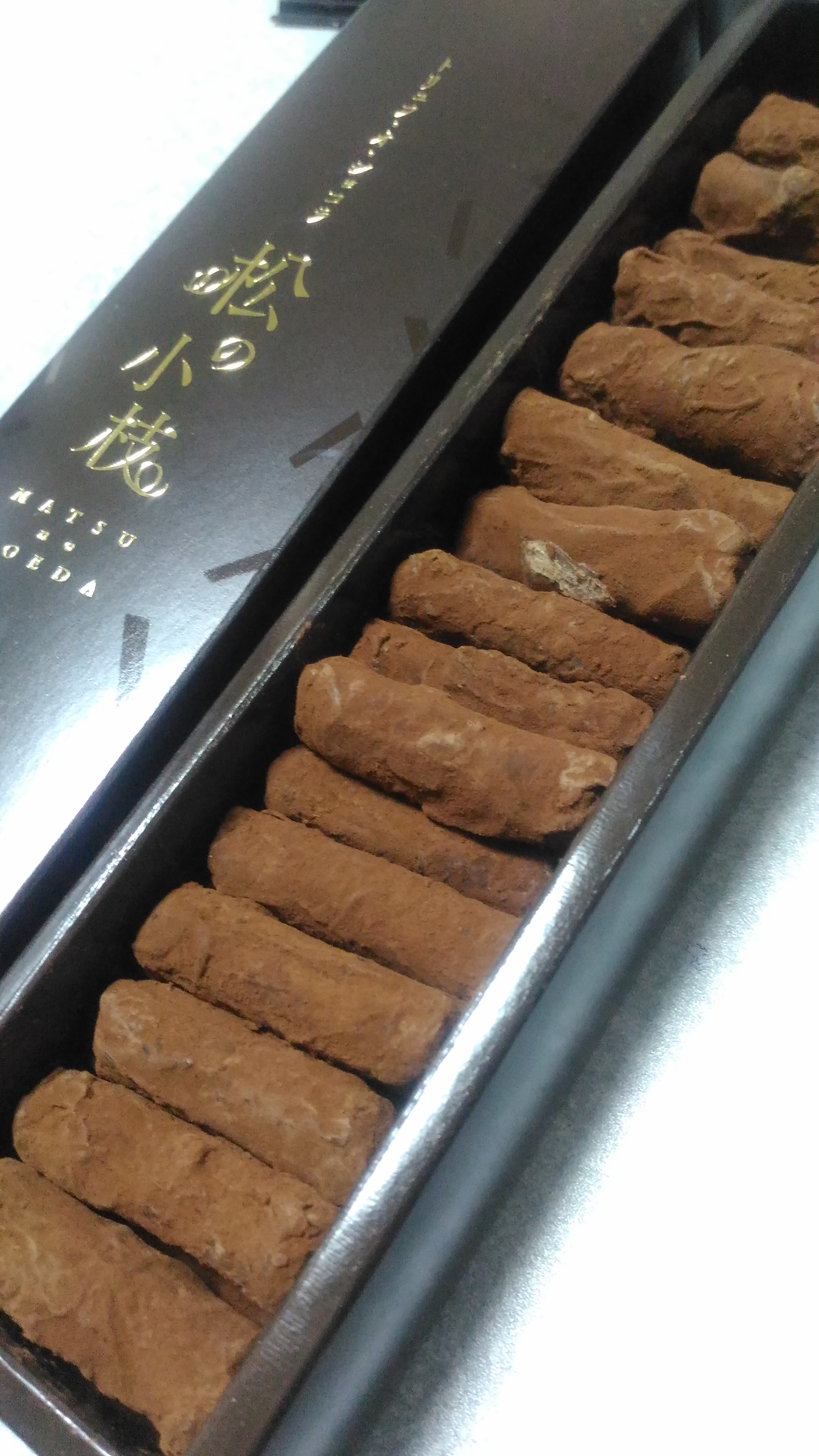 小枝に見立てたトリュフチョコ、薄いチョコレートでコーティングしてココアパウダーがまぶしてあります。見た目はとてもかわいらしいです。かじるとパキッとした軽い食間のあとになめらかなチョコが、口の中でとろけます♪ほのかに洋酒が香るので、ちょっと大人向けのおしゃれなチョコレートです。