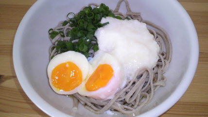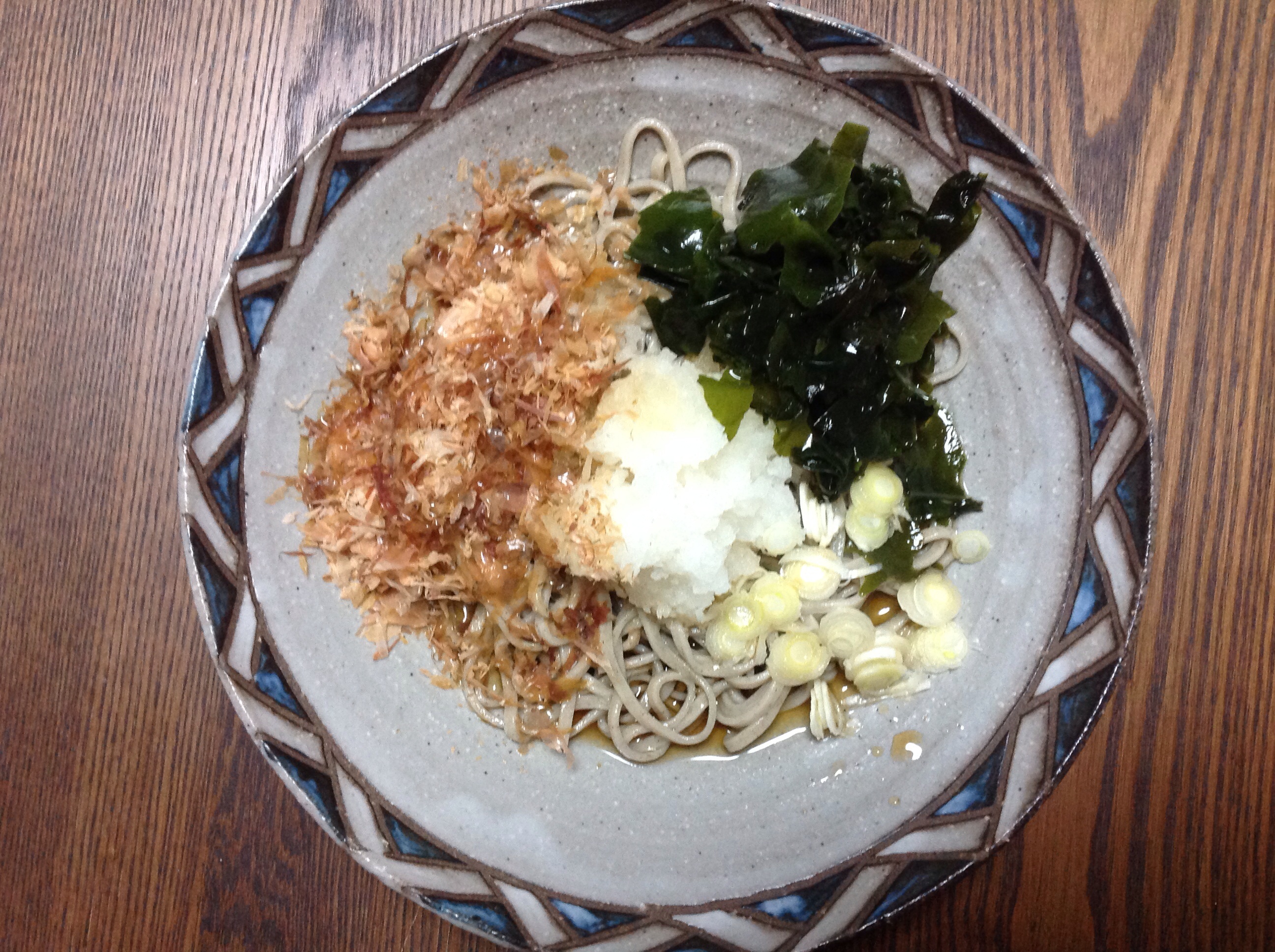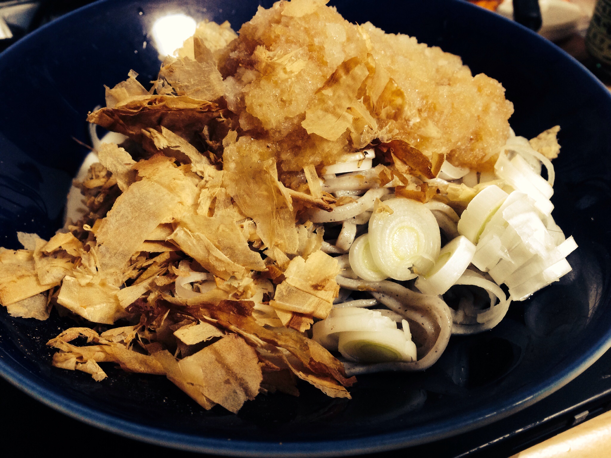 大根、なめこ、ねぎ、かつお節を用意し、さっそく冷たいおろしそばでいただきました。