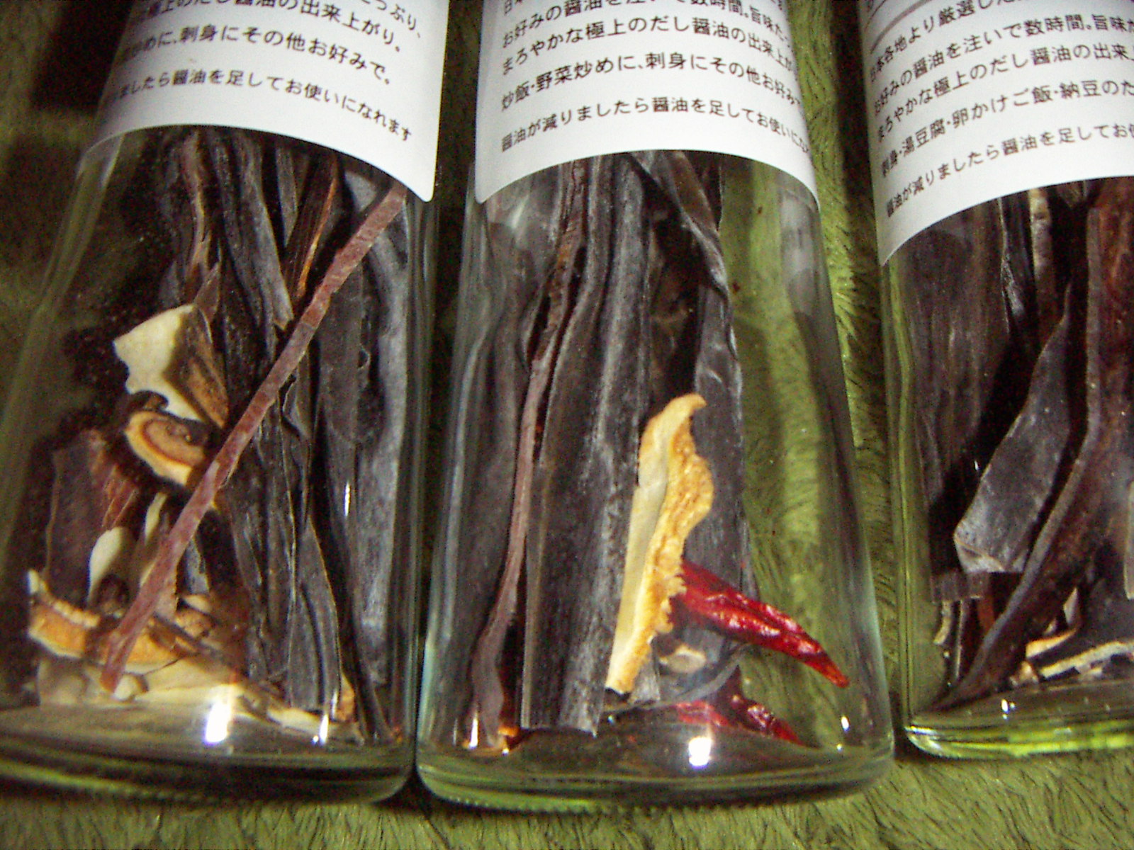 ビンの中には日本各地で採れる4種類の旨味ベース「昆布・鰹節・するめ・椎茸」に「根昆布・唐辛子・にんにく」が入っています。お手持ちの醤油を注いで数時間待つだけでまろやかなだし醤油のできあがり!添加物を使わない、本当の旨味が味わえます。醤油が減っても注ぎ足して何度も使えます。