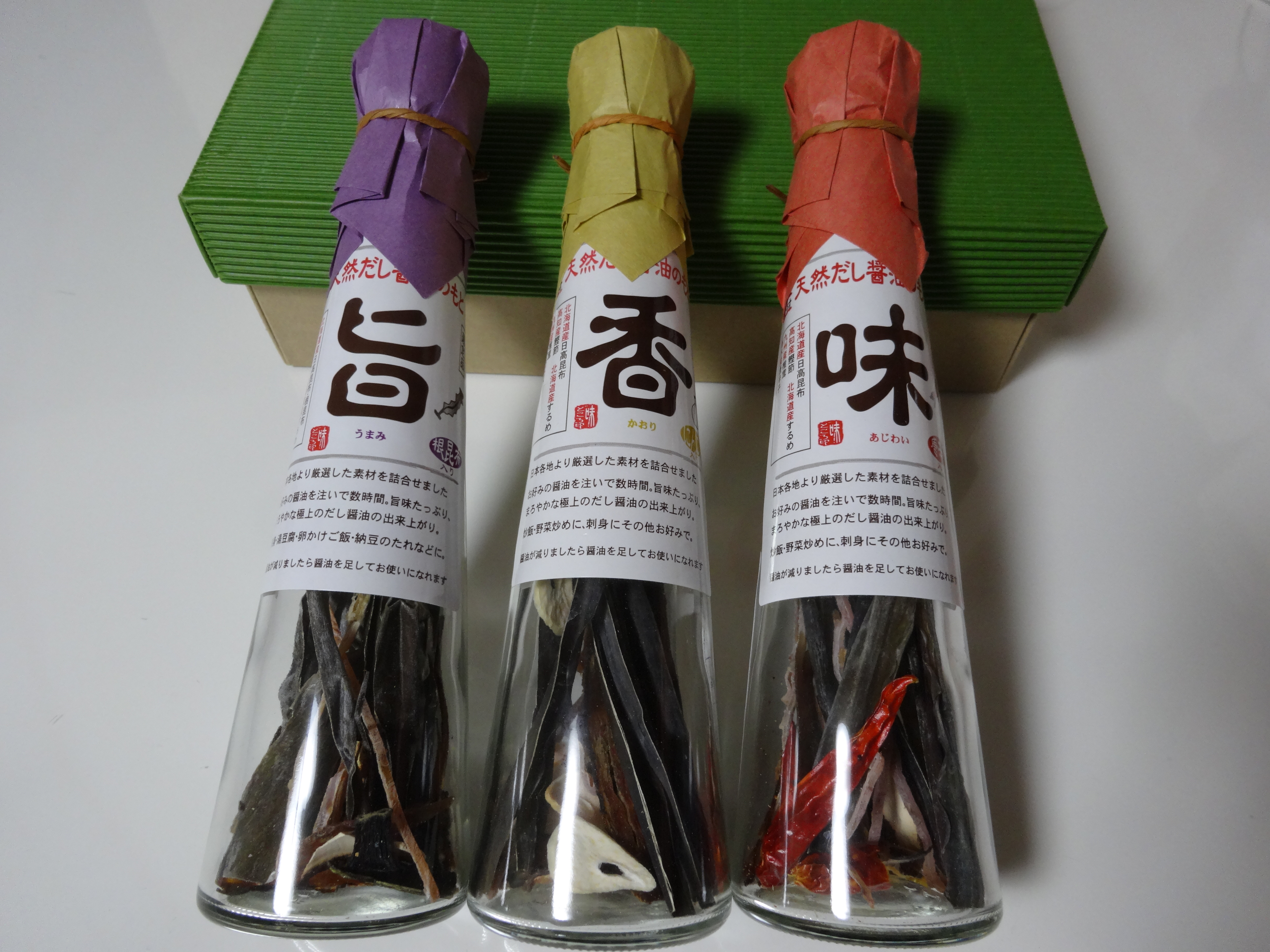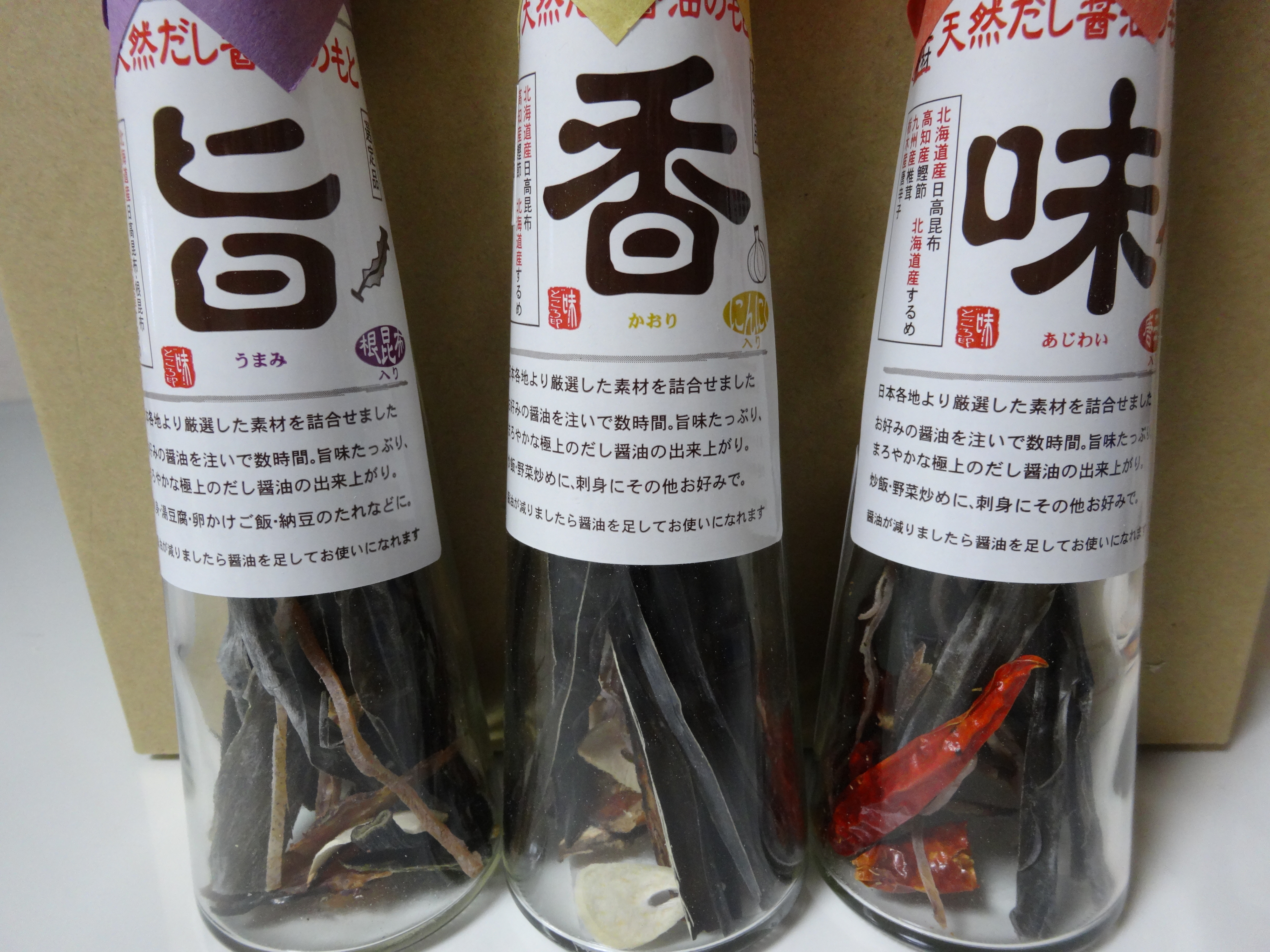 醤油が減ってきたり、だしが強く感じられるようになったら、醤油を注ぎ足して何度か味わえるので、コストパフォーマンスがいいし、《旨》《味》《香》の3本あると、使い分けてお料理に使えるのでとても重宝しそうです。