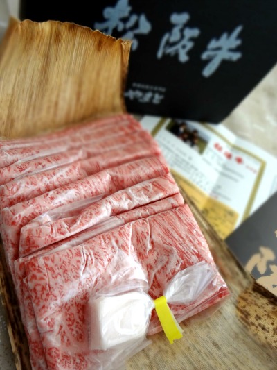 届いたお肉には、松阪牛であることの証明書、パンフレット、すき焼きの食べ方の説明書などが同封されており、お肉も見事な霜降りで一枚一枚丁寧にシートに包んであり食べる前の楽しみが倍増しました。