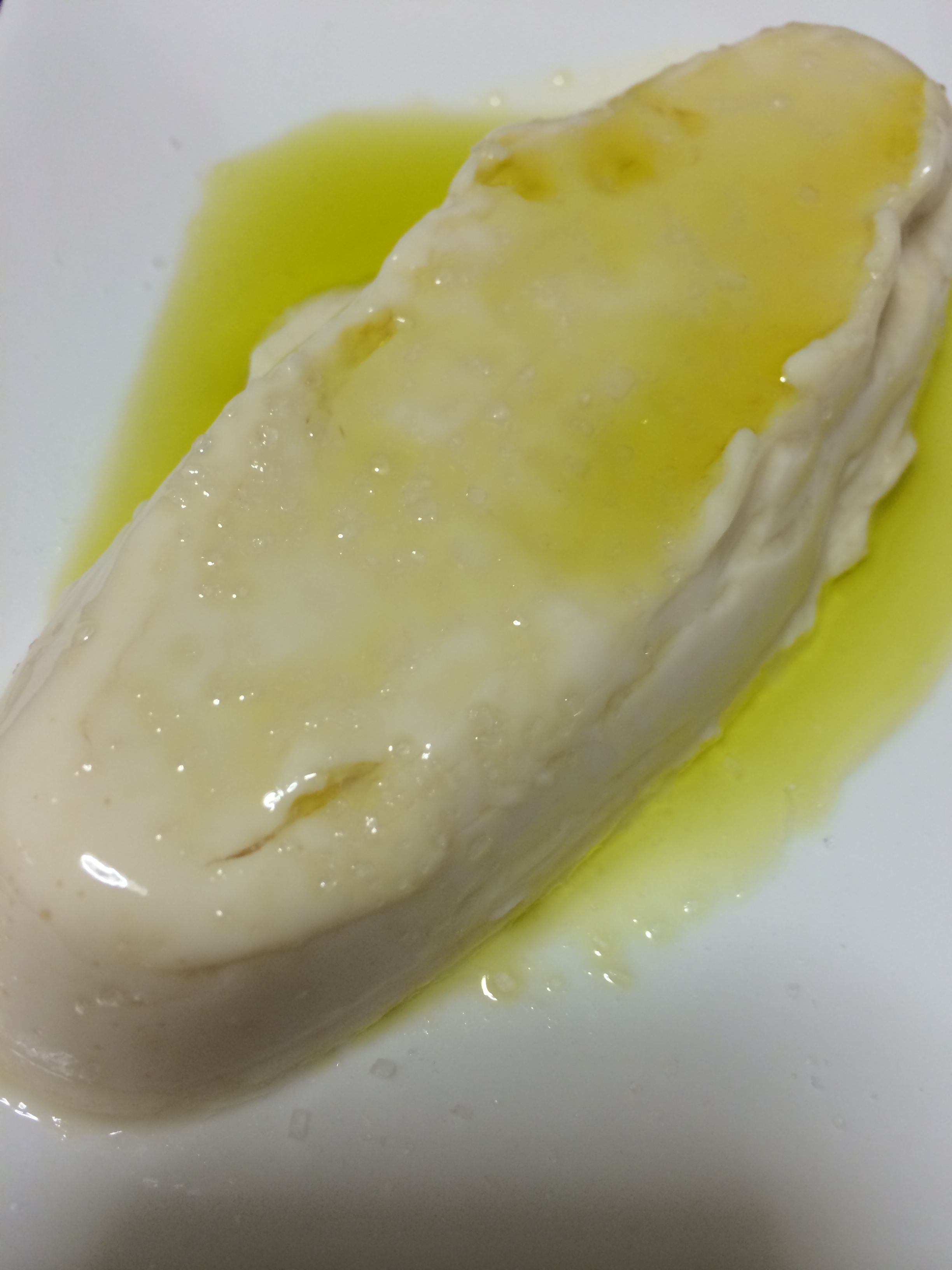 さらに、写真のとおり、質のよい濃い絹ごし豆腐を買ってきて、オリーブオイルと岩塩をかけて食してみました。天然酵母のシンプルなパンにオリーブオイルと岩塩で合わせても最高だと思います。