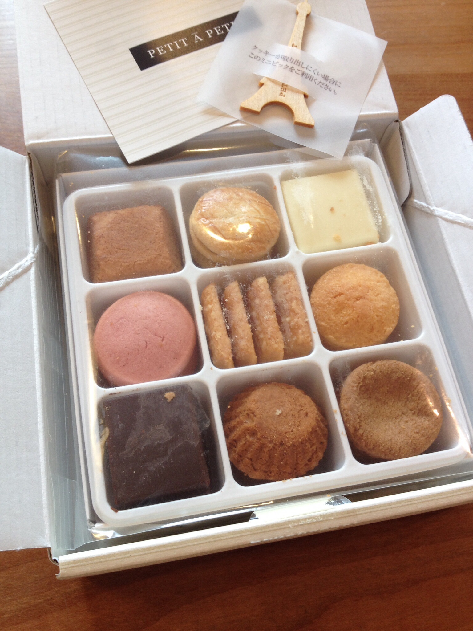 おしゃれで、味わい深い一口サイズのクッキーです。箱を開けると、エッフェル塔のピックを中心に、かわいいひと口クッキーが9種類、パリの石畳のように美しく並んでいます。「プティ・タ・プティ」とは、フランス語で「少しずつ」という意味。それぞれが個性に溢れた味わいです。バリエーション豊富なセットなので食べ比べが楽しめます。味だけでなく見た目も可愛いので、手土産スイーツとしてもおすすめです。