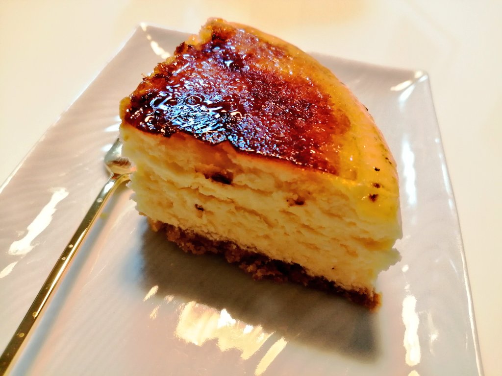 またキャラメリゼした表面のパリパリ食感のハーモニーが楽しめます。チーズケーキとキャラメリゼのほんのりとした苦味が絶妙なバランスで、まさに大人のスイーツという感じです。上のキャラメリゼが黄金色に輝いており見た目も美しく、しっかりとしたチーズのコクがあるのに後味がくどくなくさっぱりとした印象です。