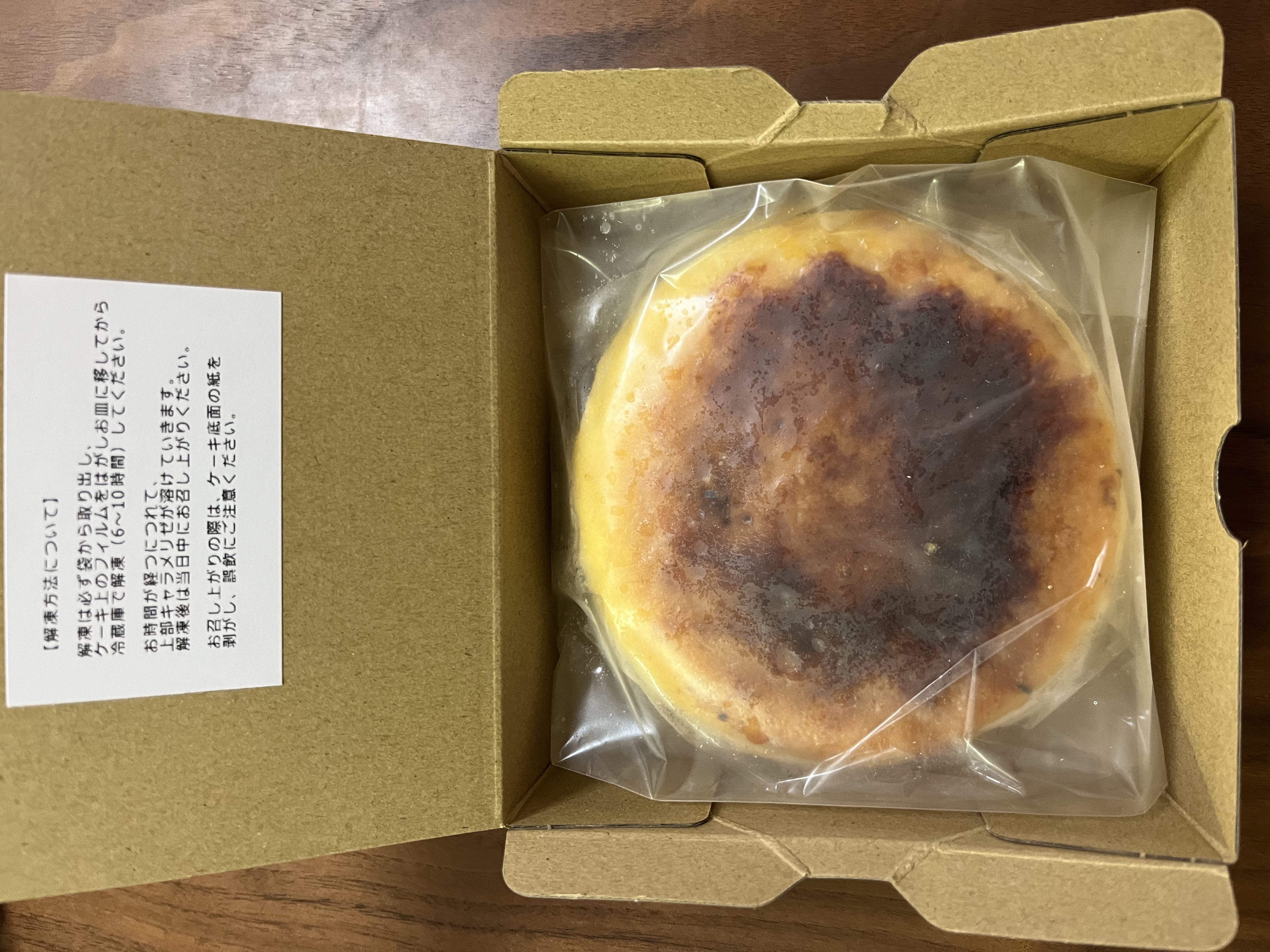 オシャレなボックスに入って届きます。それでまずもう、ワクワク。これは贈答用にもぴったりだなぁと感じました。開けてみると、美味しそうな色に焦げたキャラメリゼが目に飛び込んできて、『はやく食べたい!』とウキウキ。ホームページで拝見した通りの、キレイで美味しそうなチーズケーキです。早速お皿に移し、冷蔵庫で解凍♪夕食後のデザートにいただきました。チーズケーキにバニラビーンズって珍しいですよね?とっても香りが良く、うっとりしました。レモンの酸味もしっかりとあり、濃厚でクリーミーなのに、スッキリした後味でいくらでも食べられそう。口の中でほどけるようななめらかさで、ひとくち味わったらコーヒーでリセットして、またそのなめらかさを味わいたくなる、そんなチーズケーキです。お家時間に贅沢で特別感のあるスイーツタイムを味わうことができました。夫が言うには、『いい意味でチーズケーキっぽくない!珍しい食感がおいしい!』そうです。見た目、味ともに申し分なく、手間ひまかけて作られたスイーツなんだなということがしっかりわかるので、ご家庭での記念日やご自身へのご褒美、贈り物などに最適だと思いました。また食べたいです!サイズは贅沢にいただくなら1/2、デザートやティータイムには1/4がひとり分かなぁと思います。