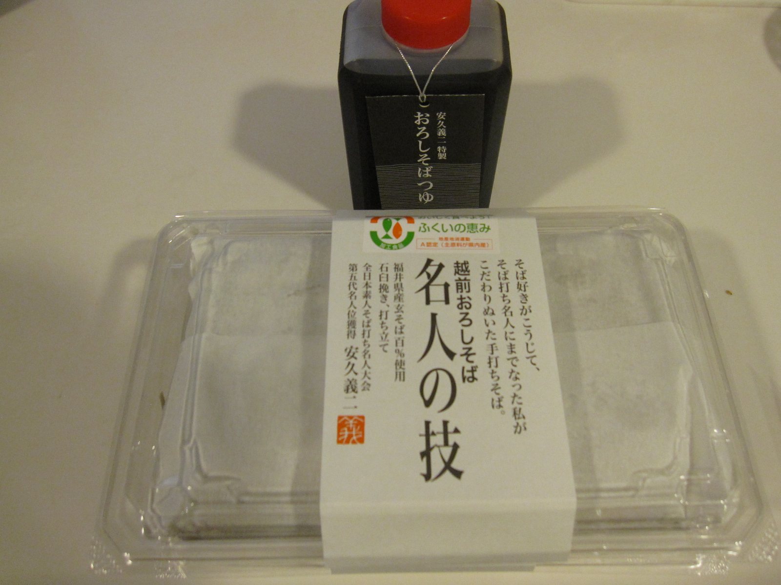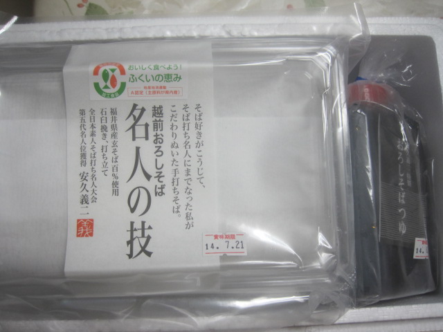 福井県でも最も美味しいといわれている奥越(大野・勝山)産玄蕎麦を石臼挽きしたそば粉を全日本素人そば打ち名人大会第5代名人安久義二が打ち立てを真空パックにしできるだけ早めにお手元にお届けします。挽きたて・打ちたて・ゆがき立てを特製つゆで味わってください。大根おろしをかけて”おろしそば”でどうぞ!