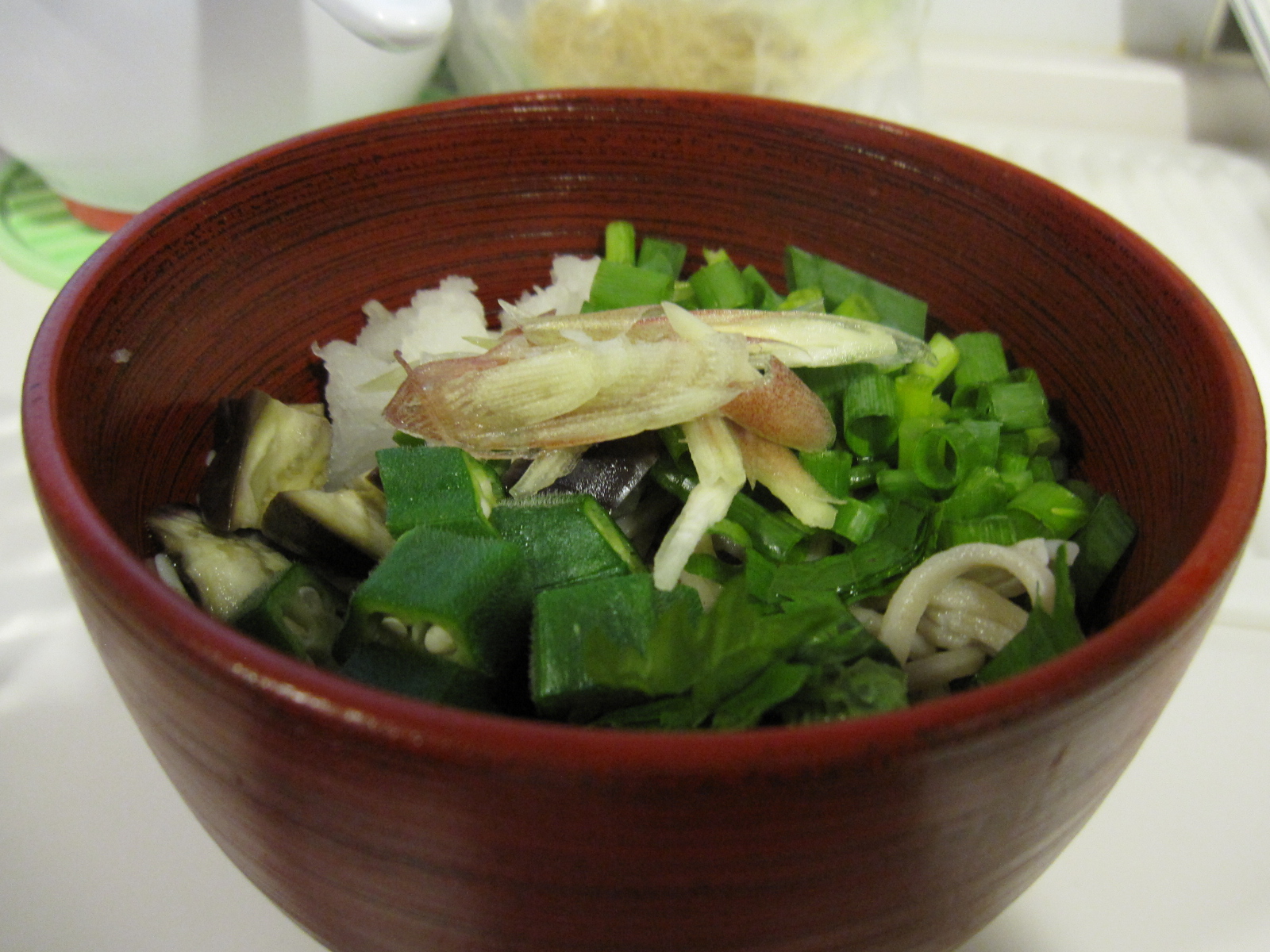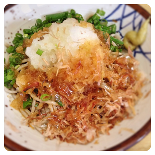 2分程度で茹で上がり、お蕎麦の上に大根おろし、ねぎ、オクラ等トッピングしてみました。
