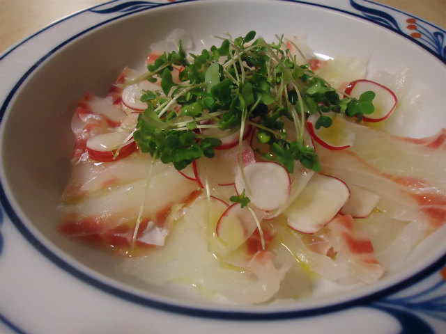 写真は、真鯛のカルパッチョですが、オリーブオイルの香りがいつもと違い深みがあります。