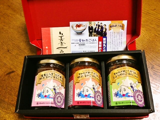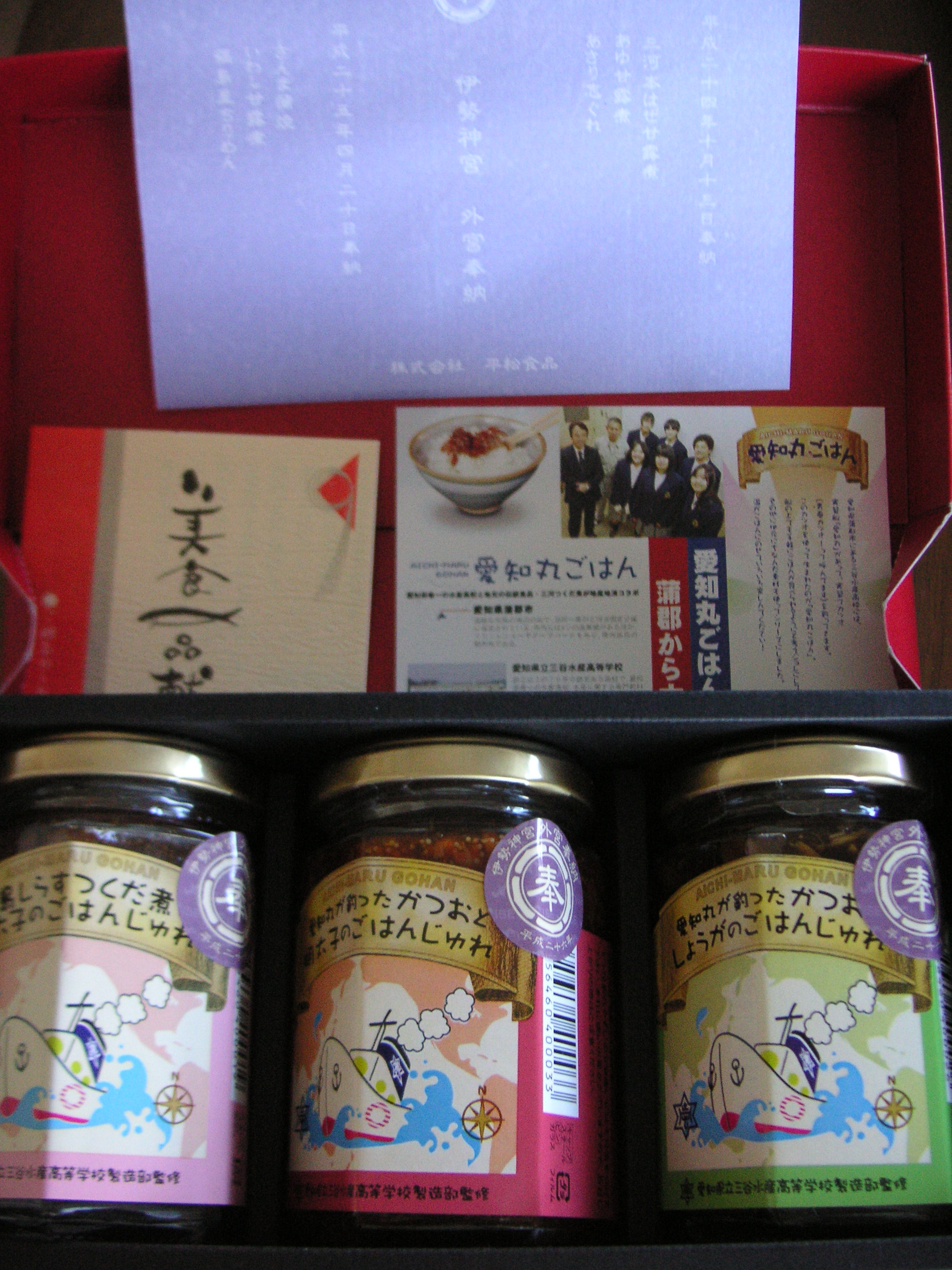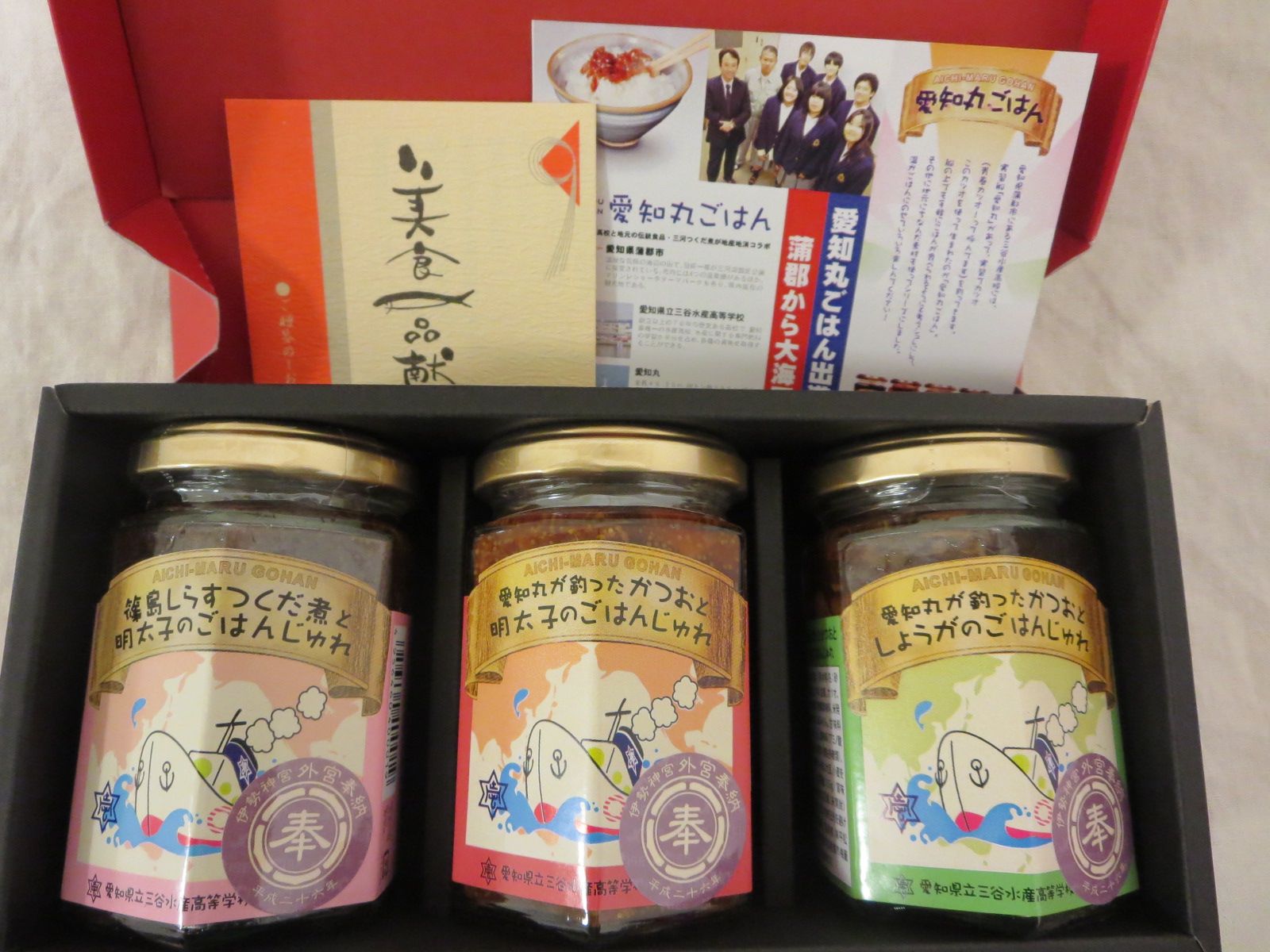 愛知県唯一の水産高校の生徒との共同開発商品である「愛知丸ごはん」が3本セットになったギフト商品。同商品は高校生が漁業実習で釣ったカツオなどと醤油ベースのジュレ状のタレを合わせた新感覚のつくだ煮です。温かいご飯にのせるとジュレが溶け出します。味は、しらすと明太子、かつおと明太子、かつおとしょうがの3種類。
