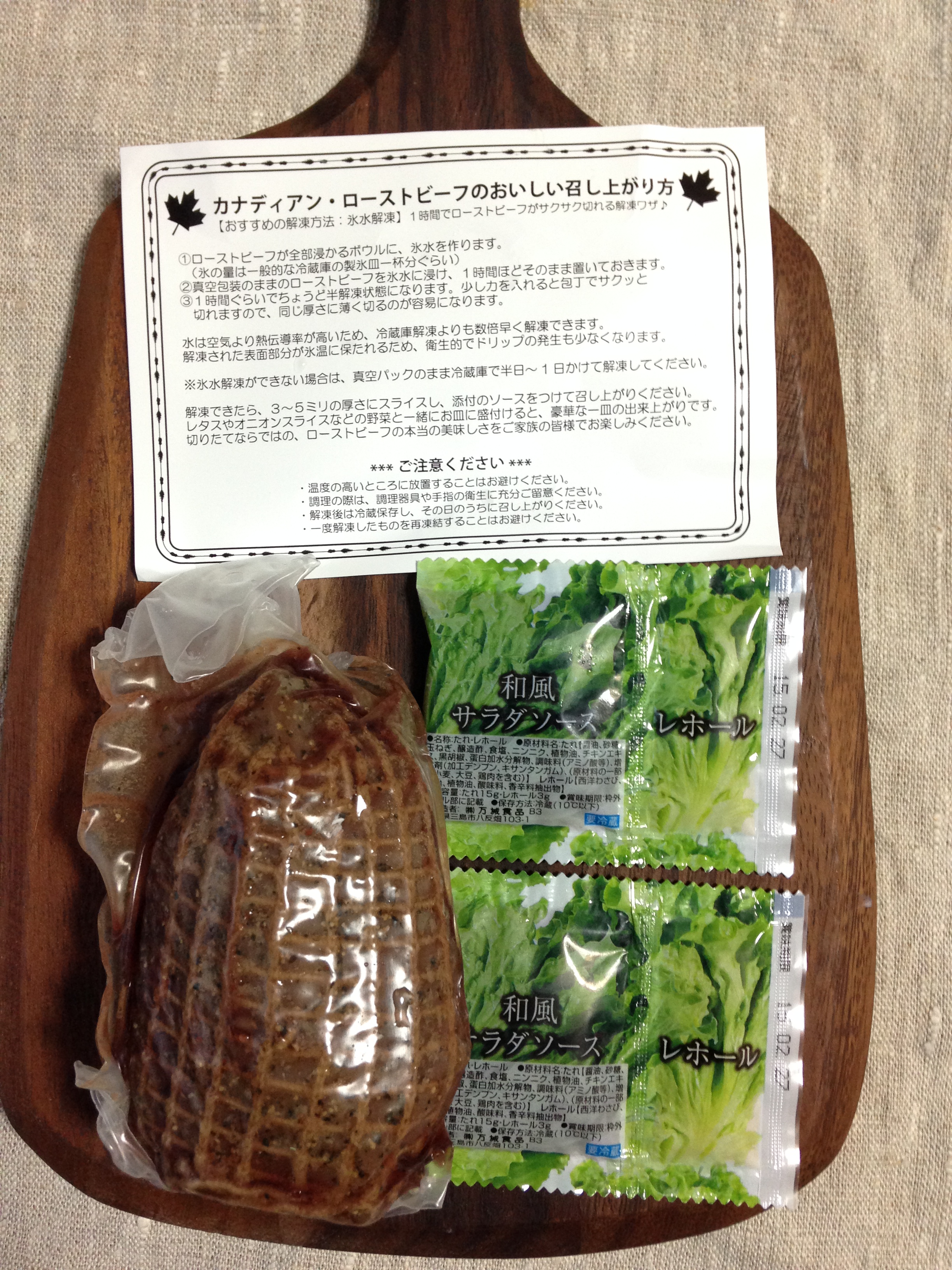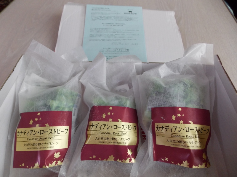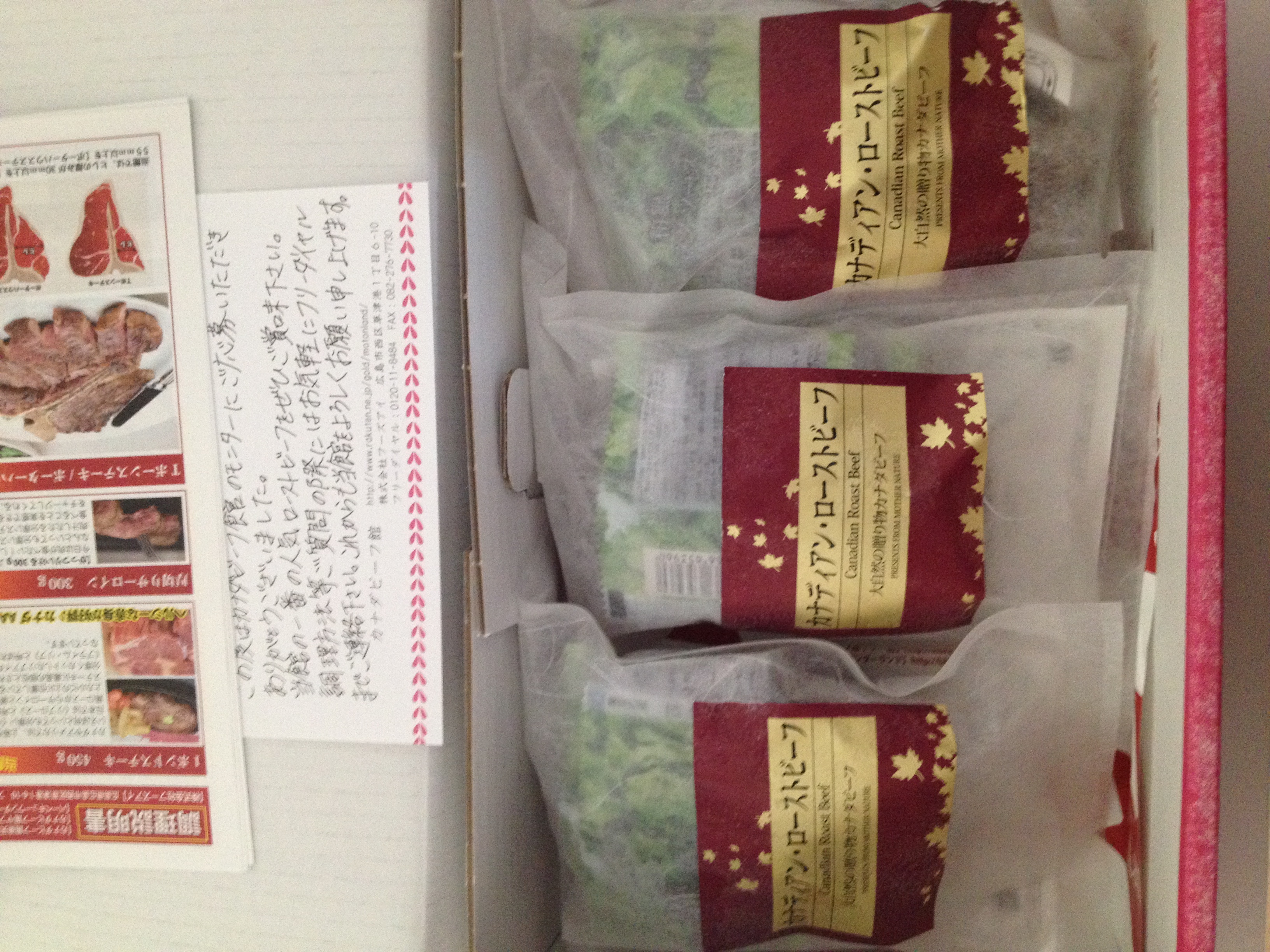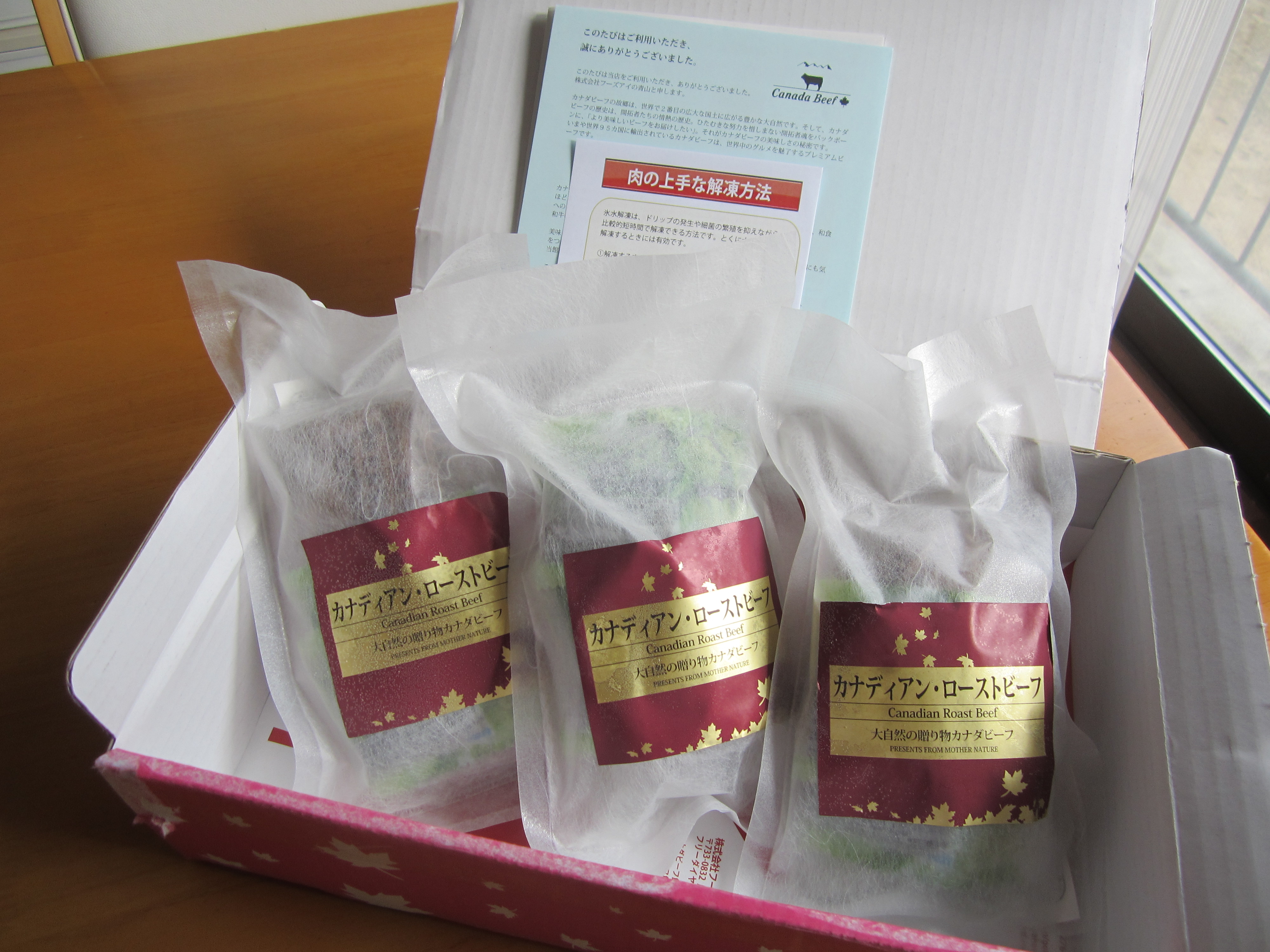 期日通り、クール便で届きました。カナダの国旗にあしらわれている、楓のマークが配された箱にローストビーフと説明書きが添えられていました。お肉の解凍方法も書かれていて、初心者でもおいしい状態で味わえるよう気遣いがされているなあと感じました。