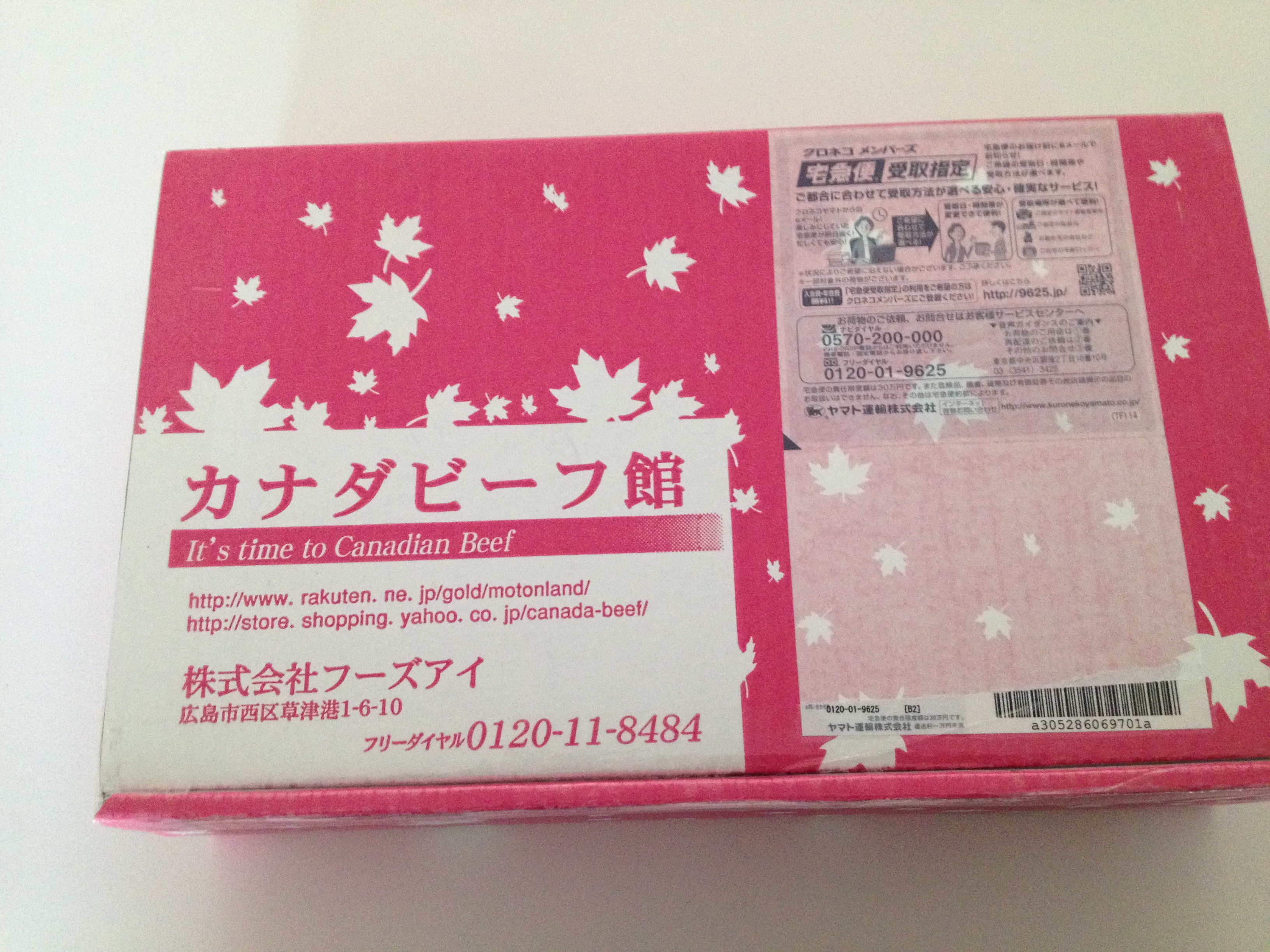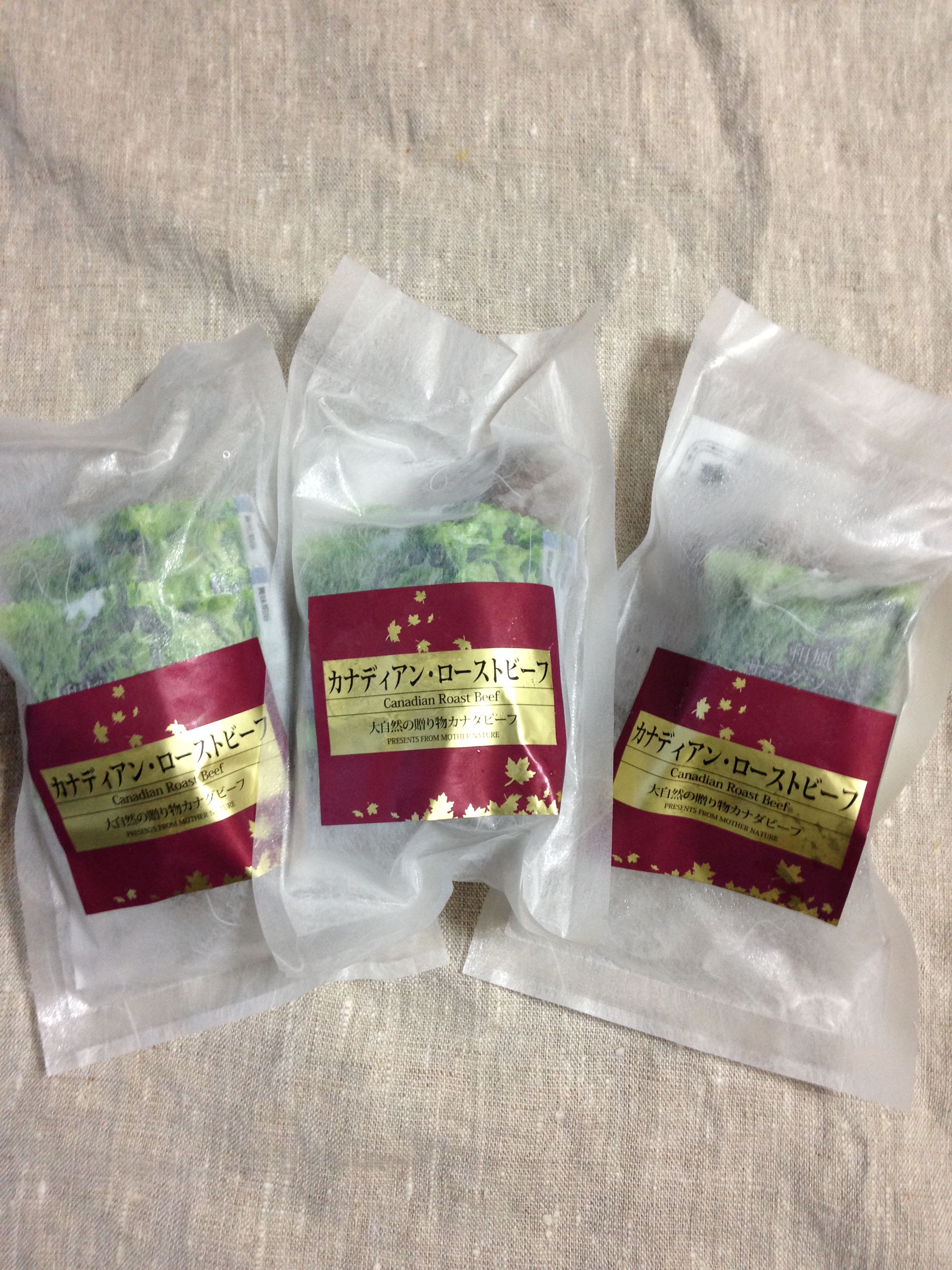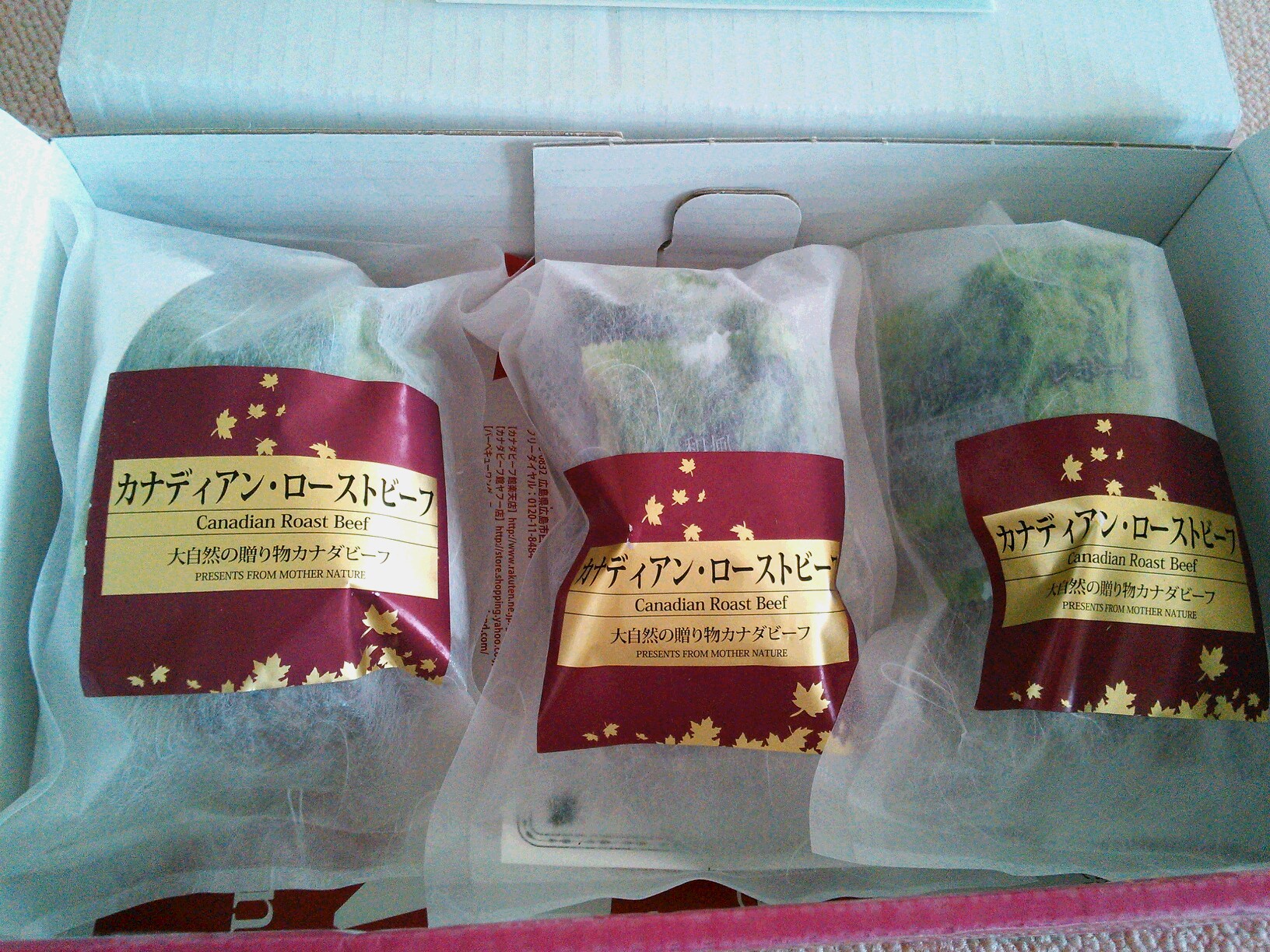 期日通り、クール便で届きました。カナダの国旗にあしらわれている、楓のマークが配された箱にローストビーフと説明書きが添えられていました。お肉の解凍方法も書かれていて、初心者でもおいしい状態で味わえるよう気遣いがされているなあと感じました。