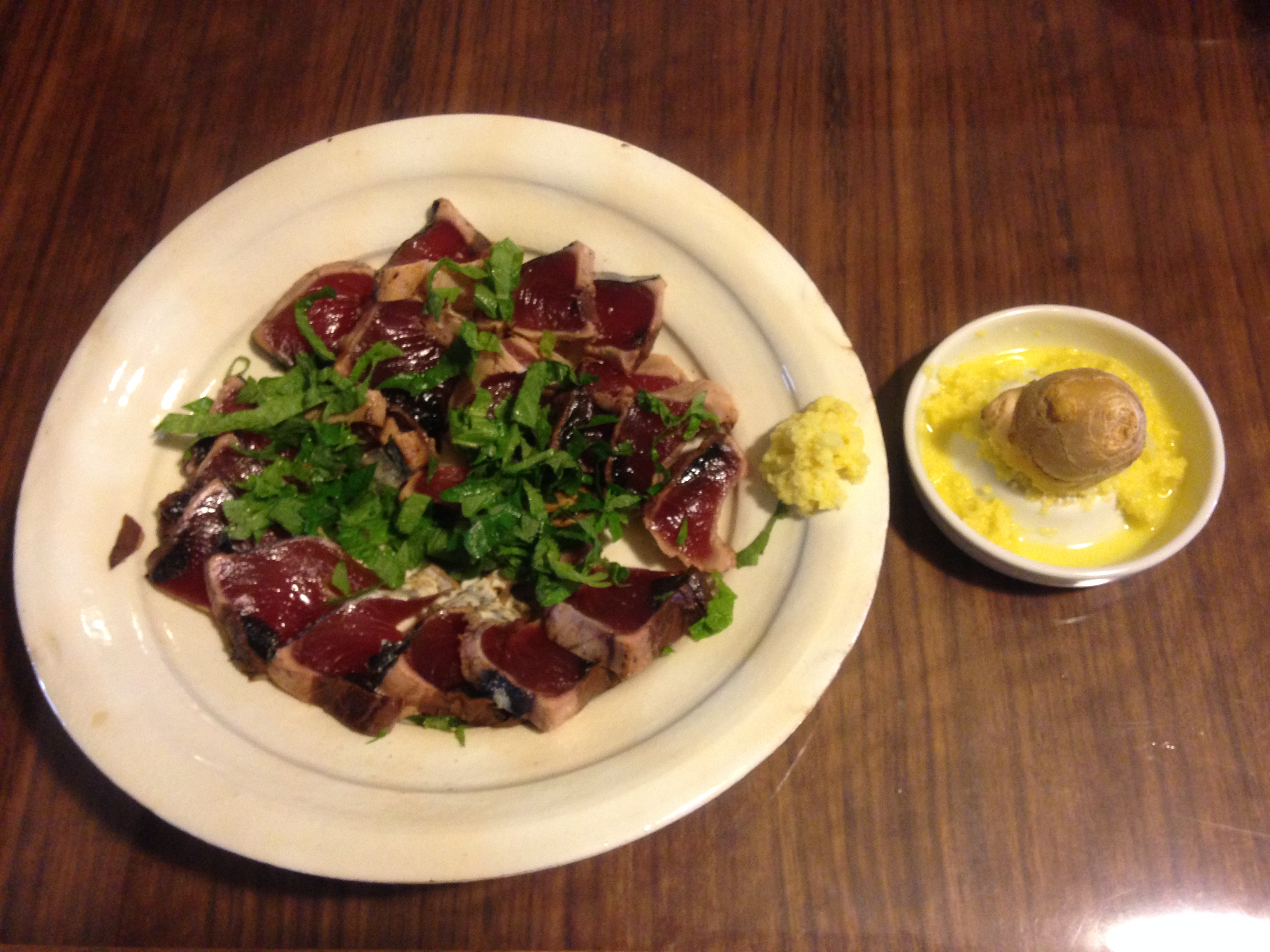 この黄金生姜、本当に黄金色でした。そして、筋が少ない!擦りやすい!そして辛い!!最近の生姜って何か辛みがないのが多くて、この黄金生姜を頂いたとき、すっかり忘れていた本来の生姜の味の記憶が一瞬で甦りました。「そうだ、生姜って辛いんだよね!」って感じでした。まず、生姜を美味しく頂く為にカツオのタタキを用意しました!!筋がなくて、口当たりが良くて、辛みがしっかりあって、本当に美味しい生姜です。色もきれいな黄金色、こちらも食欲をそそります!次はどうやっていただこうかと考えるのもまた楽しいです。そして、そのまま頂くだけでなく、甘酢に付けたりして保存しようかと考え中です。