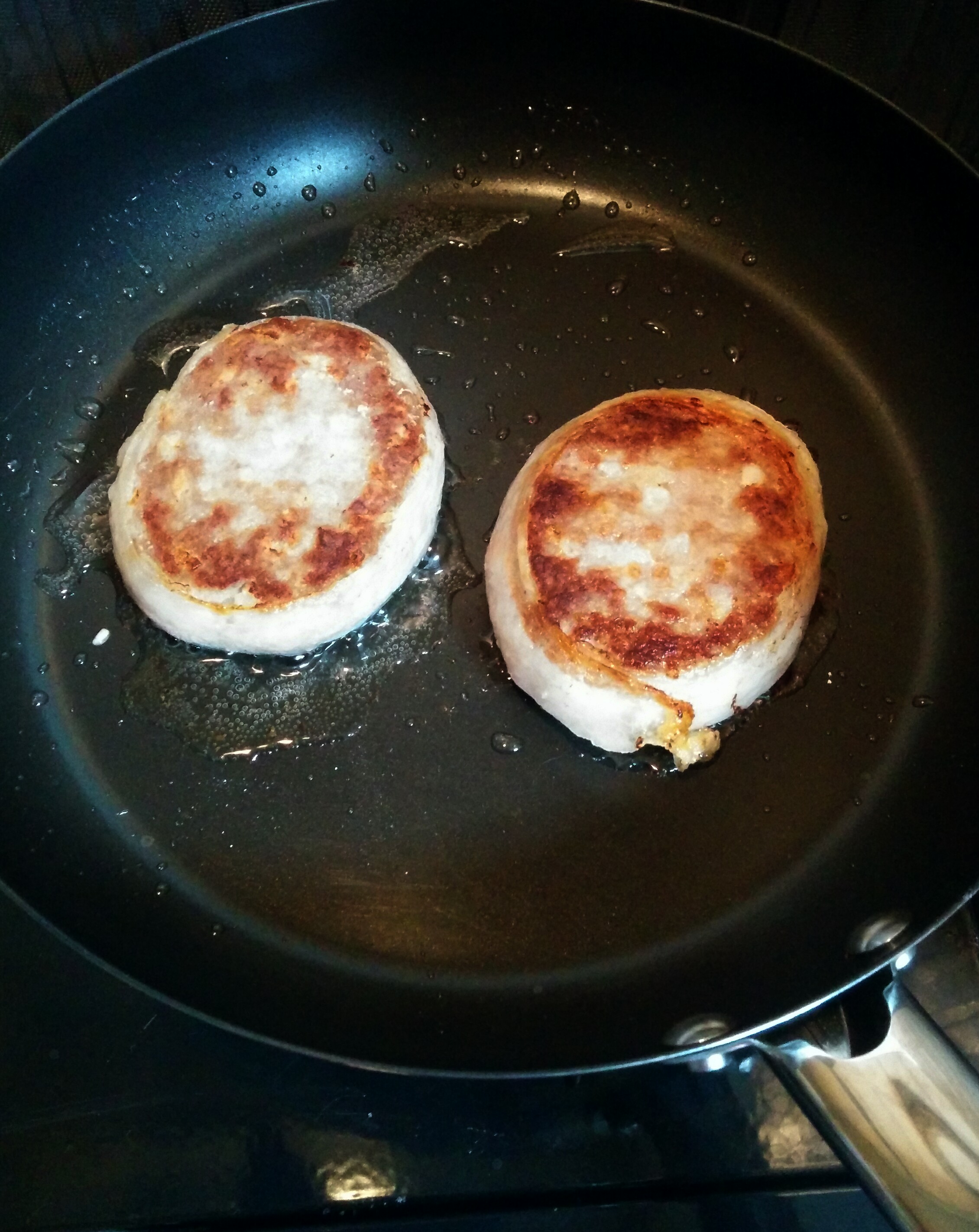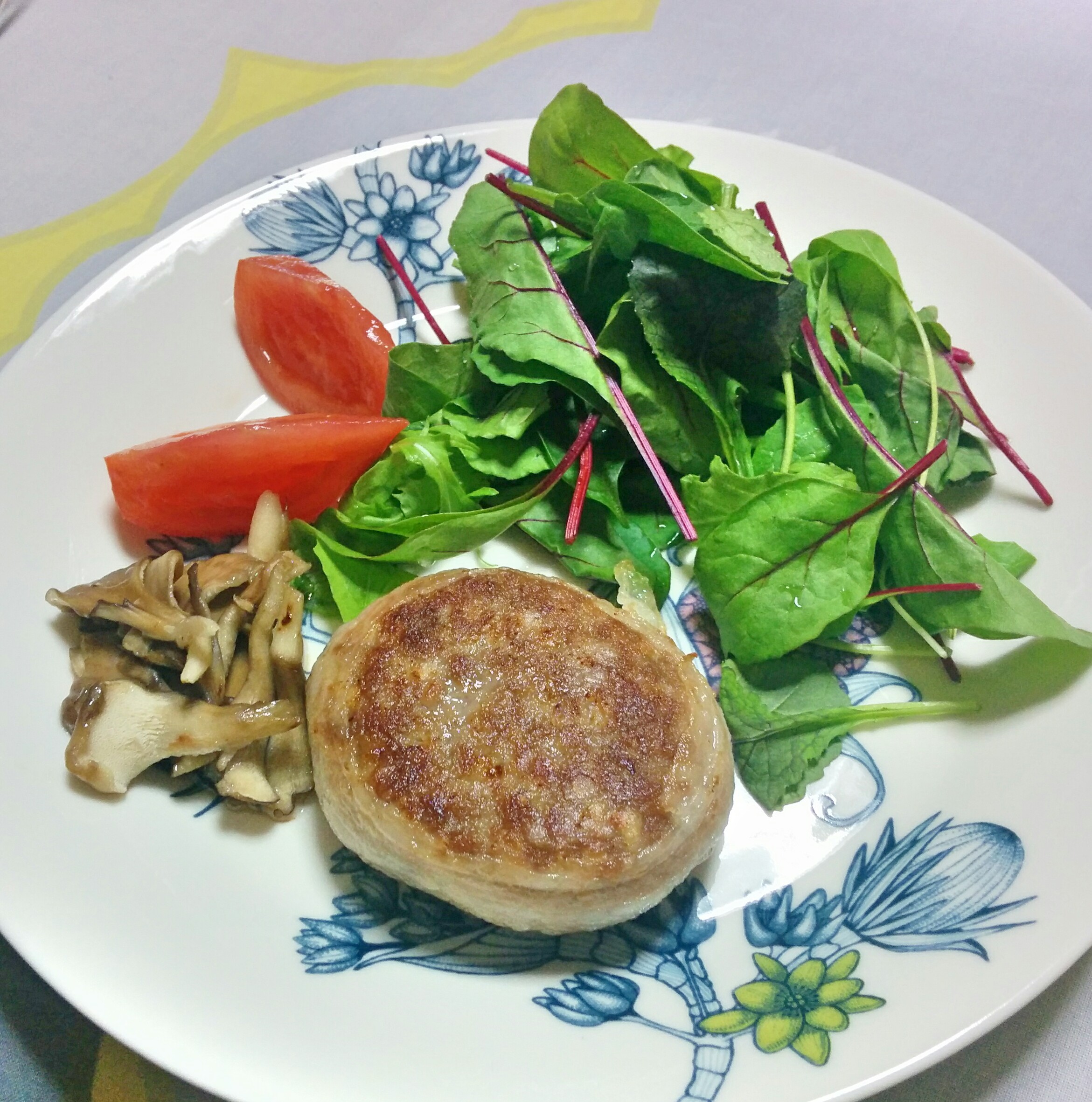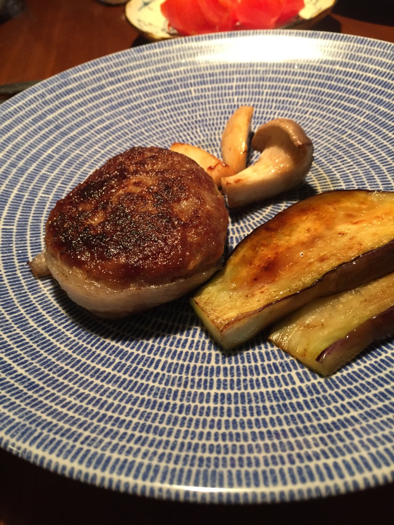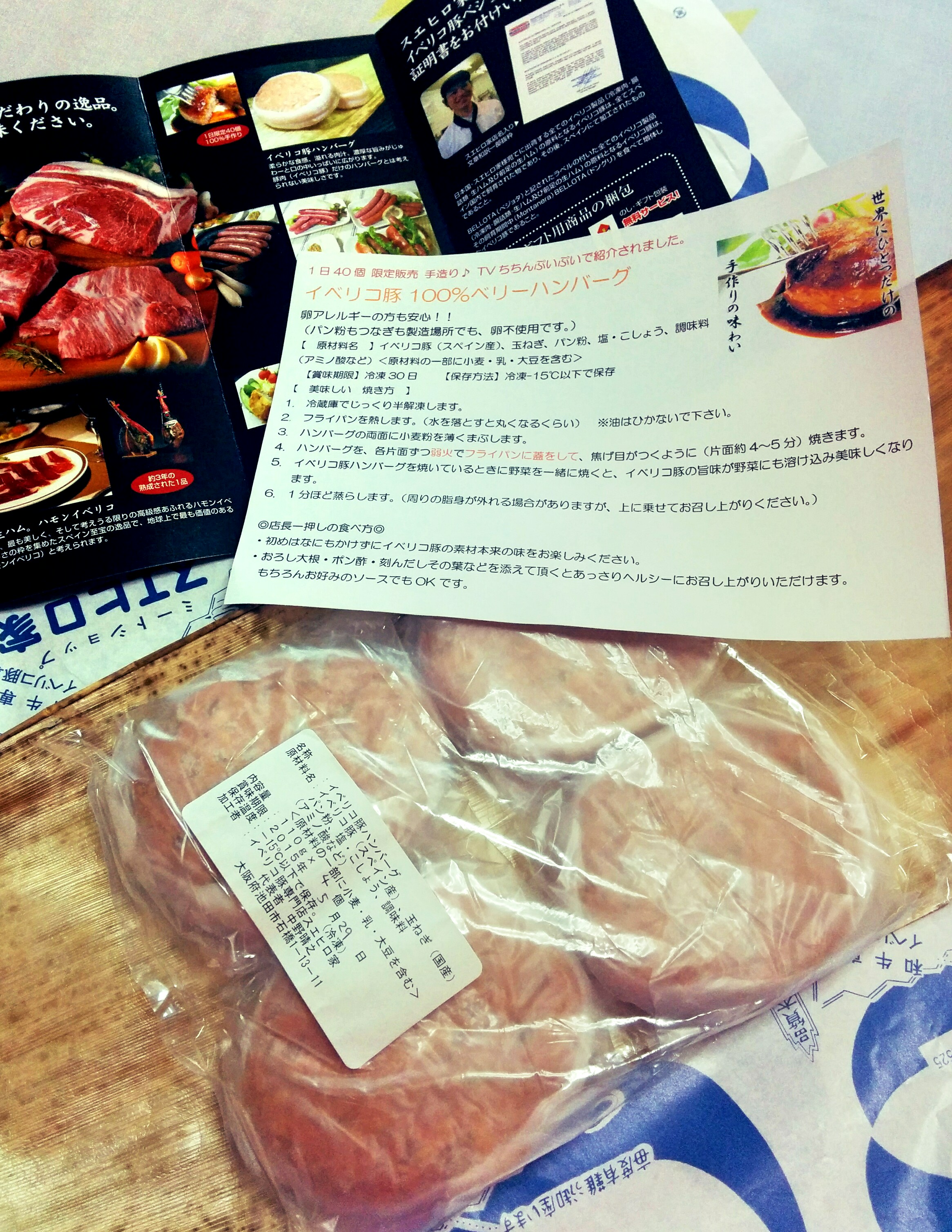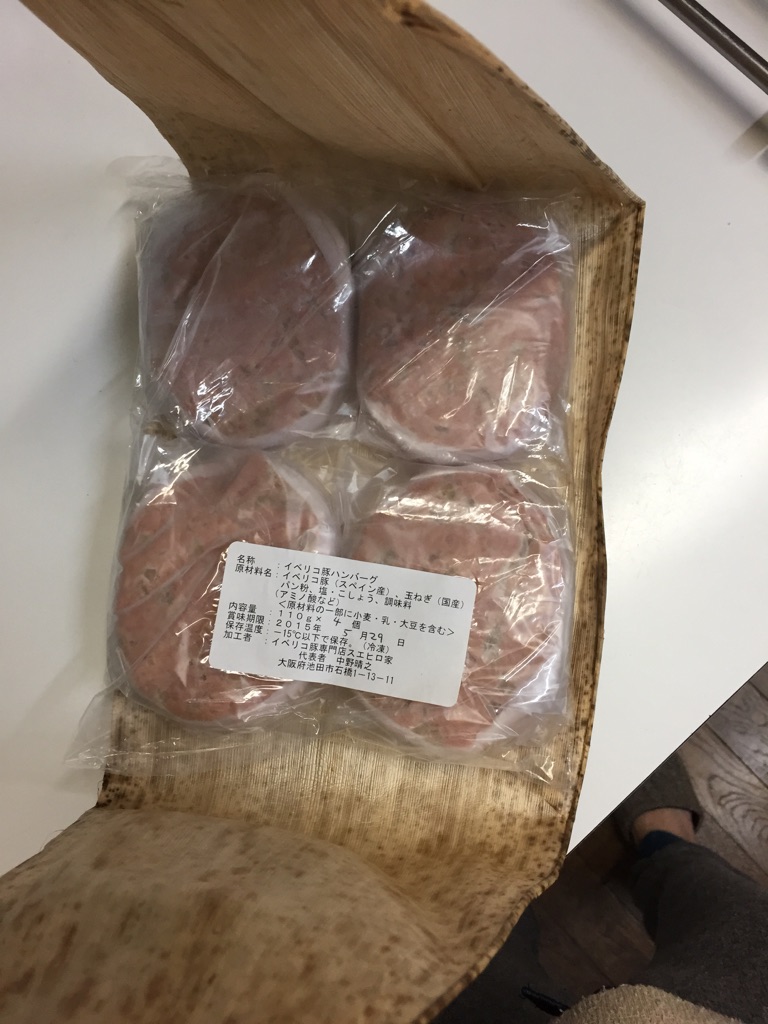 冷凍で届いたハンバーグを冷蔵庫で半解凍にして、早速晩ごはんにいただきました。商品と一緒にハンバーグのレシピ(焼き方)が入っているので安心です。油はひかないで焼くとのことでフライパンにひっつかないか心配でしたが、ハンバーグからイベリコ豚の脂がじゅわっとあふれ出てきて全く問題なしでした。レシピに野菜を一緒に焼くとおいしいと書いてあるのに気付き、ハンバーグを裏返す時にあわててマイタケを投入(笑)