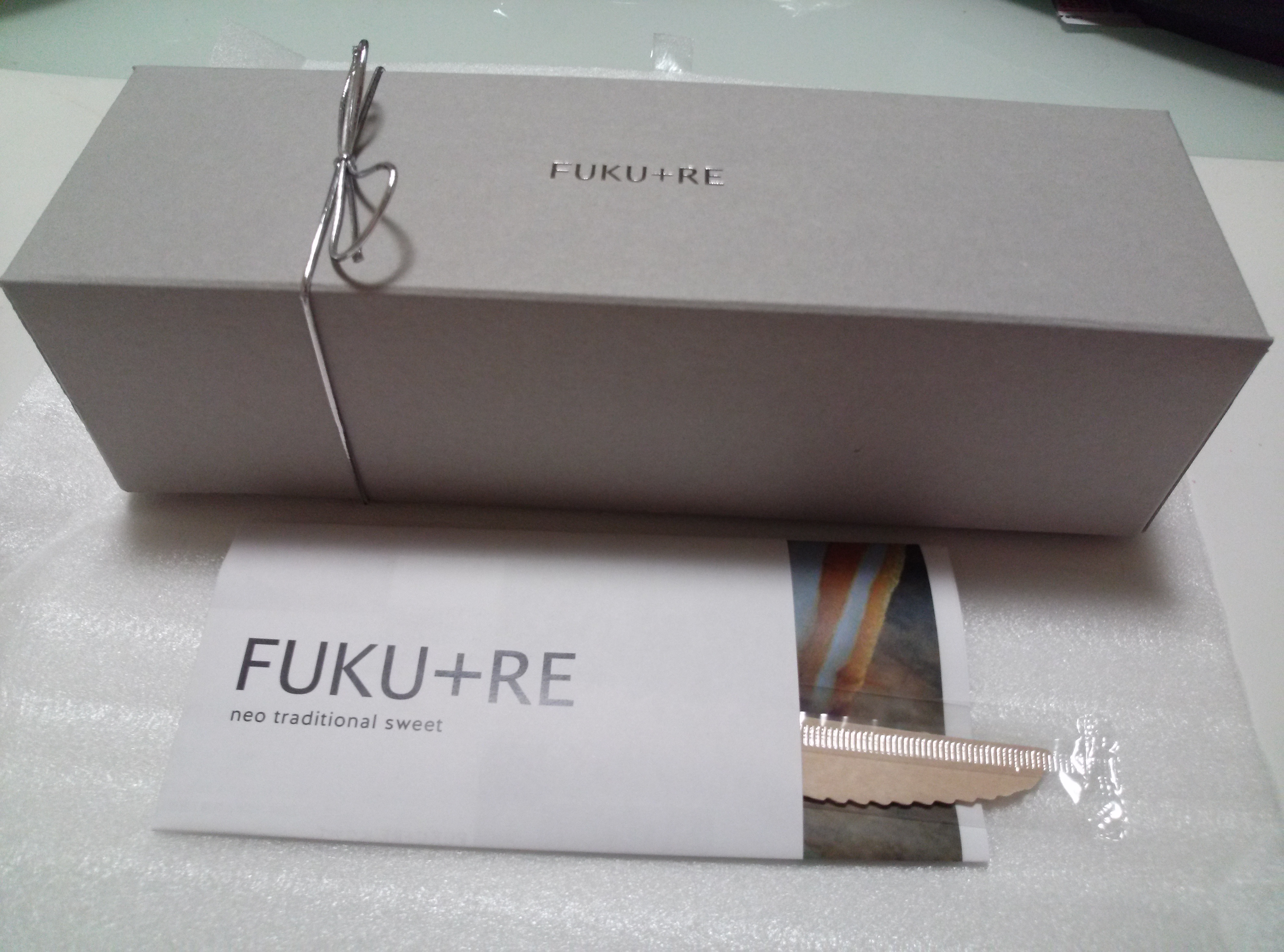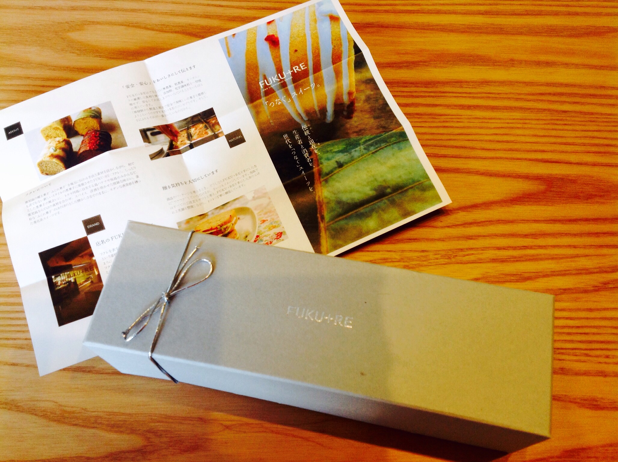 届きました♪「FUKU+RE」のみ印字されたシンプルな箱に入っているので、開けるまで中身が全くわかりません。サイズからして母親はロールケーキ?と言っていました。