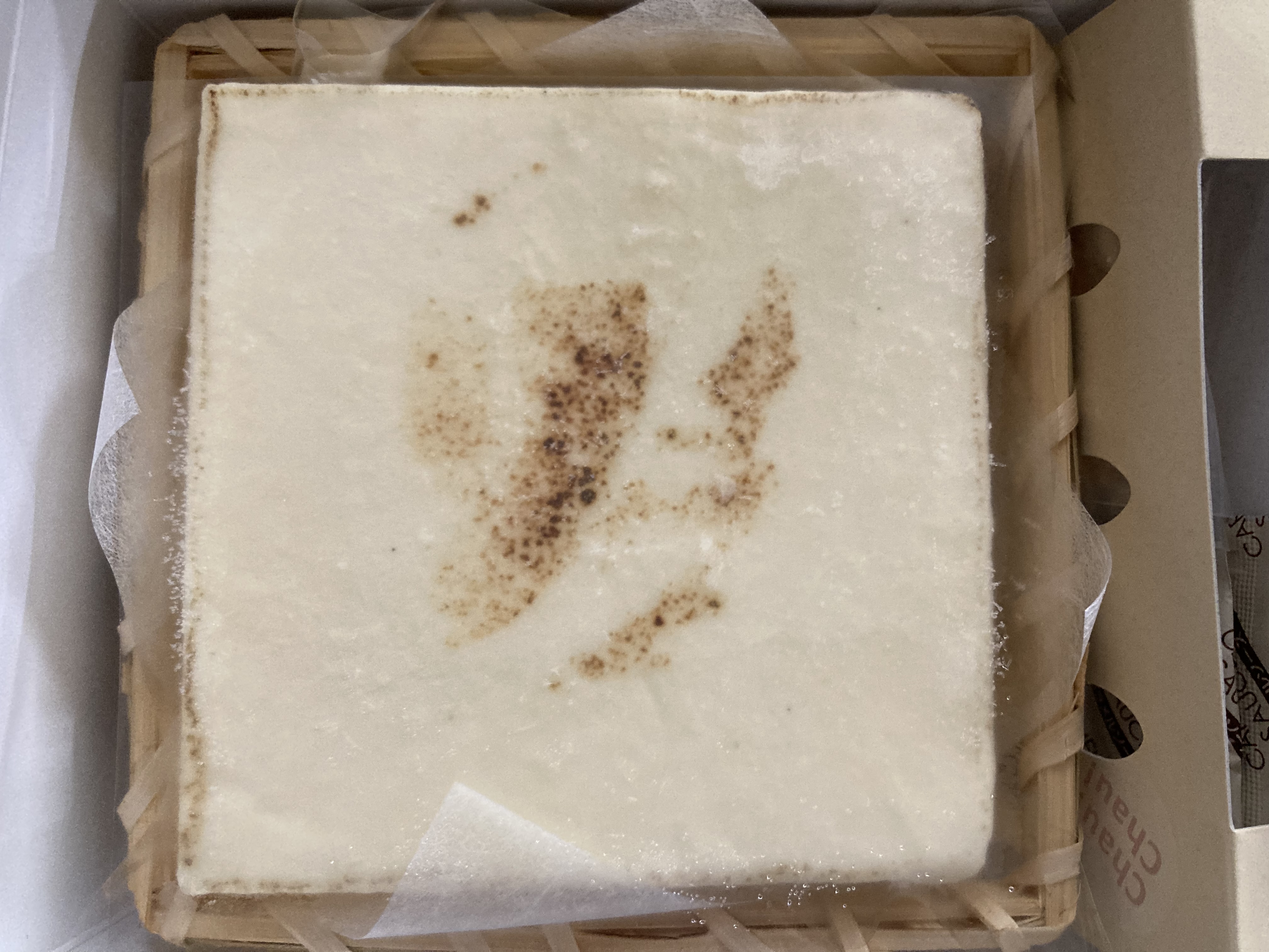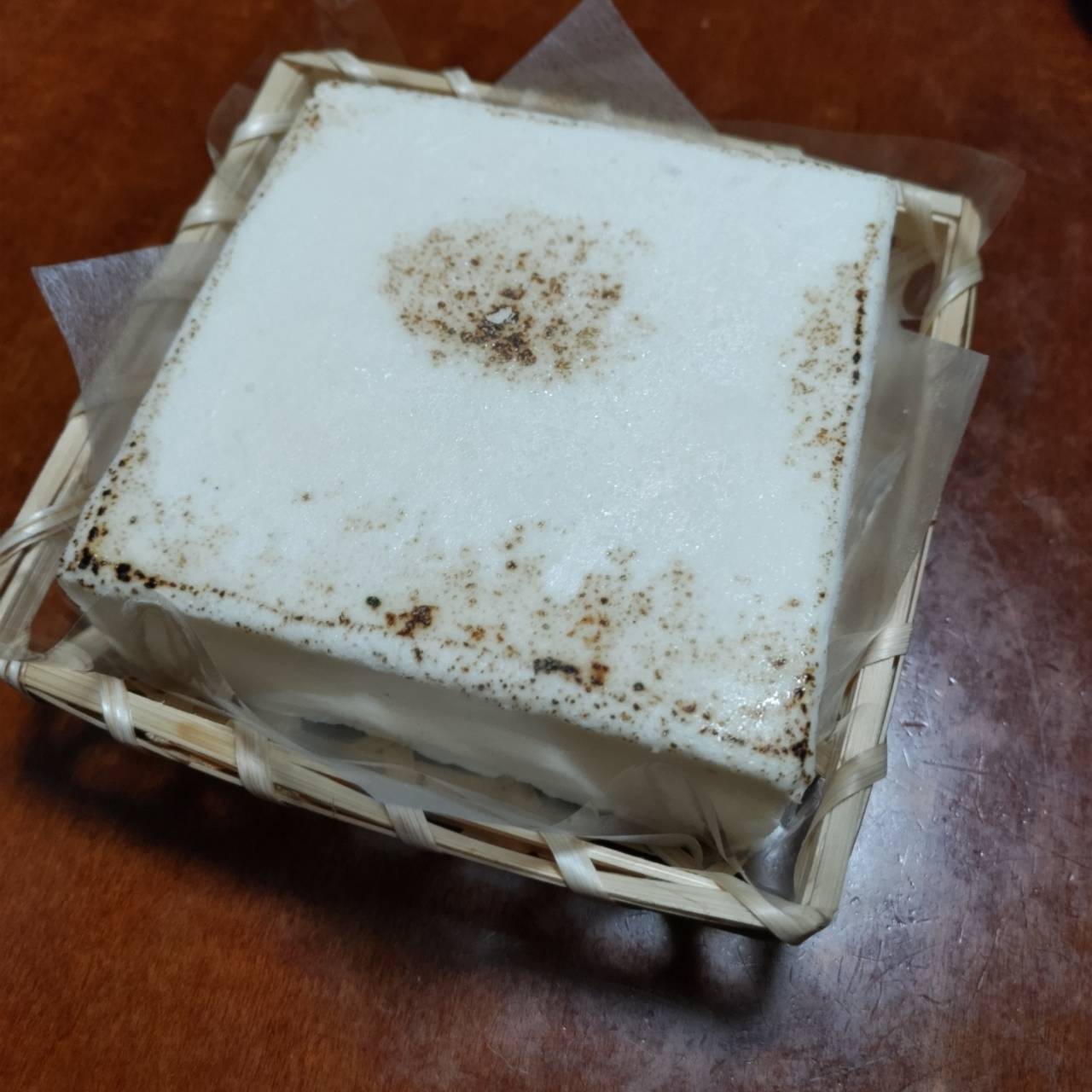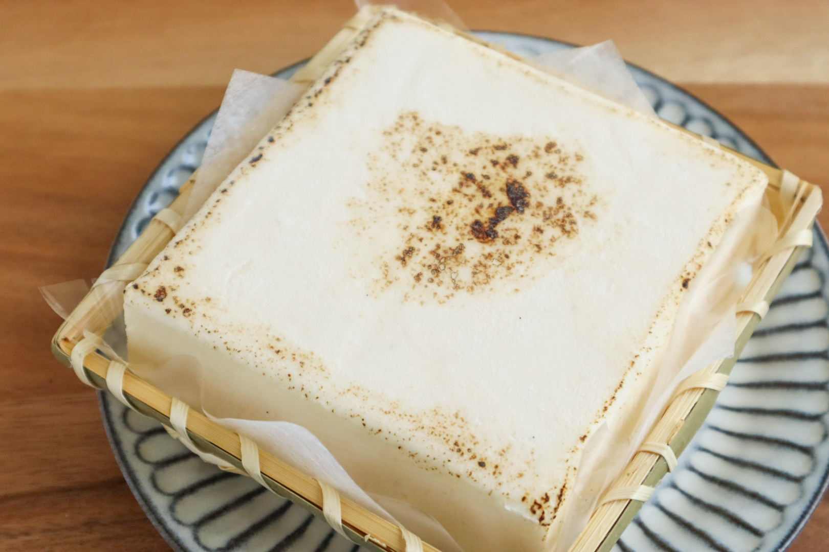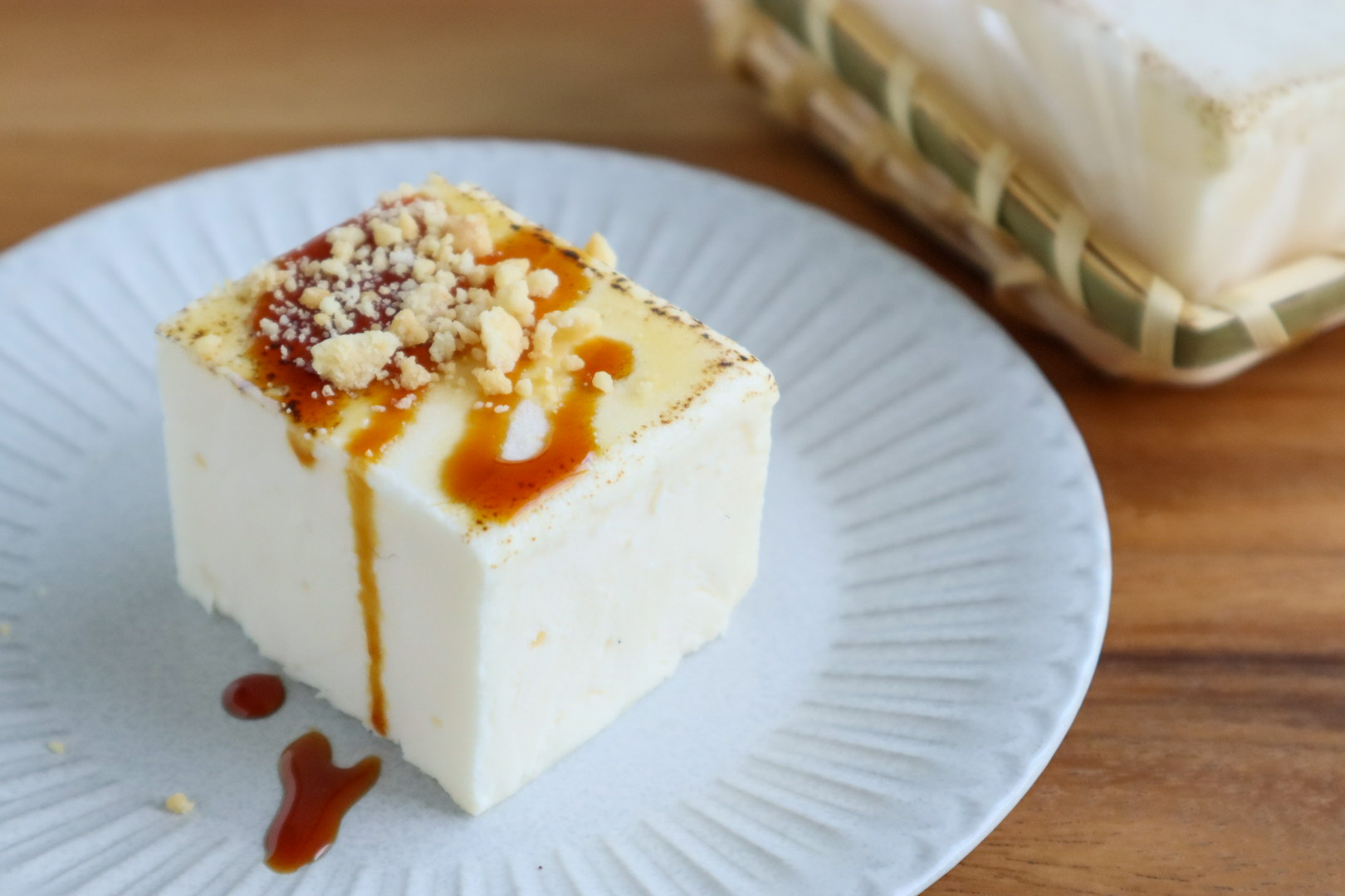 京都産のなめらか豆腐と、北海道産のクリームチーズを使った「レアチーズケーキ」です。見た目は、焼き豆腐にそっくり!食べるとふわふわのムースのような舌触りで、豆腐の風味が自然に馴染み、口に入れた瞬間にフワっと溶けていきます。半解凍でしゃりっとシャーベット状、冷蔵解凍でふわふわムースのチーズケーキ。生姜クランチとキャラメルシロップをトッピングすると味変が楽しめます。メディアでも多数取り上げられた、一味違う新感覚スイーツです。