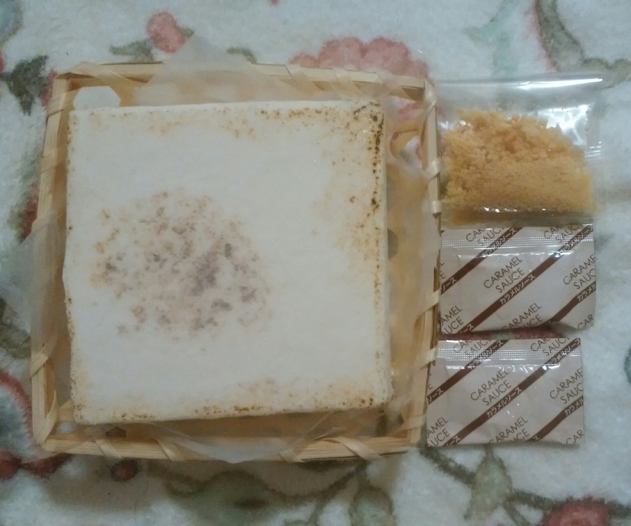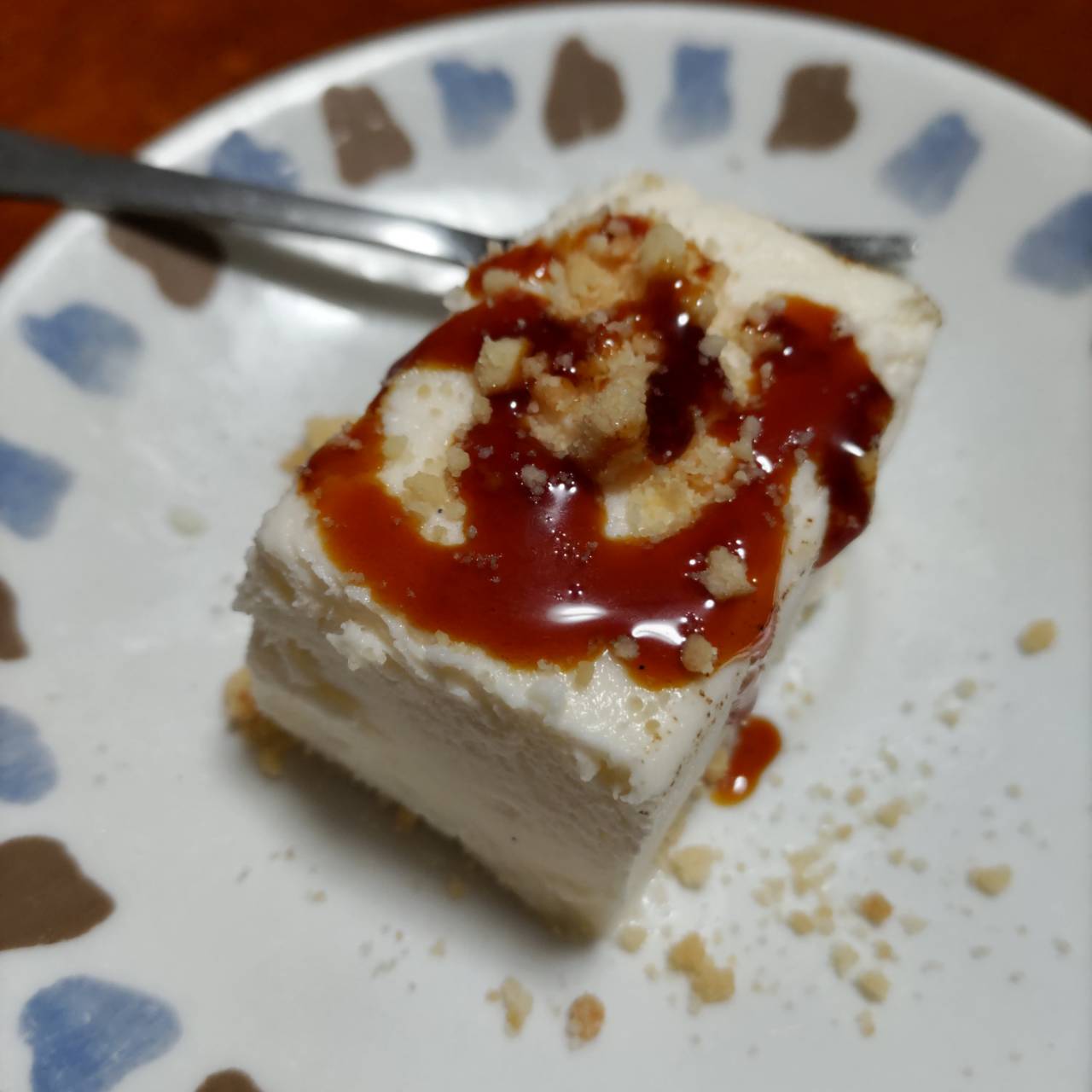 キャラメルシロップと生姜クランチもついています。生姜クランチはやさしい生姜の香りで、ちょうど良いアクセントになってくれます。キャラメルシロップはしっかりとした甘さをプラスしてくれるので、まろやかなレアチーズケーキととても良く合います。