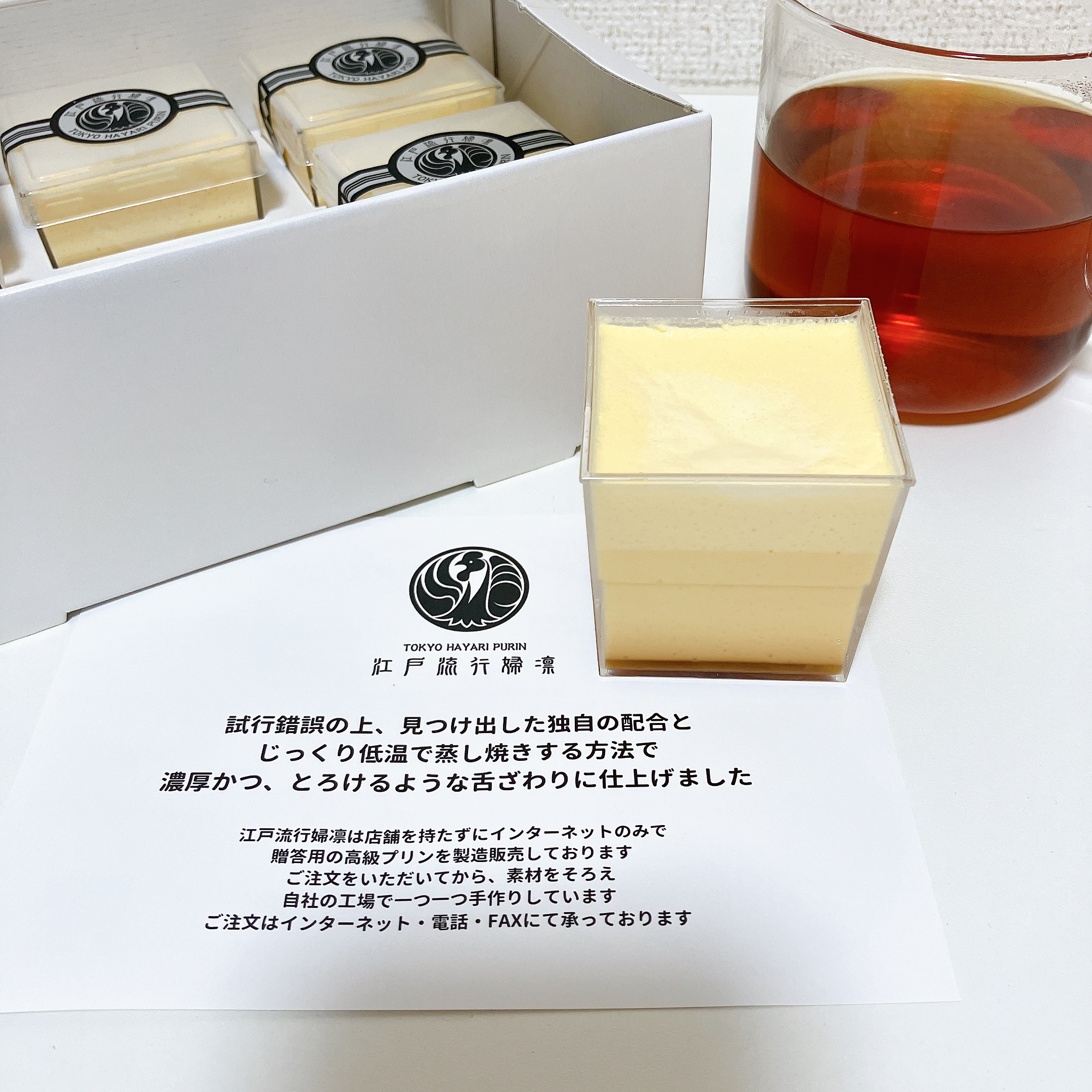 大切な人への手土産は勿論、自分や家族へのご褒美にも絶対に喜ばれる、とても特別感のある江戸流行婦凛です。まだ江戸流行婦凛を知らない人や食べた事のない人達にも是非食べてほしいと思う絶品のプリンでした。とても美味しく頂きました、ご馳走様でした。