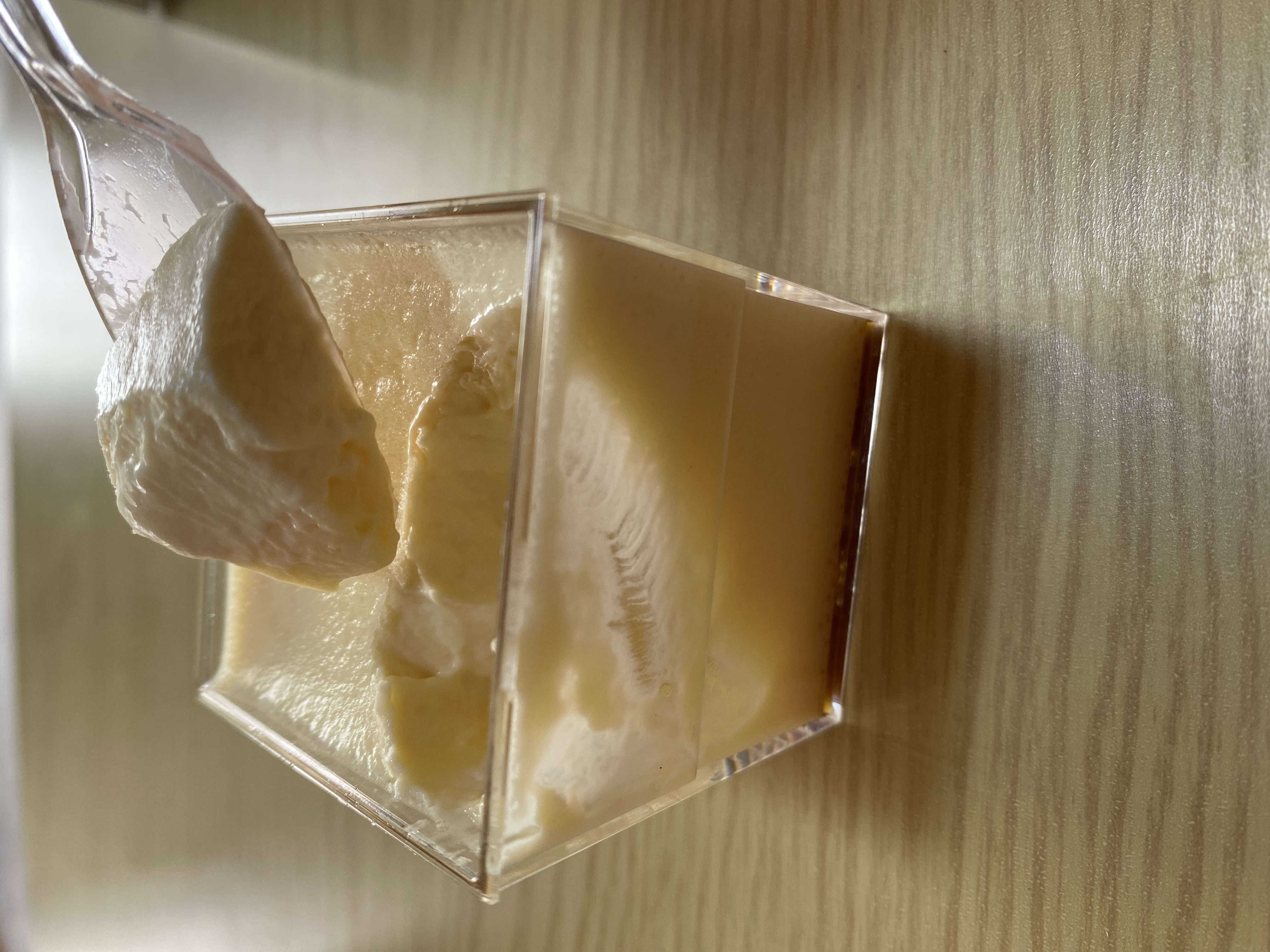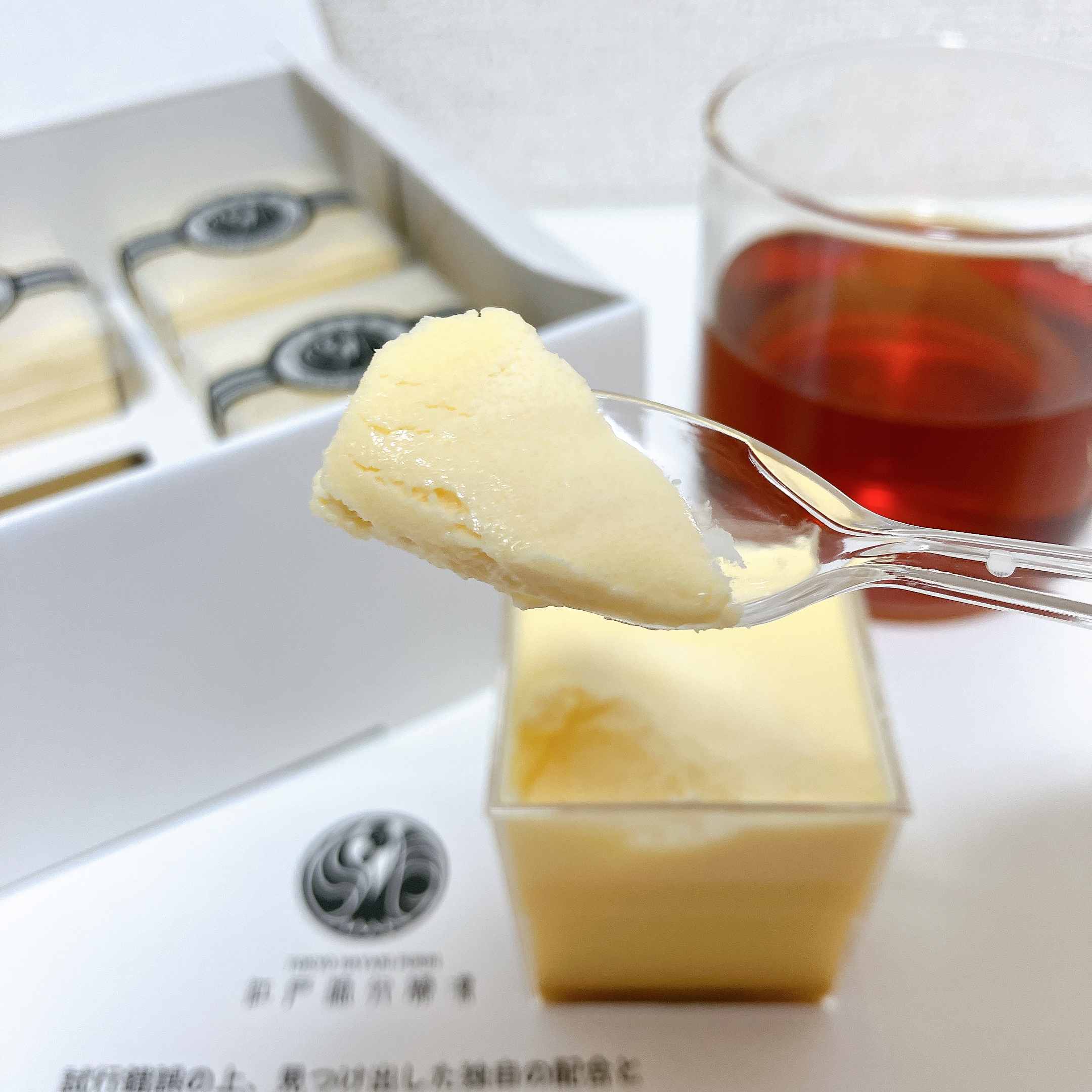 では早速食べてみましょう。プリンの上層部は濃厚でコク深く滑らかなトロリとした生クリームの風合いを楽しめます。下層部は卵の風味を強く感じるぷりんぷりんの蒸しプリンの食感です。そしてサラッとしたカラメルのほんのりとした苦味がアクセントとなり、全体を一つに取り纏めています。
