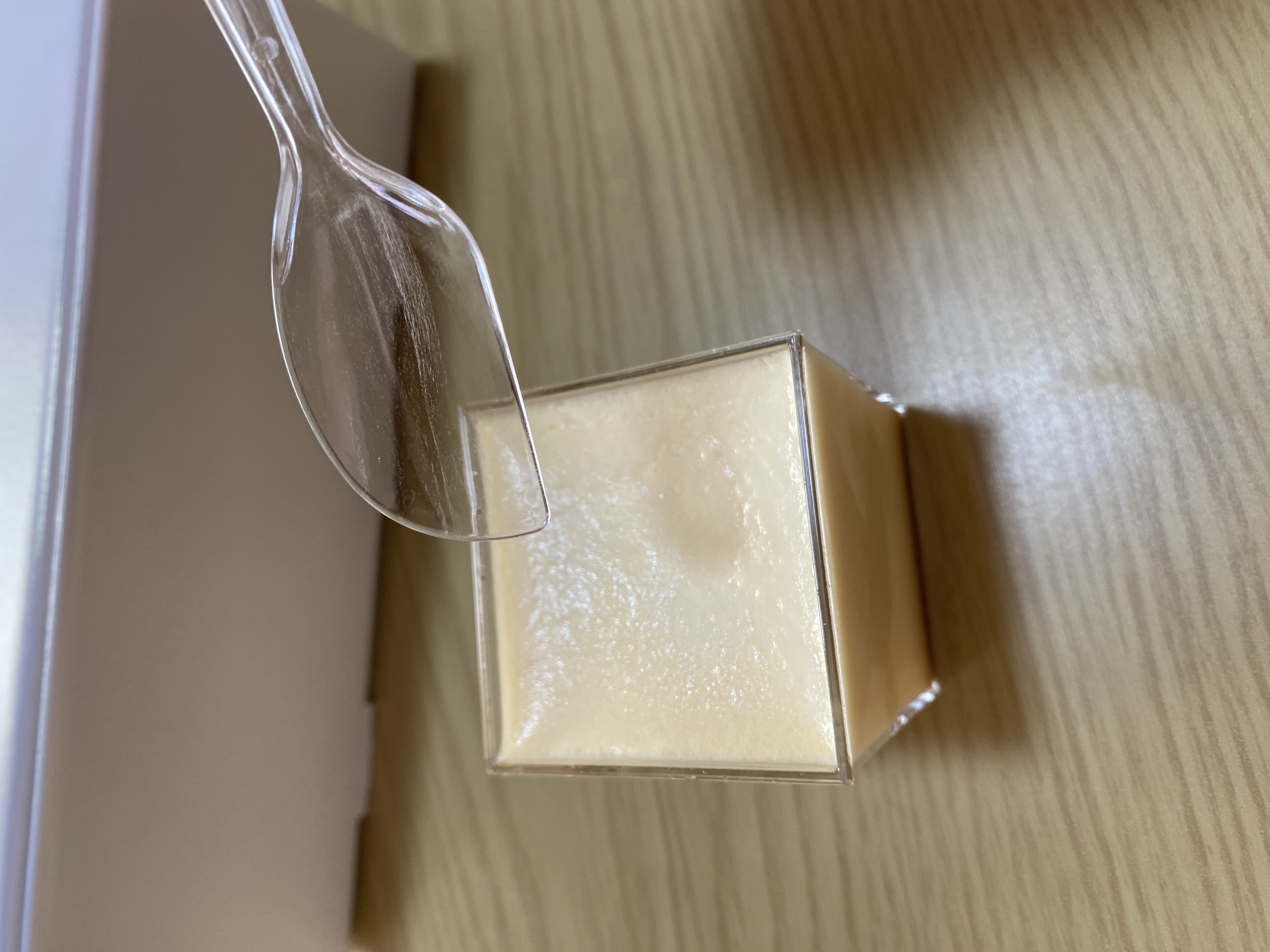 この江戸流行婦凛ならではの四角いプラ容器がとても素敵です。付属のスプーンはリーフ型スプーンと言って、このプリンの四角い容器の特殊な形の角までしっかりすくって食べられる仕様になっています。