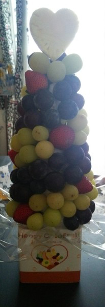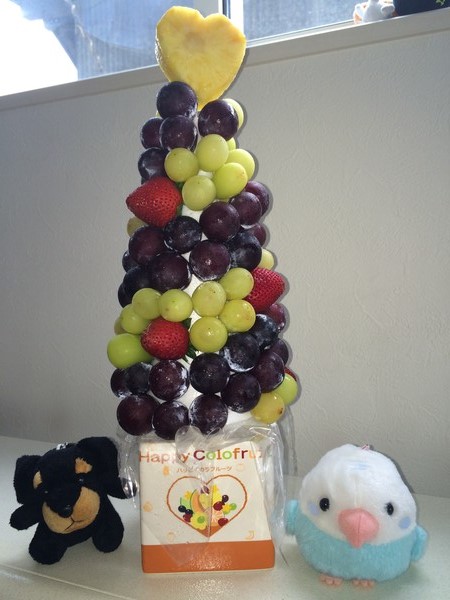 「ぶどうタワー」は種なしぶどうをたっぷり使った、季節限定の商品です。大きさは高さ約38cm、横約10cmです。ぶどうのほかに、パイナップルといちごも飾りました。
