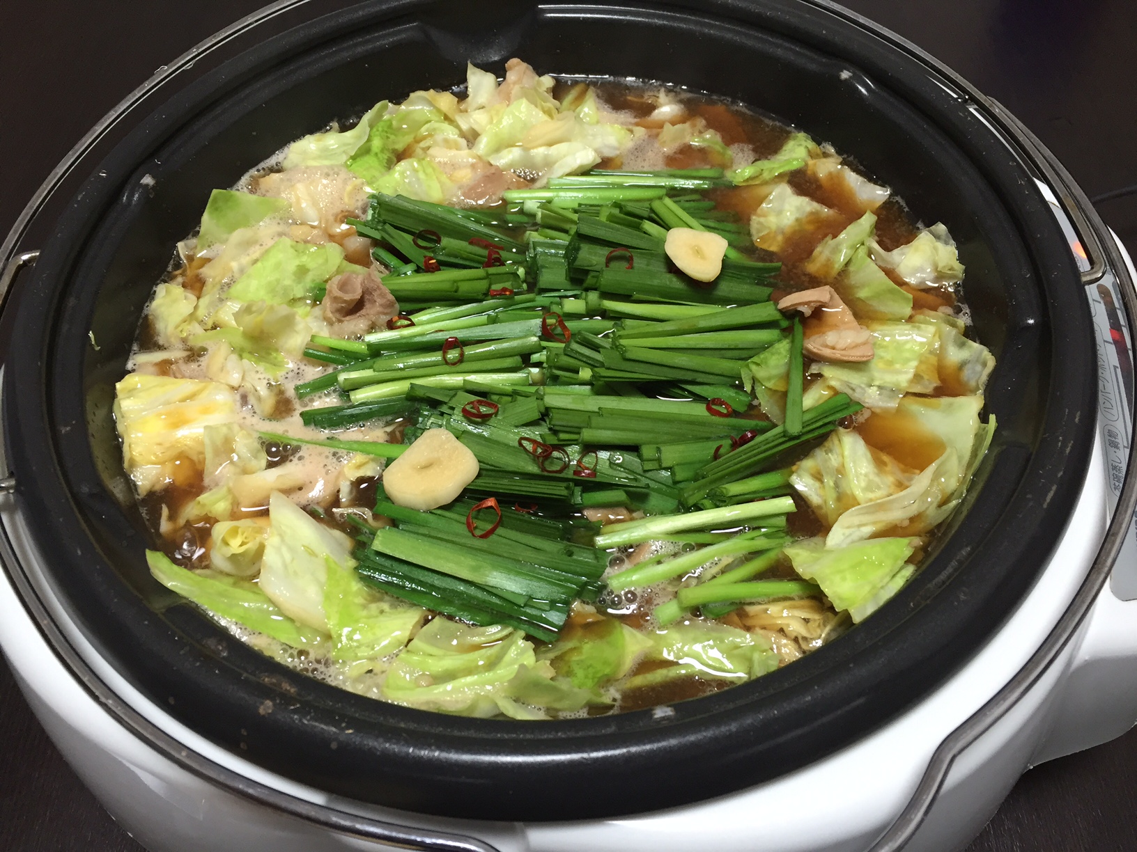 中火にし、キャベツ、ニラを一度に全部入れます。豆腐、旬のお野菜などを入れるとよりおいしい「もつ鍋」になります。
