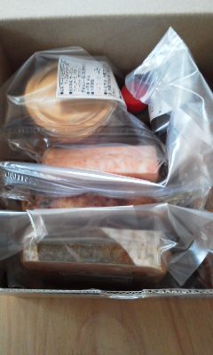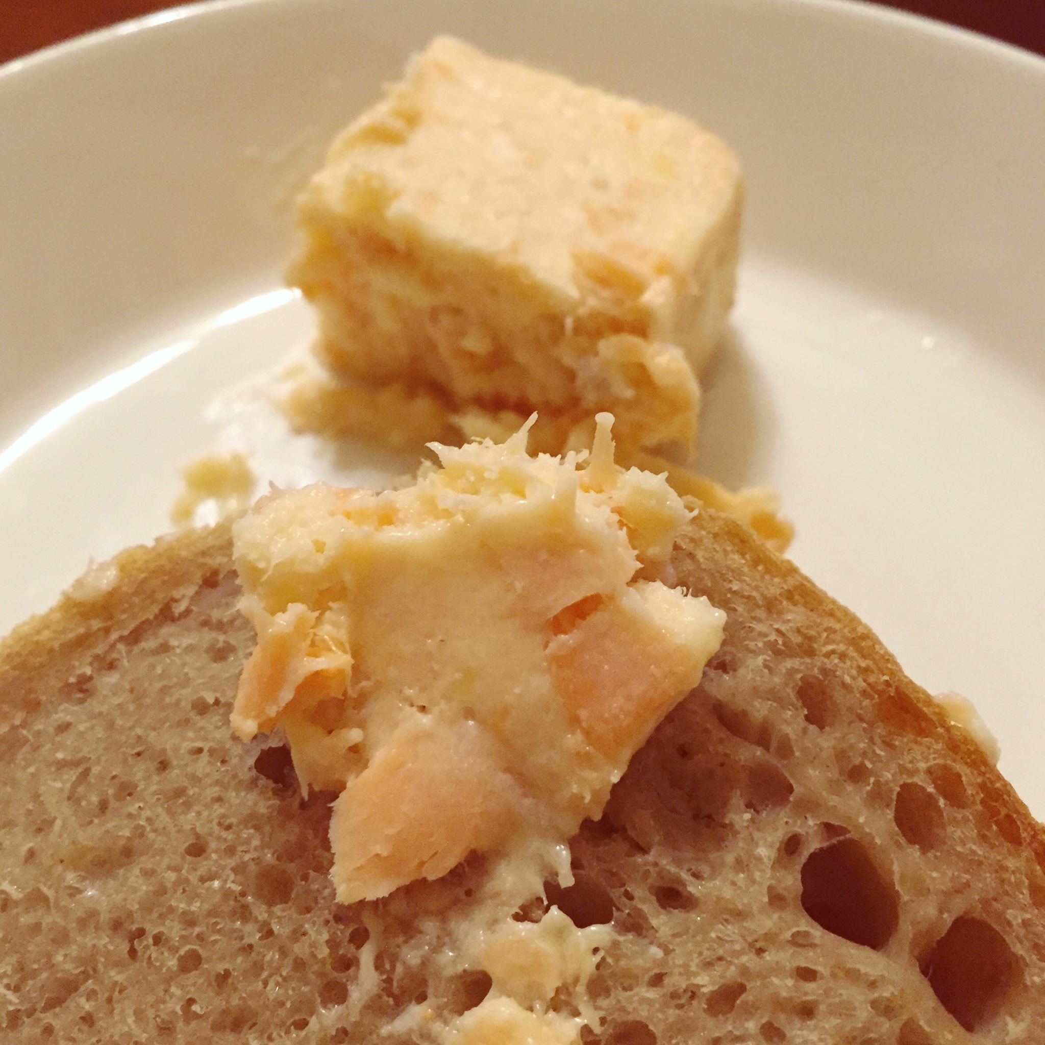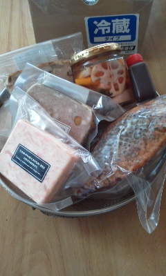 前菜の最後は、「サーモンとクリームチーズのテリーヌ」。お届けにあわせて自宅で焼いた田舎風パンに添えていただきます。サーモンのテリーヌというと、日本では不幸にも「洋風かまぼこ?」とつっこみたくなる、味も素っ気もない代物にあたることもありますが、今回のお品は、上質なバターのコクとチーズのクリーミーさ、サーモンの旨味が渾然一体となって口の中でほぐれてとろける、陶然とする味わい。こんなお惣菜がテイクアウトできるお店が近所にあったら幸せですね。
