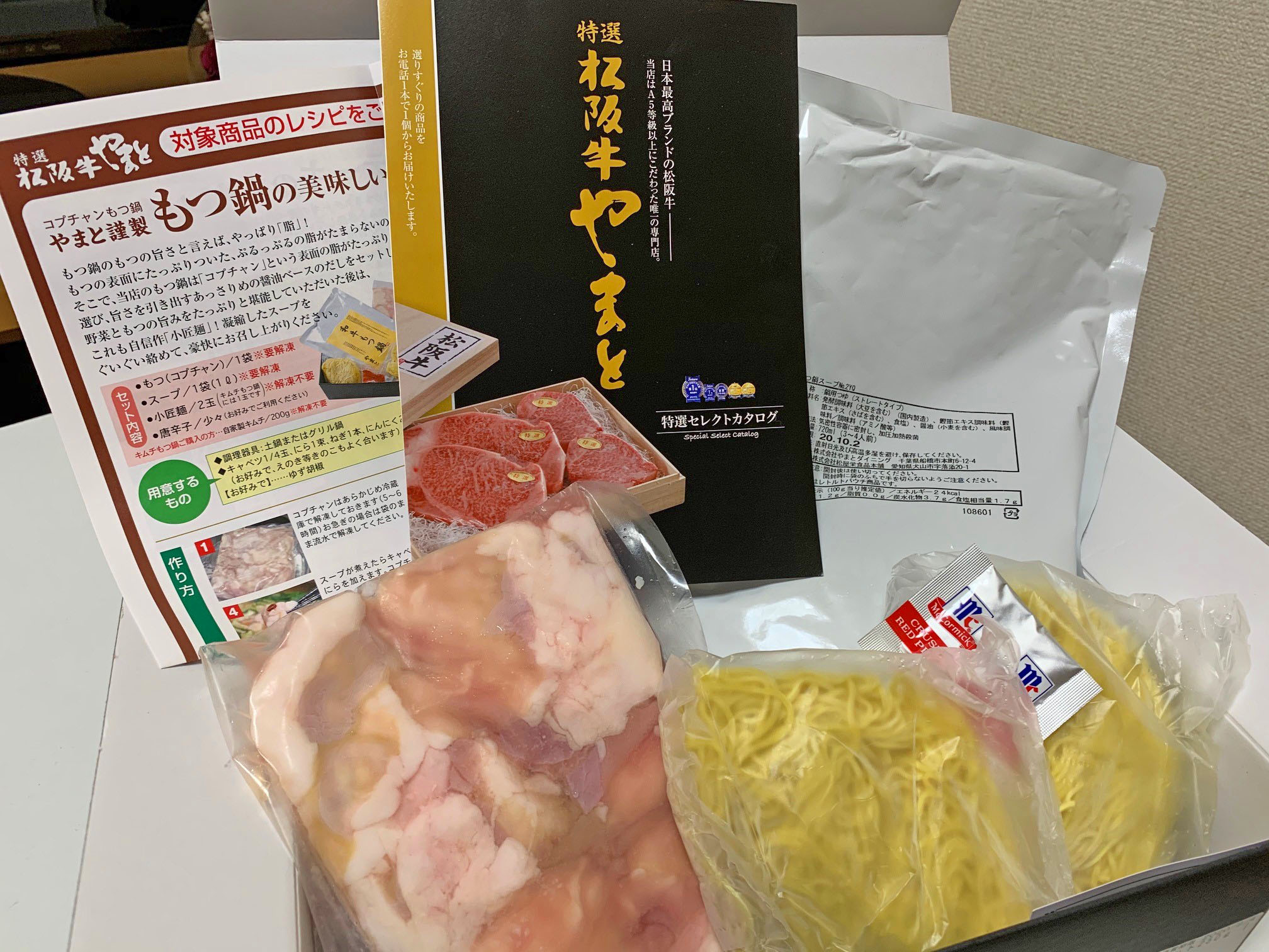 コプチャン、専用スープ、小匠麺、唐辛子の厳選した素材がセットになった、極上のもつ鍋セット。精肉店でも手に入れにくい黒毛和牛のコプチャン(小腸)の中から、脂をたっぷり持ったコプチャンを厳選。より良い肉にこだわって仕入れ続けるやまとだからこそ、味わえる良質な肉です。火が通ったコプチャンは脂がとろけてぷるっぷる。食べると甘味と旨味が広がります。上品な醤油ベースの和風スープは、コプチャンの脂を受け止め、旨味を最大限に引き出します。