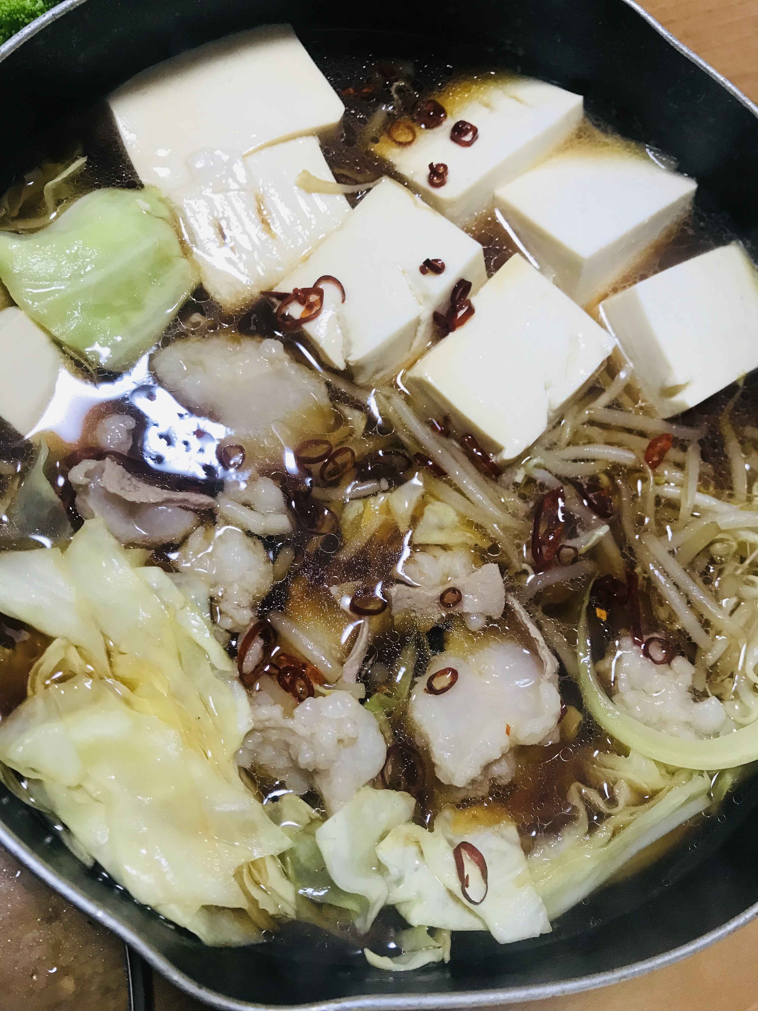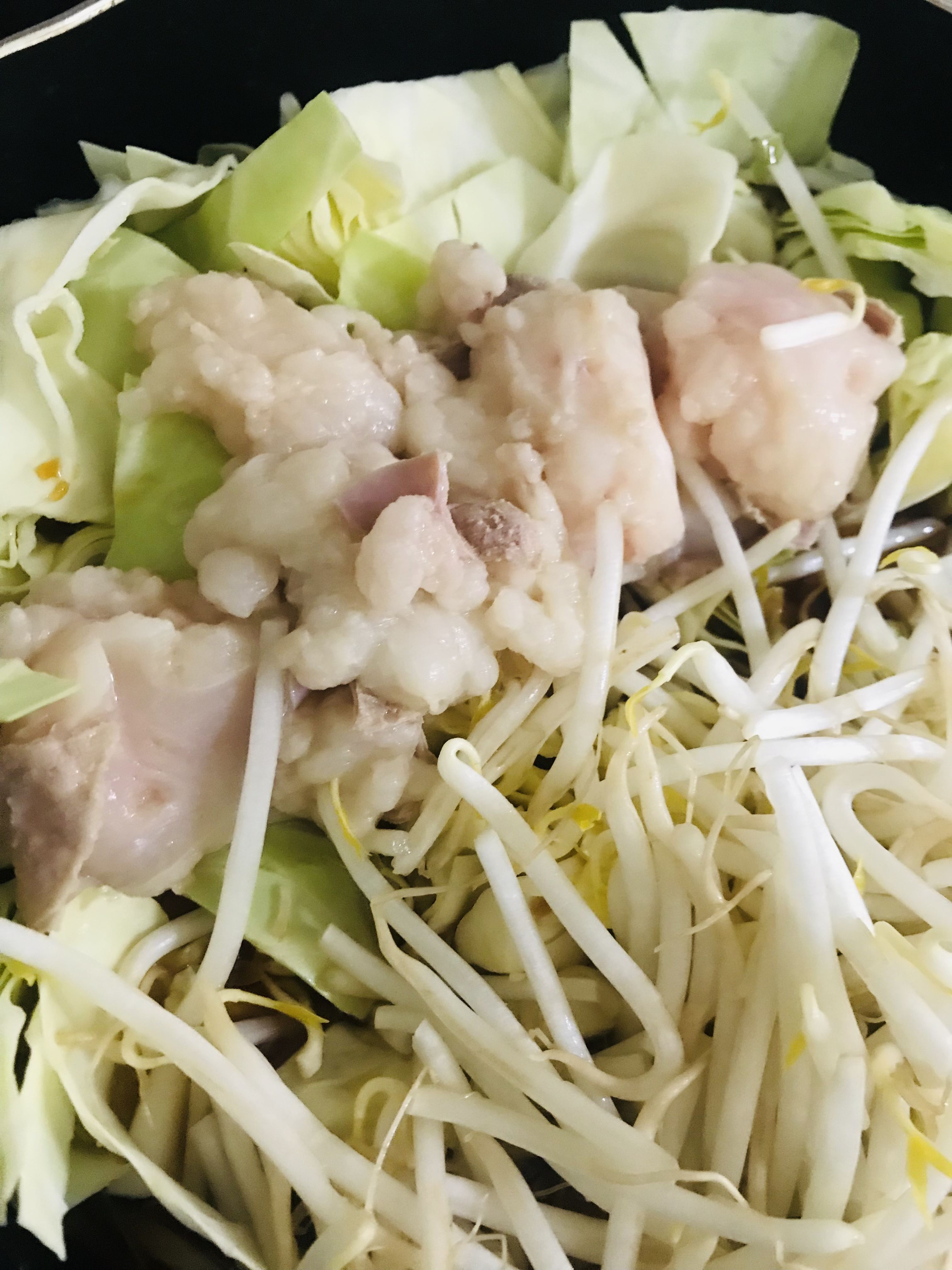 キャベツ、ニラ、もやし、豆腐、ニンニクを準備して、レシピ通りに作りました。